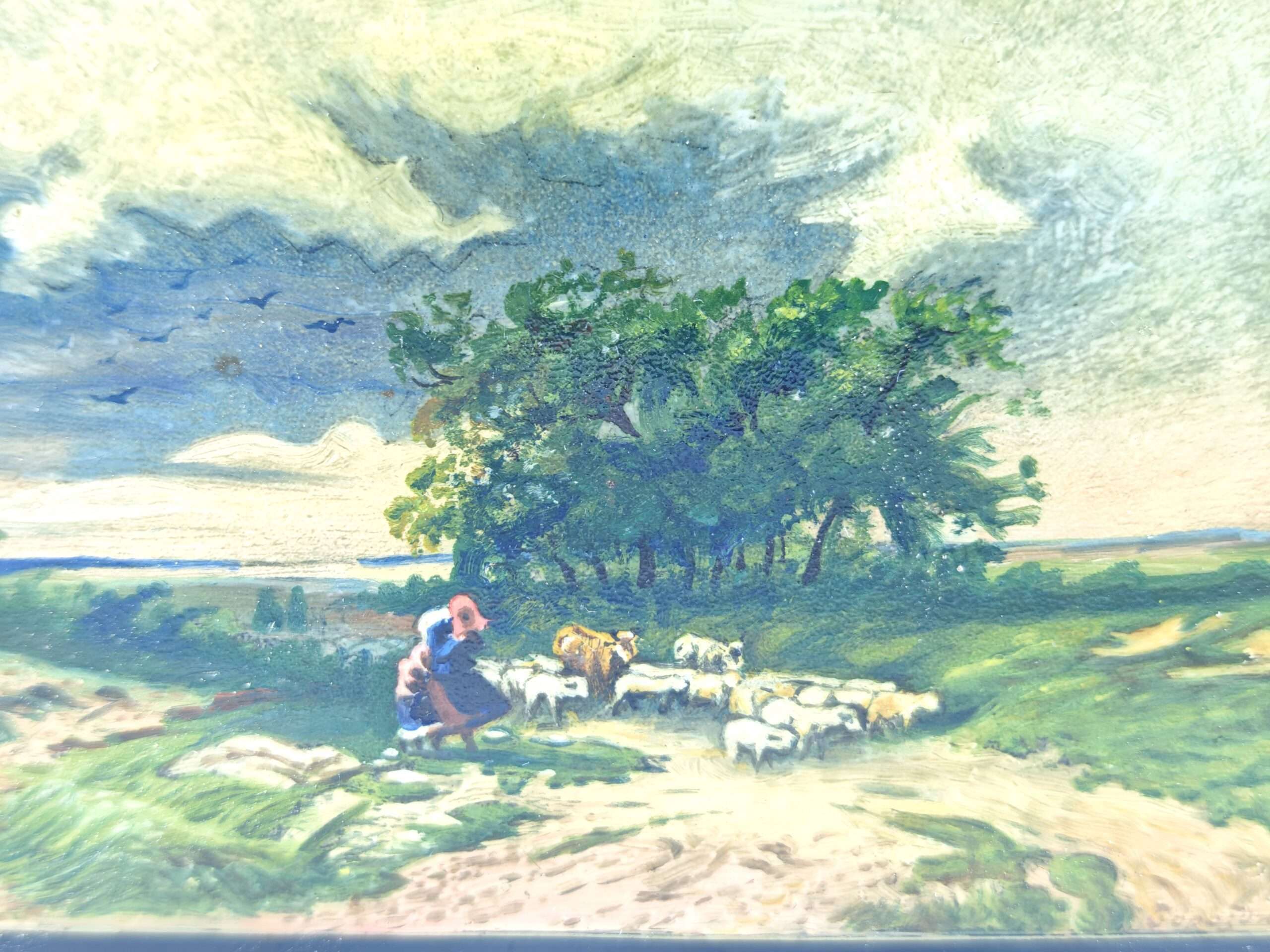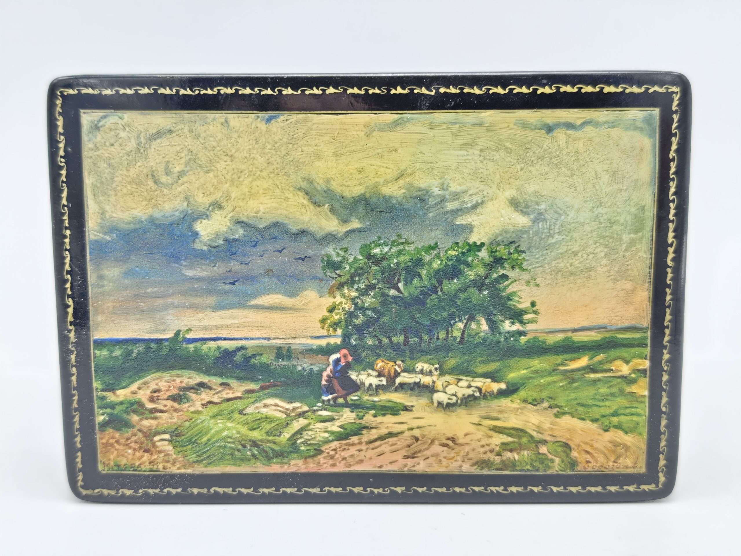 Шкатулка “Пейзаж с отарой овец. Маленькие пастухи”, лаковая роспись, автор Бороздин В. середина XX века