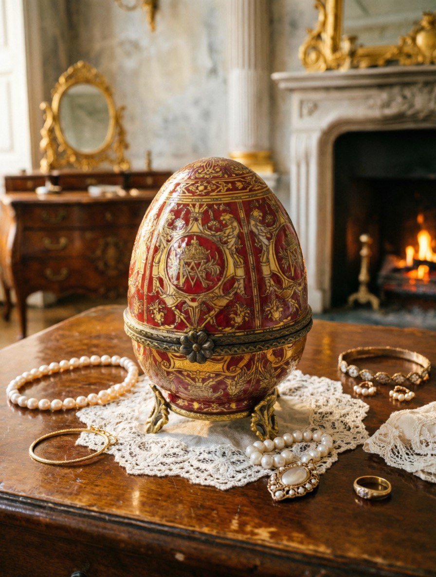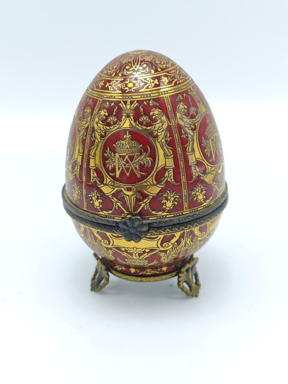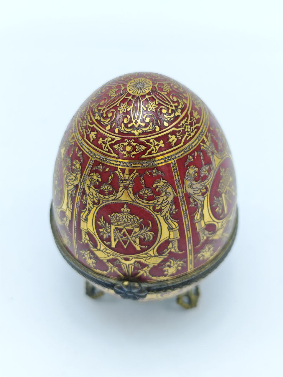 Фарфоровая шкатулка в форме яйца с роскошным золотым орнаментом на насыщенном красном фоне. Изящные металлические ножки и декоративная окантовка подчёркивают классический стиль изделия. Орнамент выполнен в императорской эстетике, что делает шкатулку выразительным интерьерным акцентом.