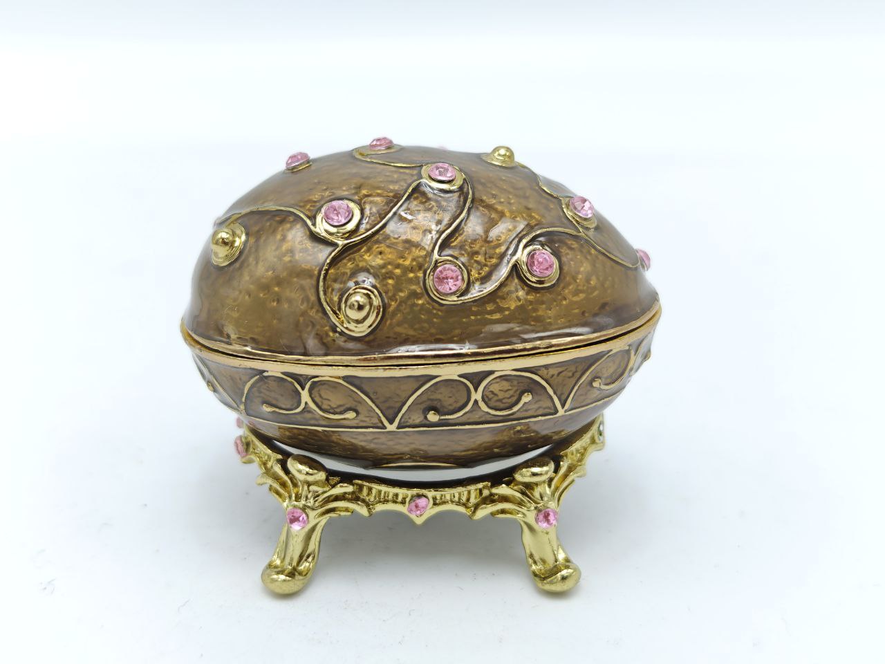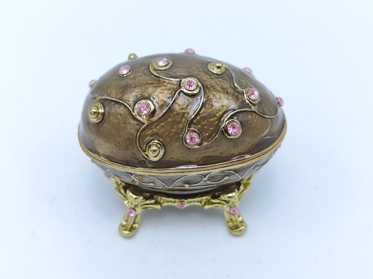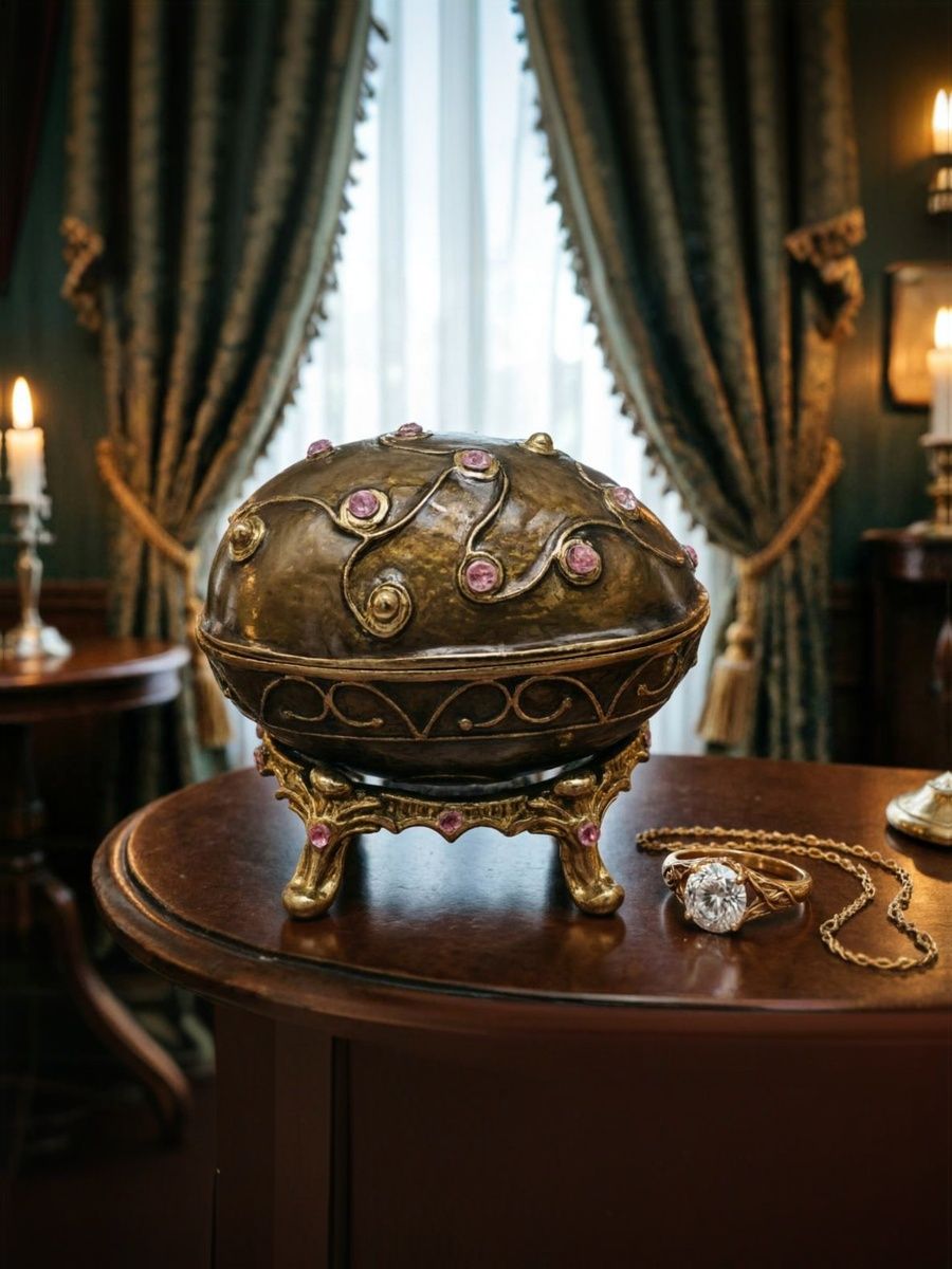 Декоративная шкатулка в стиле Фаберже с рельефной фактурной поверхностью бронзового оттенка. Корпус украшен волнообразным орнаментом и вставками из розовых искусственных камней. Установлена на изящной съёмной подставке с фигурными ножками, декорированной камнями.