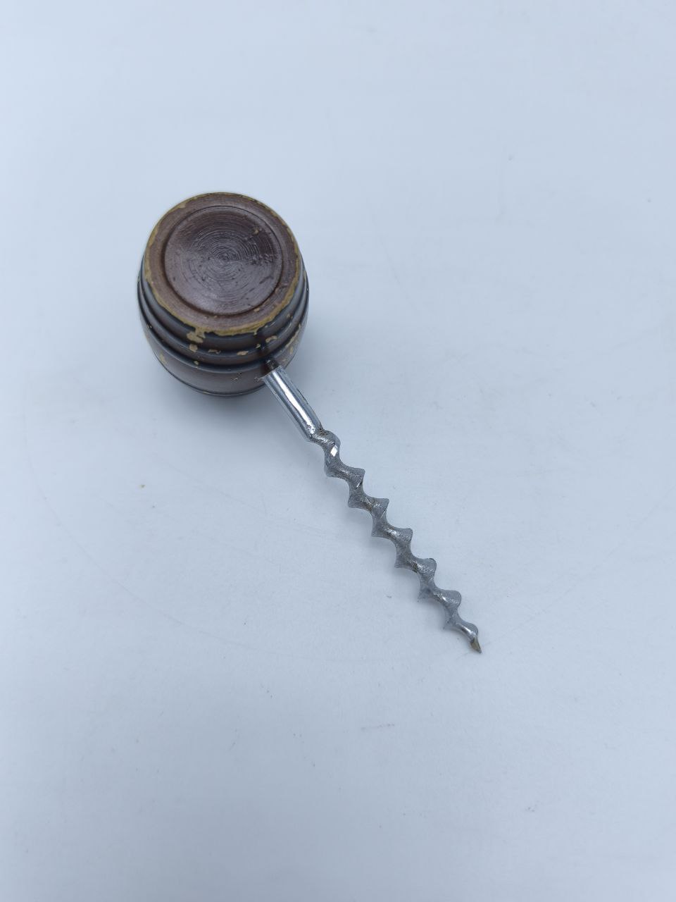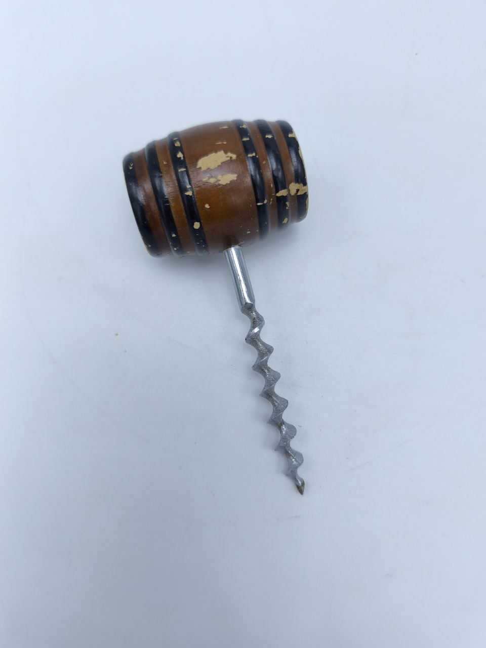 Антикварный штопор в форме миниатюрной бочки — изящный предмет с характером эпохи. Деревянная рукоять, стилизованная под винный бочонок, и прочный металлический винт создают гармонию практичности и декоративности. Такой аксессуар не только функционален, но и станет достойным украшением коллекции любителя вина или антиквариата. Изготовлен в Германии, 1950-е гг.
