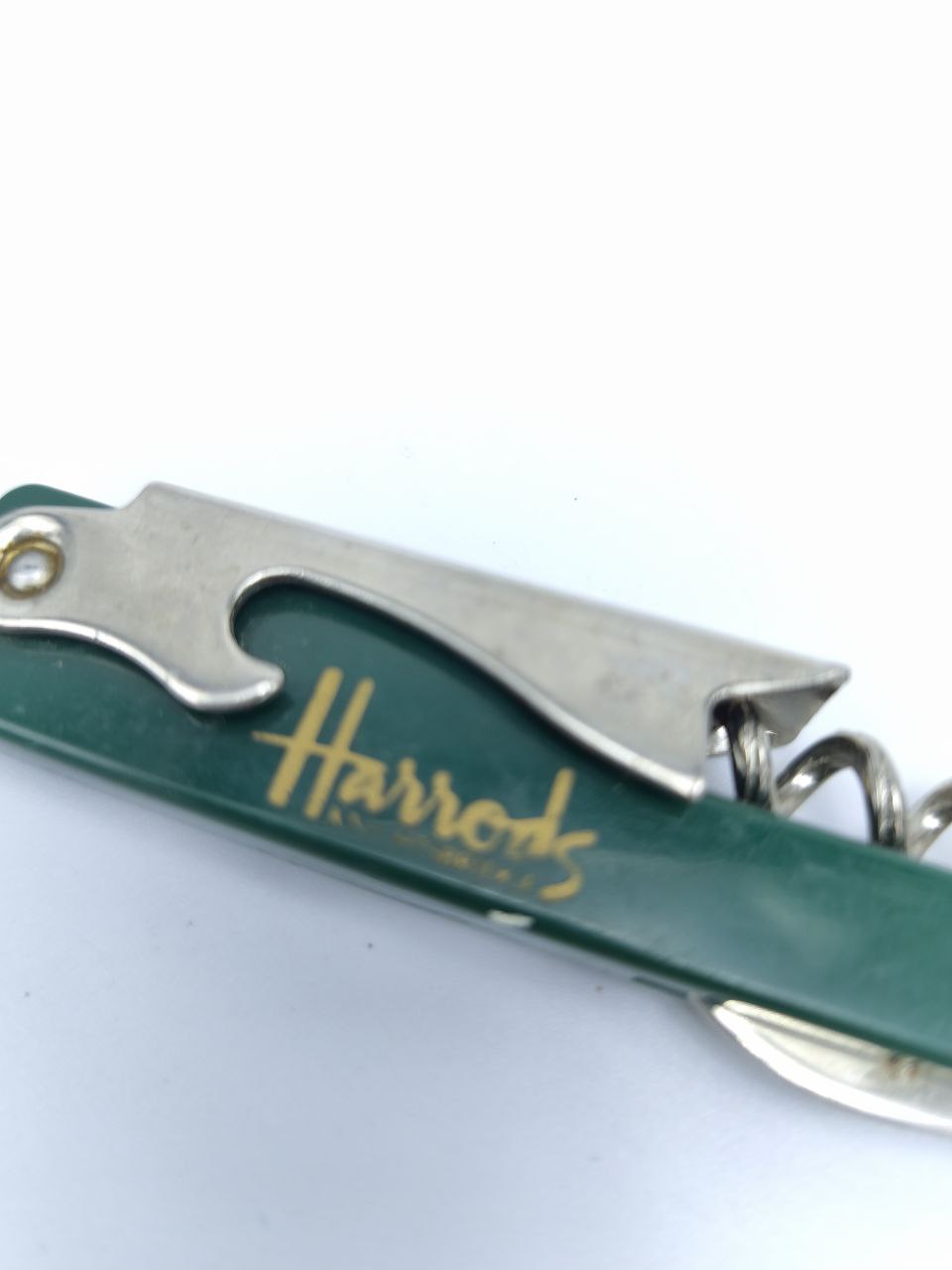Редкий коллекционный штопор с логотипом знаменитого лондонского универмага Harrods. Компактный и функциональный аксессуар сочетает штопор, нож и открывалку, сохраняя элегантный британский стиль. Изготовлен в Англии в 1980–1990-е гг. Отличный выбор для коллекционеров и ценителей винной культуры.