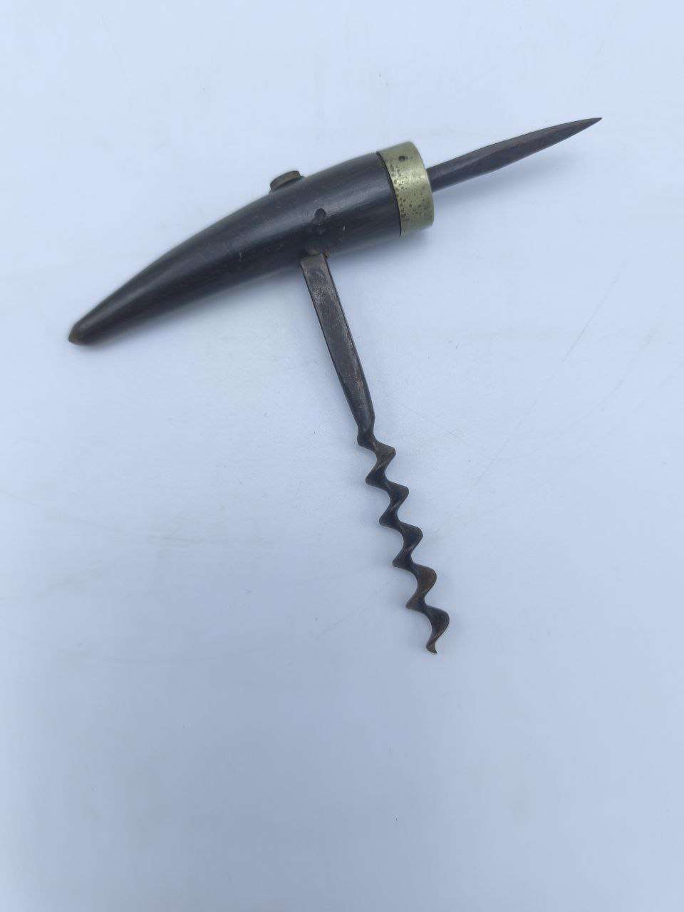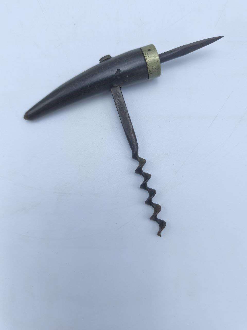 Редкий антикварный штопор середины XX века, выполненный из натурального рога с латунной вставкой. Универсальная конструкция с шилом позволяет использовать его не только для открывания бутылок, но и как инструмент для винных пробок и упаковки. Теплая патина на металле и естественная текстура рога подчеркивают возраст и подлинность изделия. Коллекционный предмет для ценителей старинных аксессуаров и винной культуры.