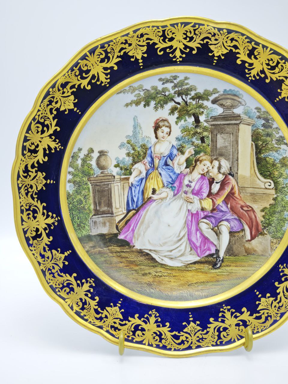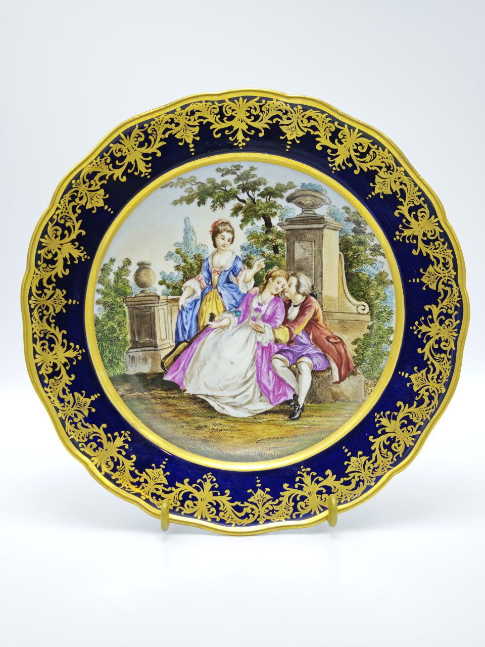 Шедевр старейшей фарфоровой мануфактуры Европы Тарелка от легендарного бренда Meissen (основан в 1710 году) — настоящий артефакт эпохи Просвещения. Изготовлена из премиального фарфора с ручной росписью и золотыми деталями. Центральная сцена с изображением аристократов в парке, обрамленная синим фоном и золотым орнаментом, передает атмосферу элегантности и роскоши XVIII века. Каждая линия росписи, синий крестик на оборотной стороне и позолота подчеркивают подлинность и историческую ценность.