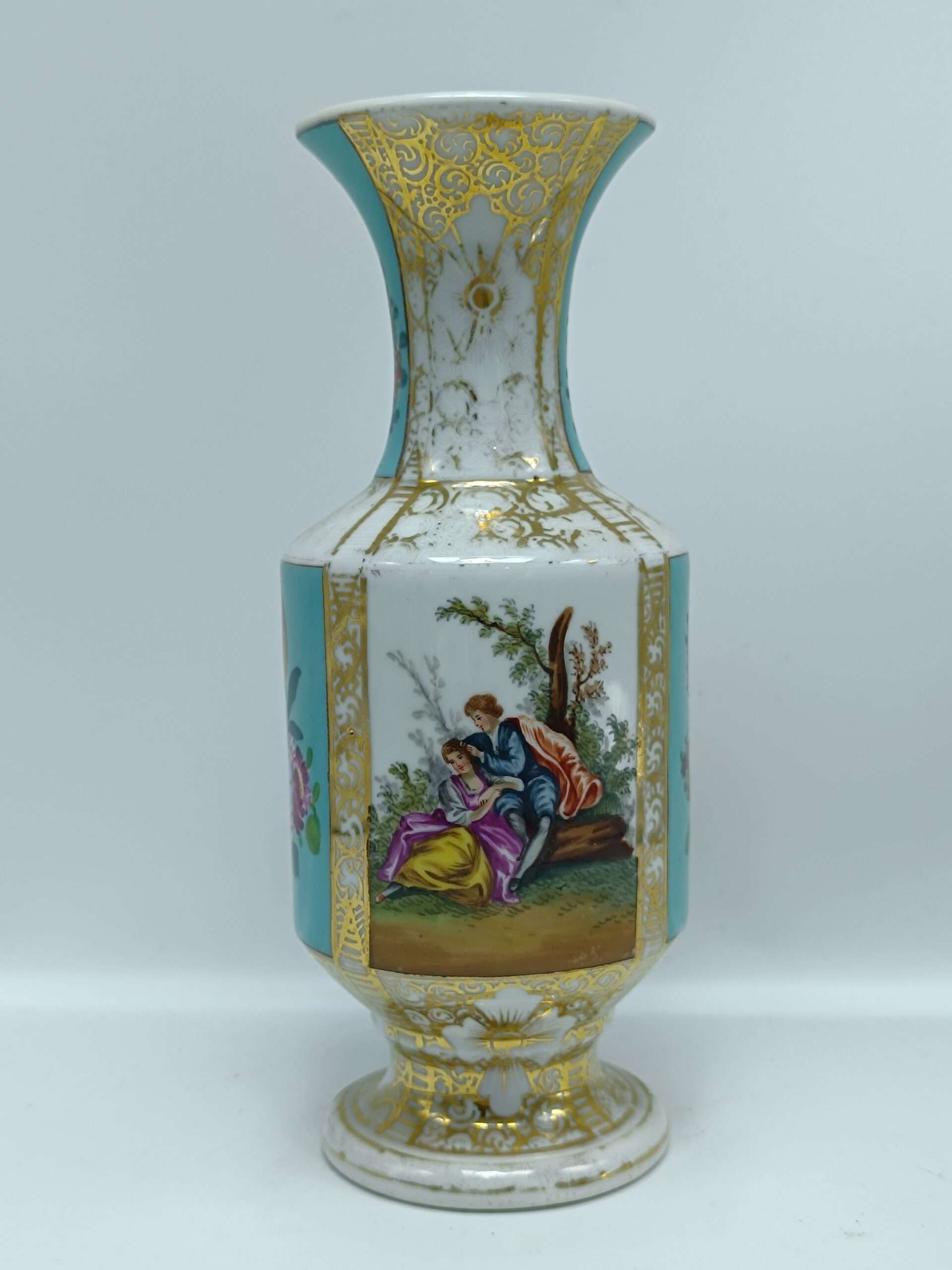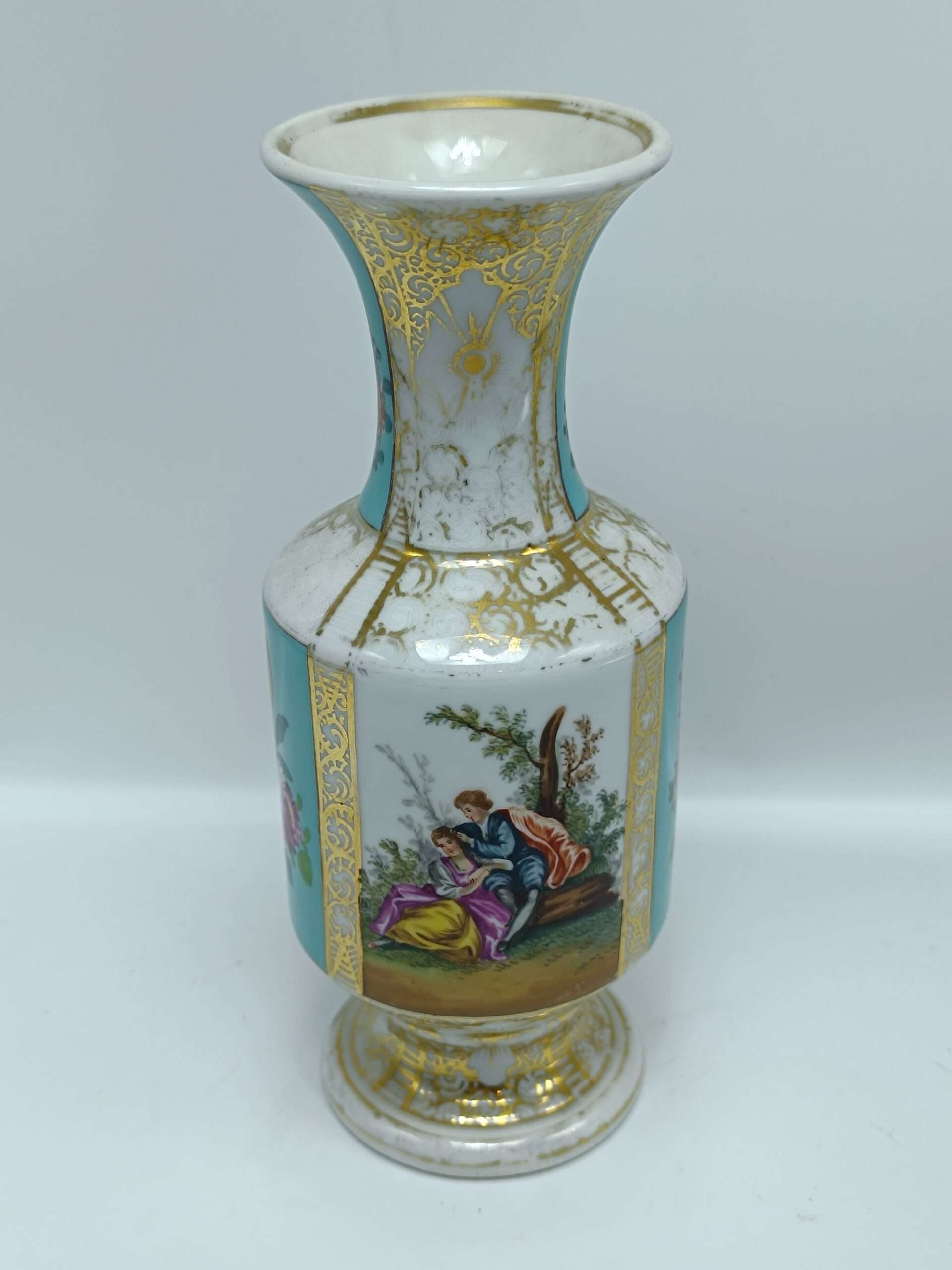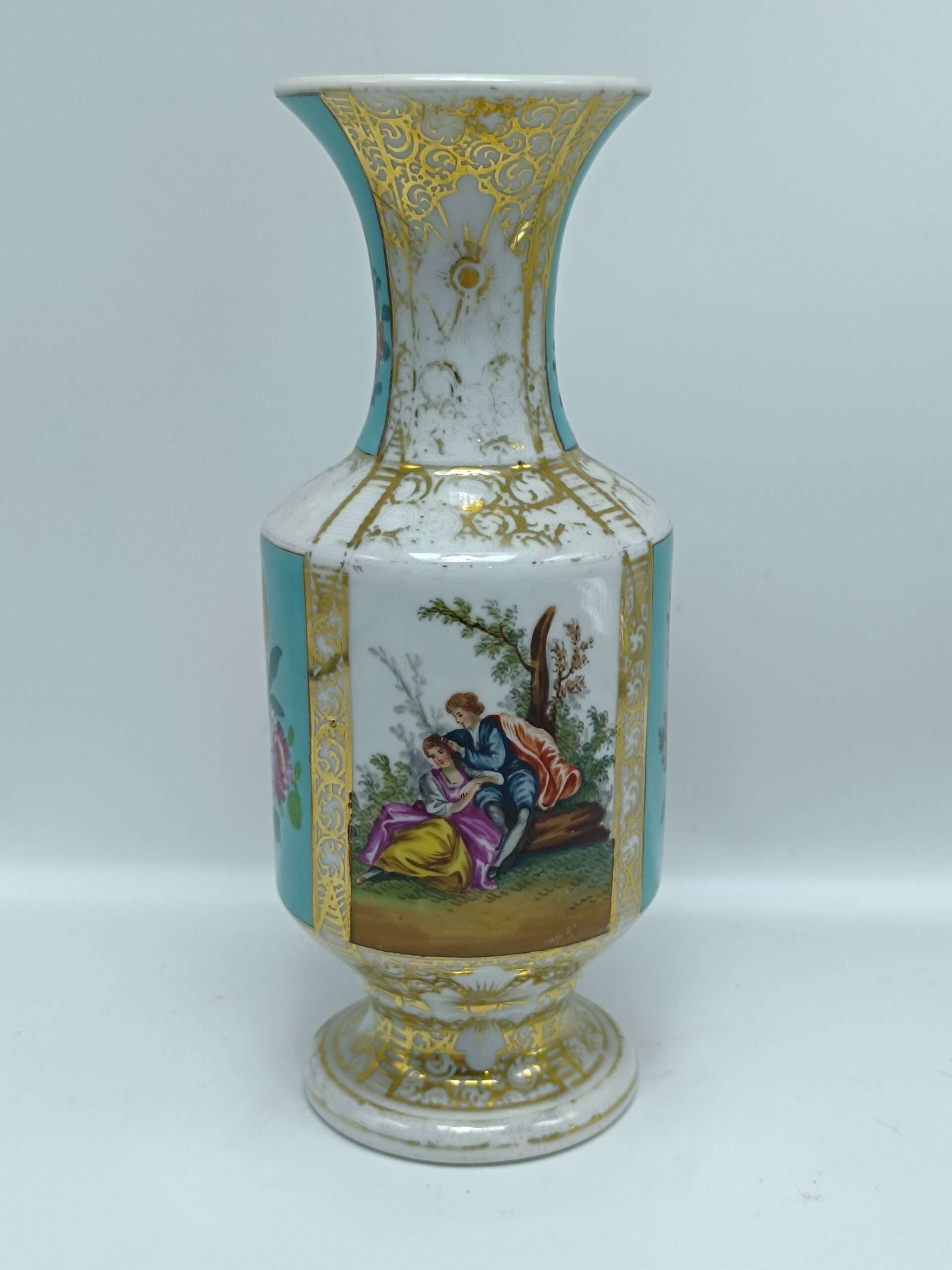 Старинная фарфоровая ваза “Влюбленные”. Позолота. Европа Высота 20.5 см Сохранность хорошая, есть сход позолоты