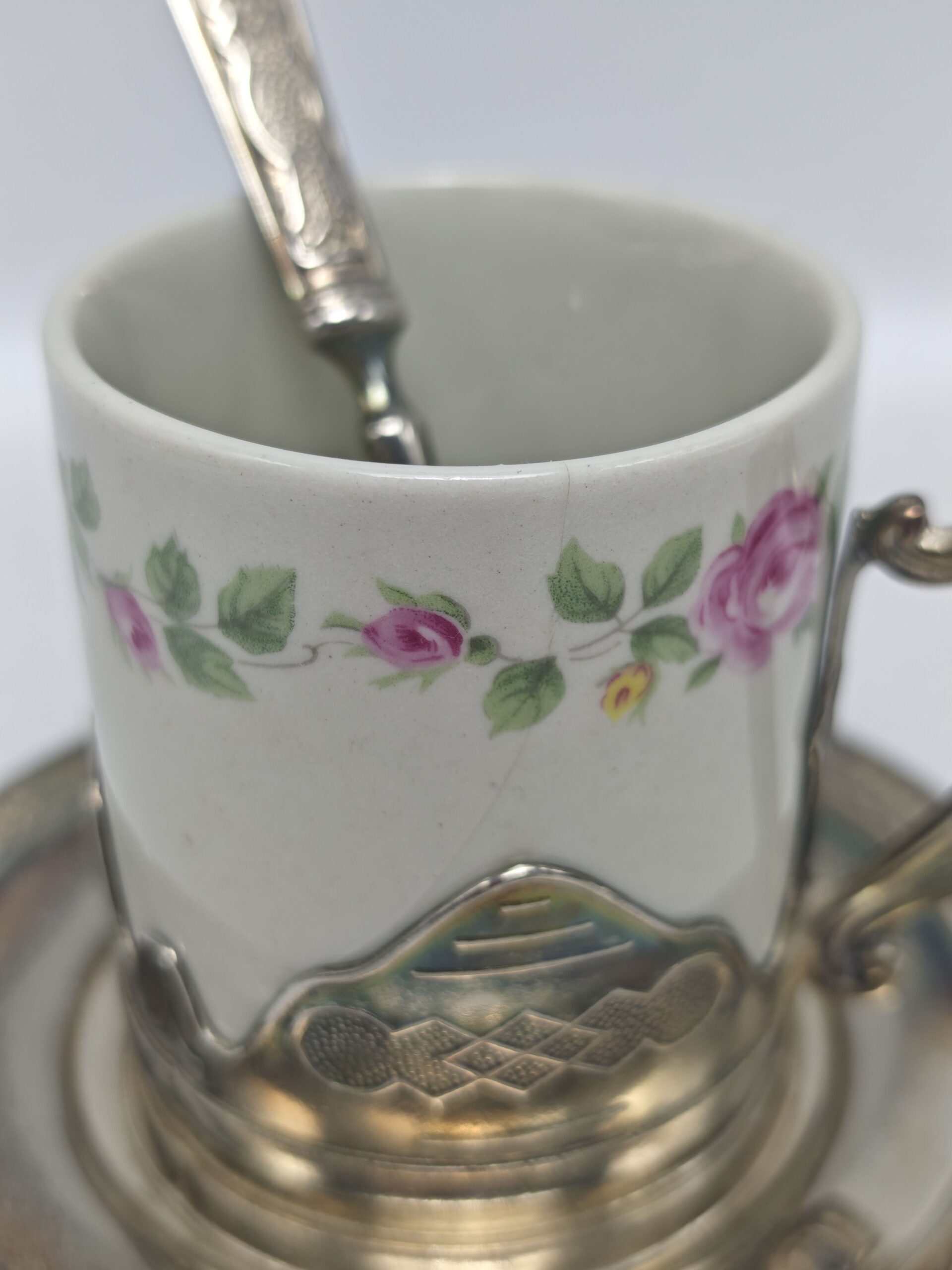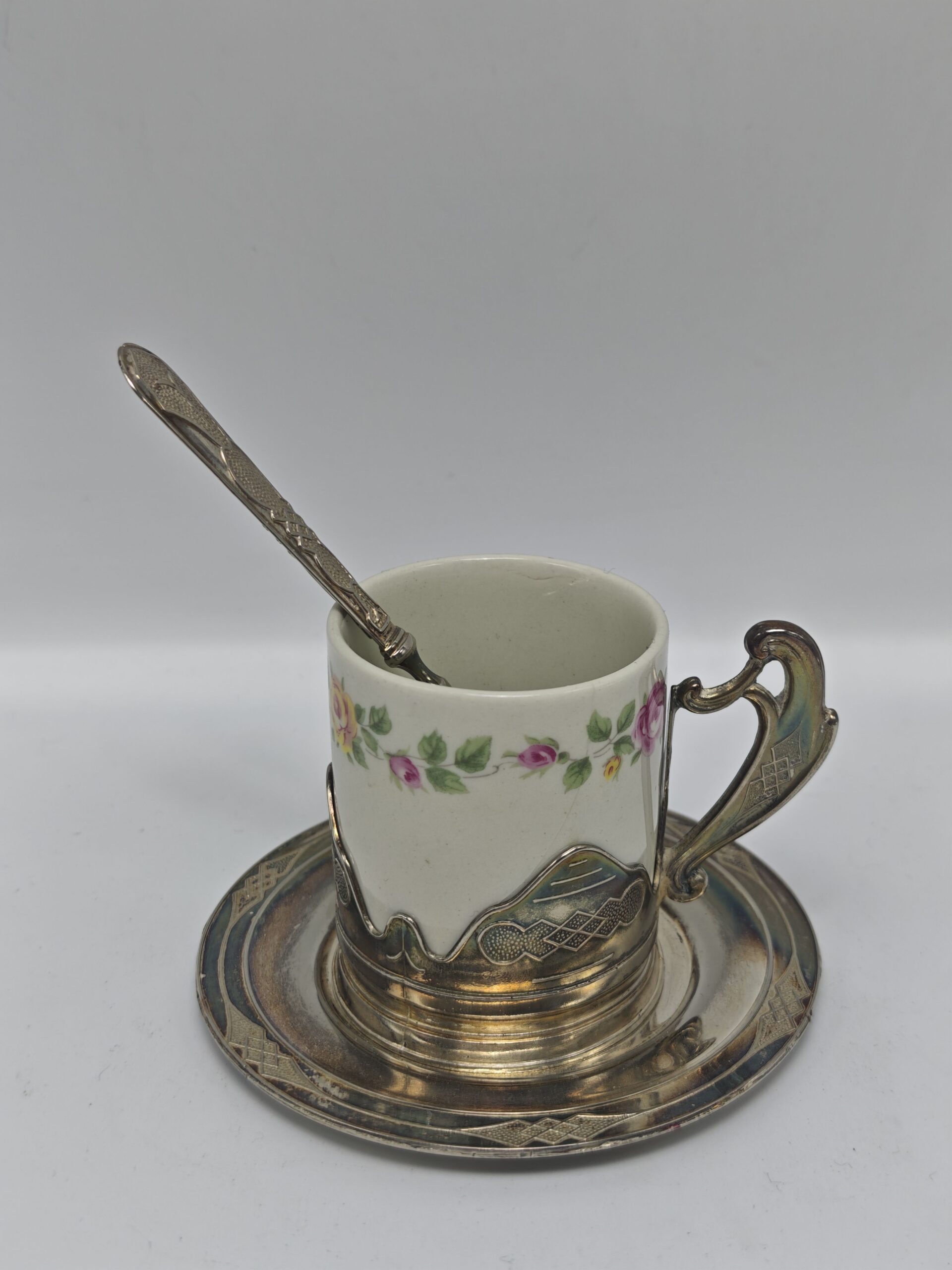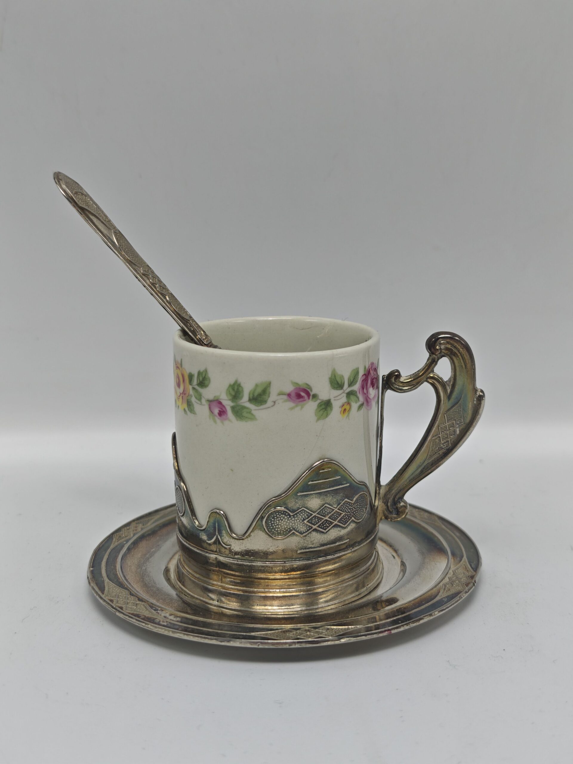 Старинная коллекционная кофейная пара с ложкой. Фарфор. Серебро 800 пробы. Германия