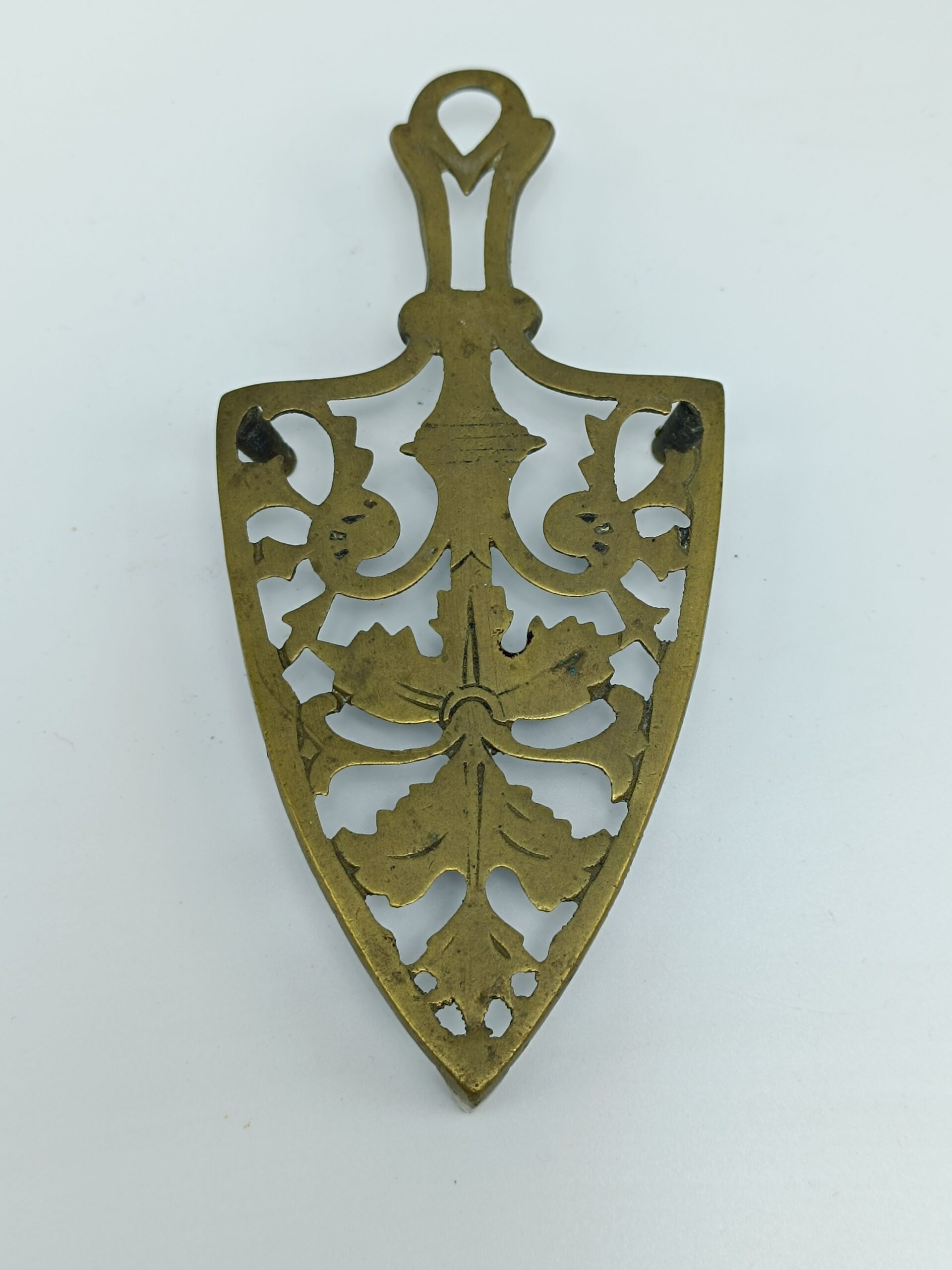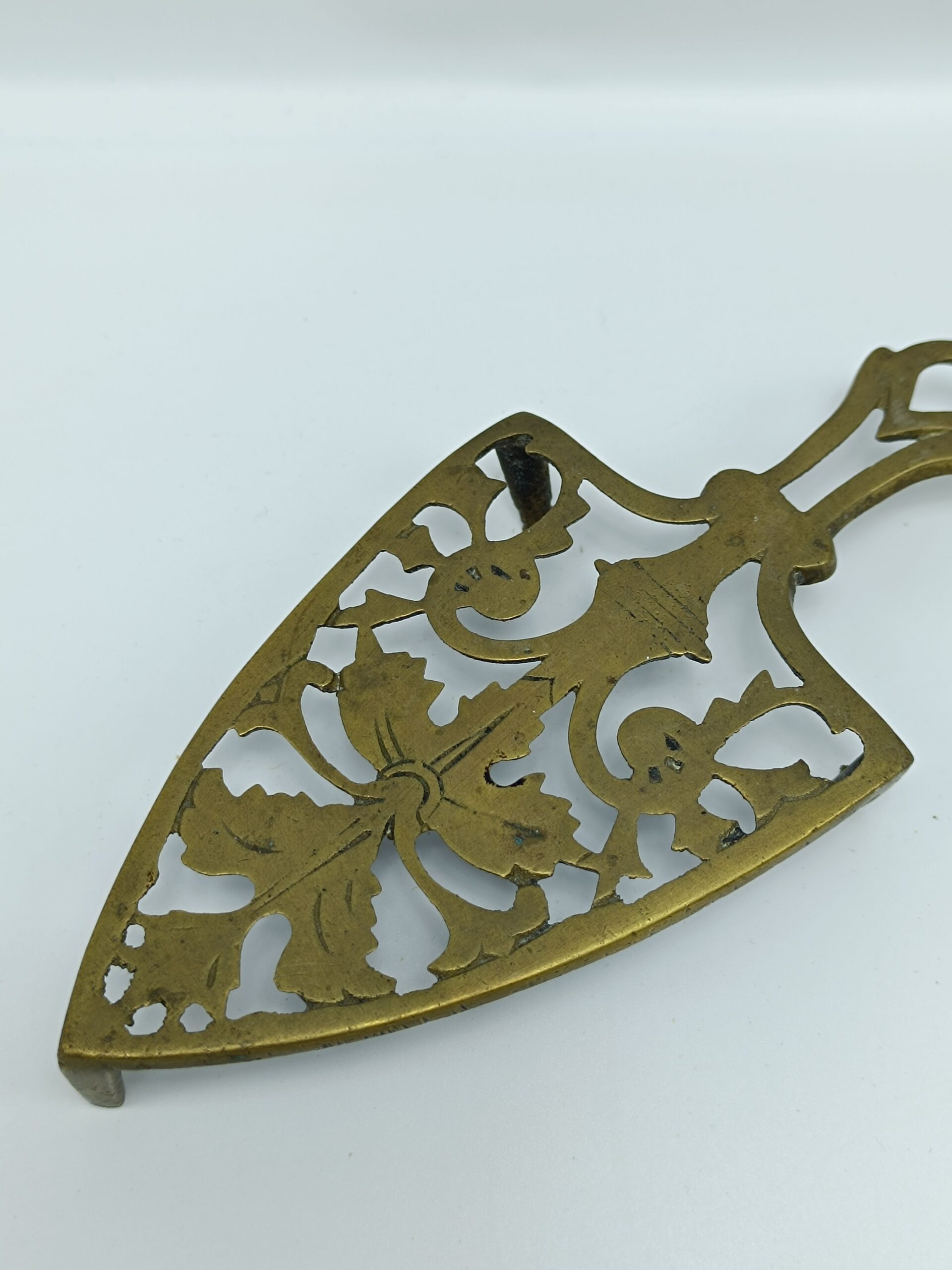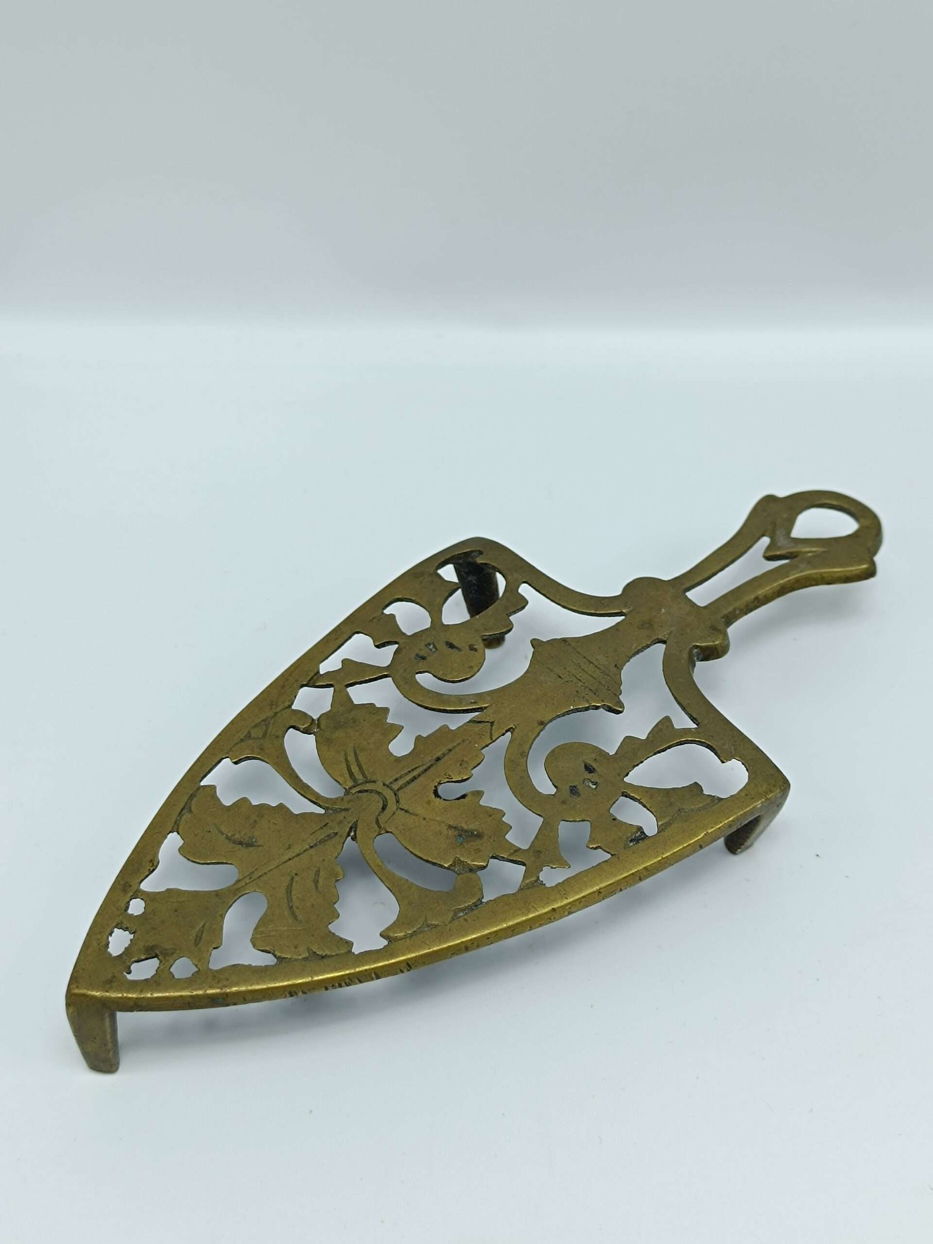 Антикварная латунная подставка под горячую посуду, утюг или чайник. Единое литьё с витиеватым цветочным узором. Создана в Европе в 20 веке. Имеет треугольную форму, стоит на трёх ножках. Старинная подставка в прекрасном коллекционном состоянии. Может применяться в быту