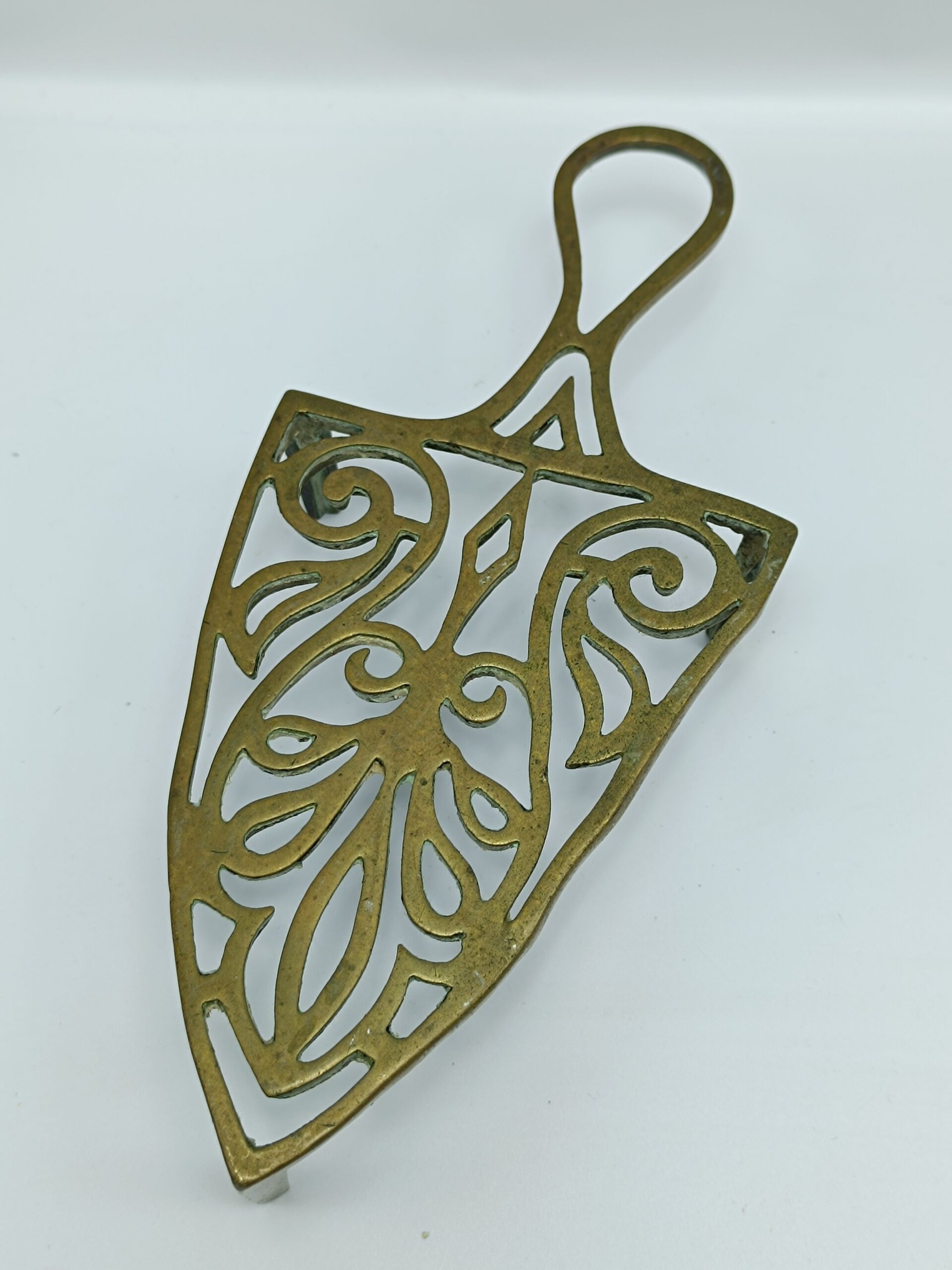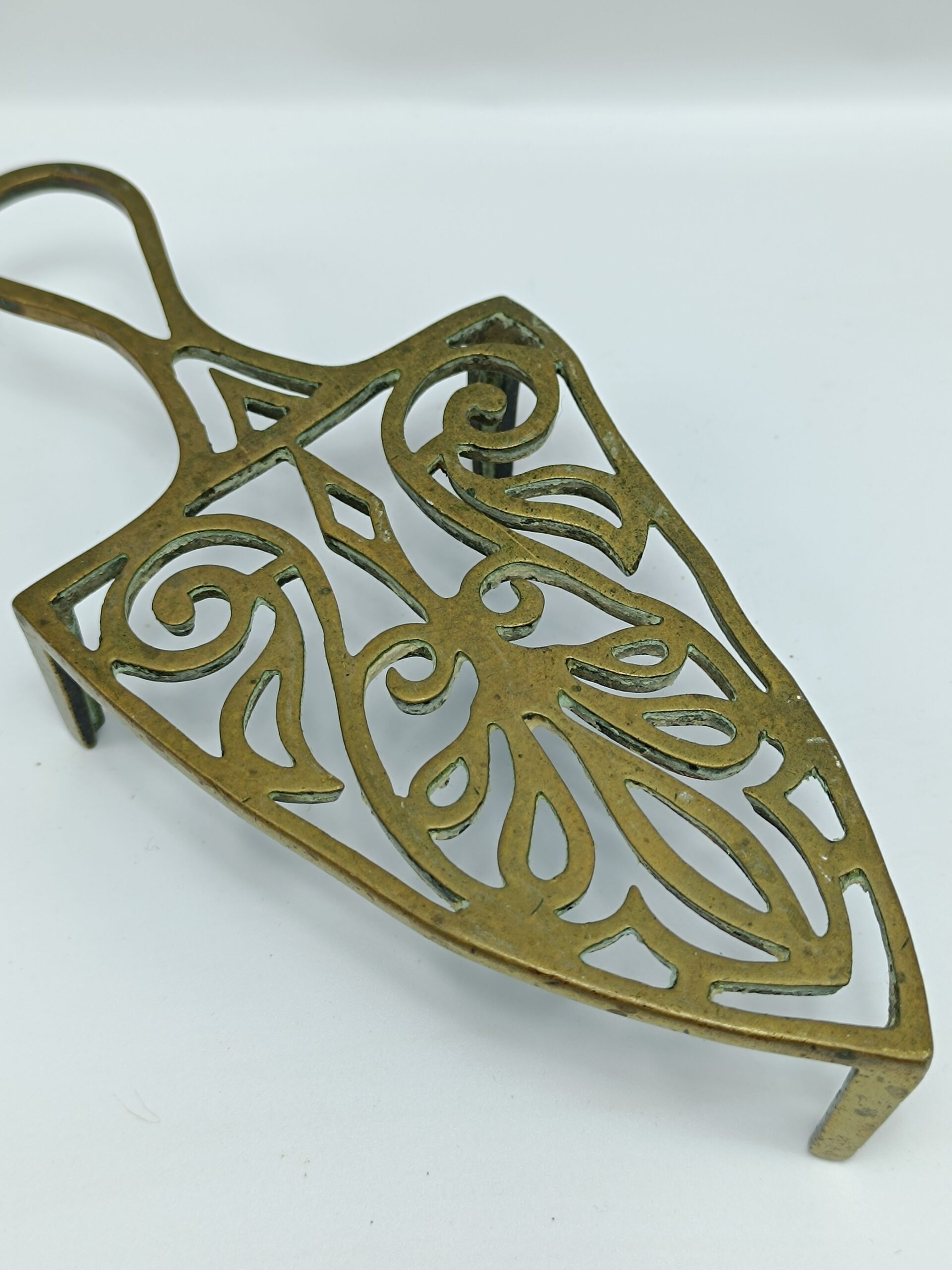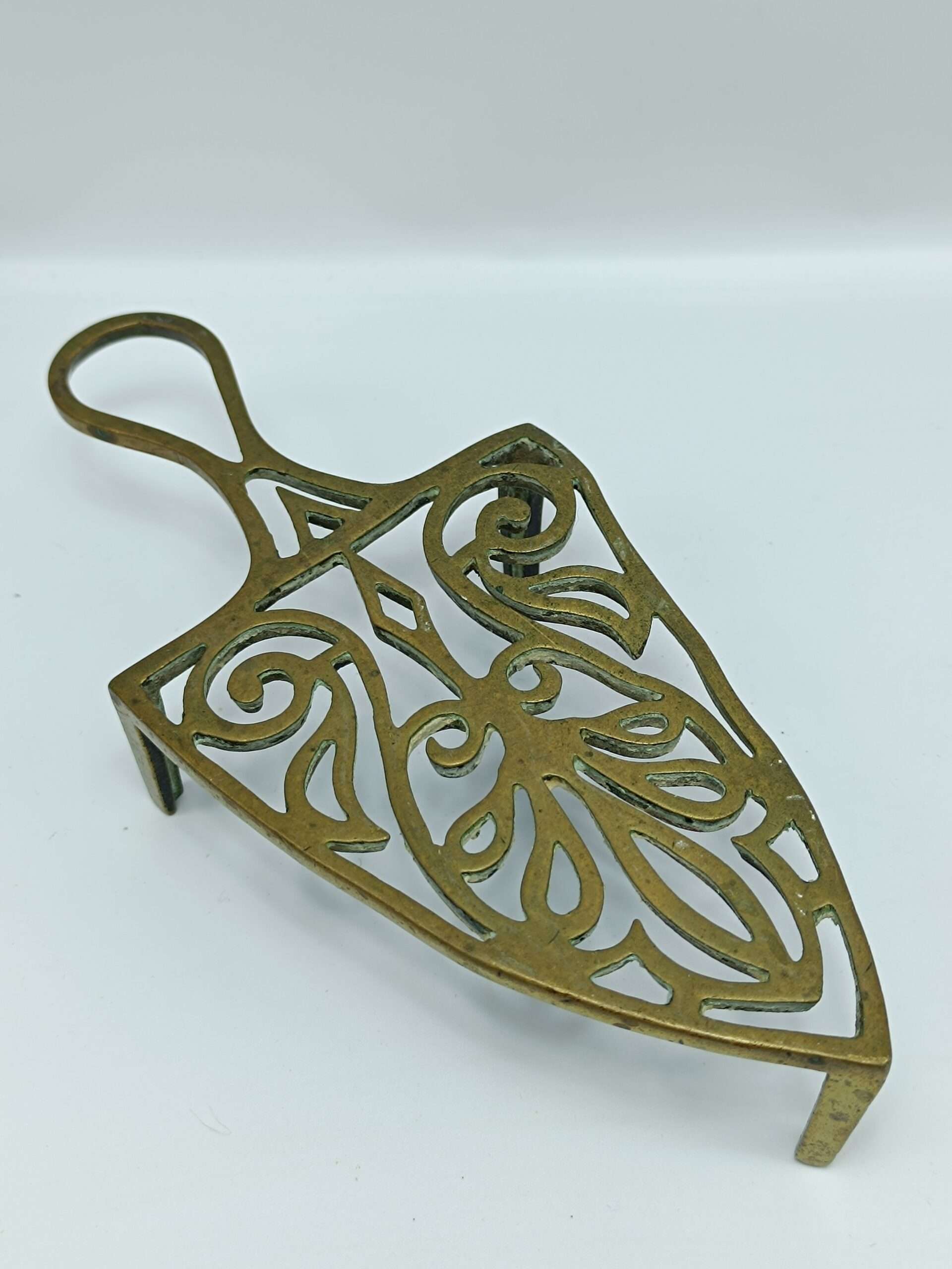 Антикварная латунная подставка под горячую посуду, утюг или чайник. Единое литьё с витиеватым цветочным узором. Создана в Европе в 20 веке. Имеет треугольную форму, стоит на трёх ножках. Старинная подставка в прекрасном коллекционном состоянии. Может применяться в бытуРазмер 23.5х10х4 см