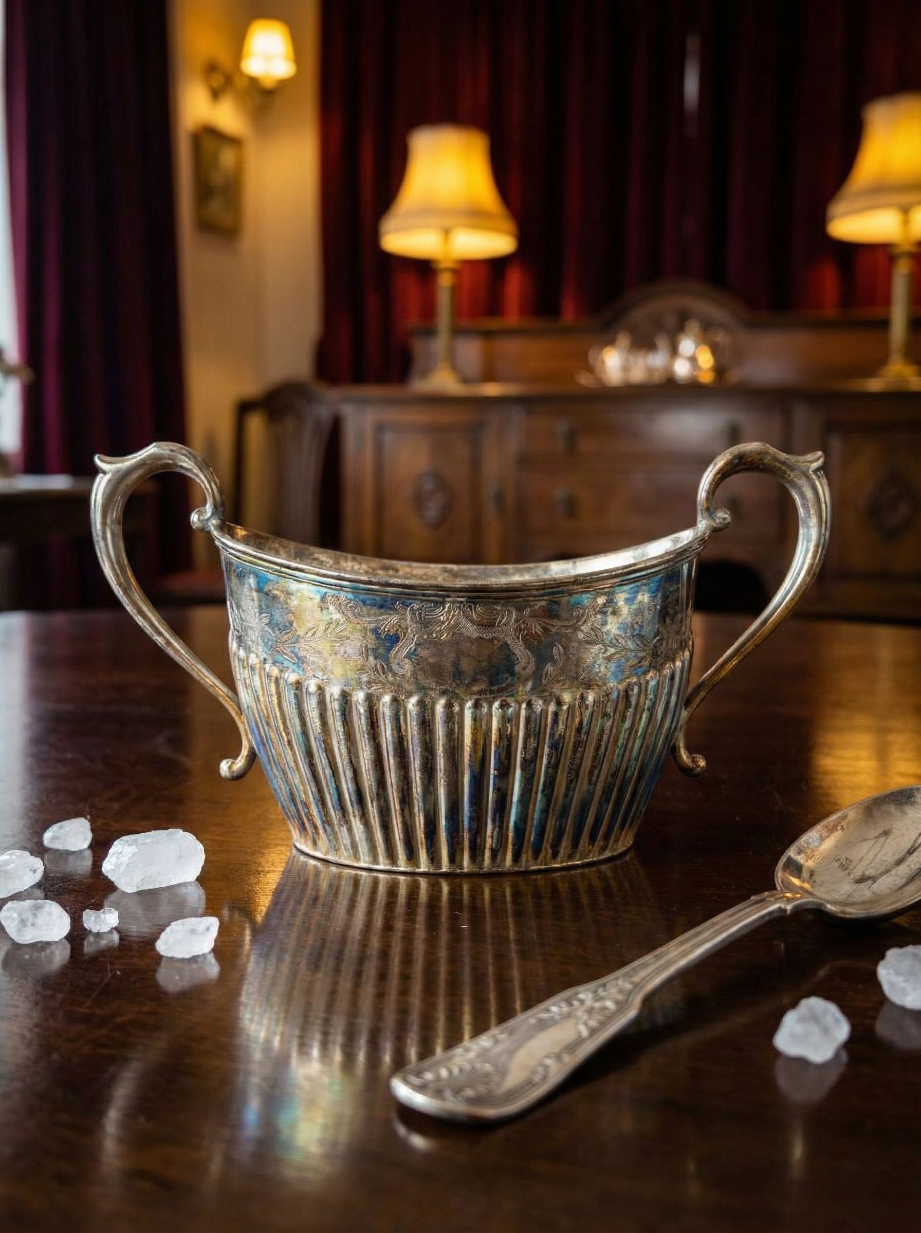 Старинная посеребрённая сахарница произведена в Англии в 1925 году. Корпус выполнен с вертикальным рифлением и декоративным орнаментом по верхнему борту, изящные симметричные ручки подчёркивают классическую форму. Размер изделия 20×11×10 см, вес 215 г. Внутри и по поверхности присутствует естественная патина и следы времени, характерные для предметов первой половины XX века. Выразительная фактура серебрения придаёт предмету глубину и благородный характер в сервировке.