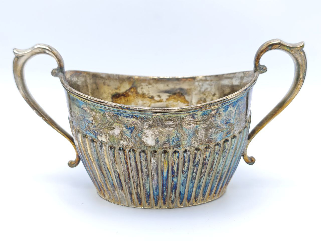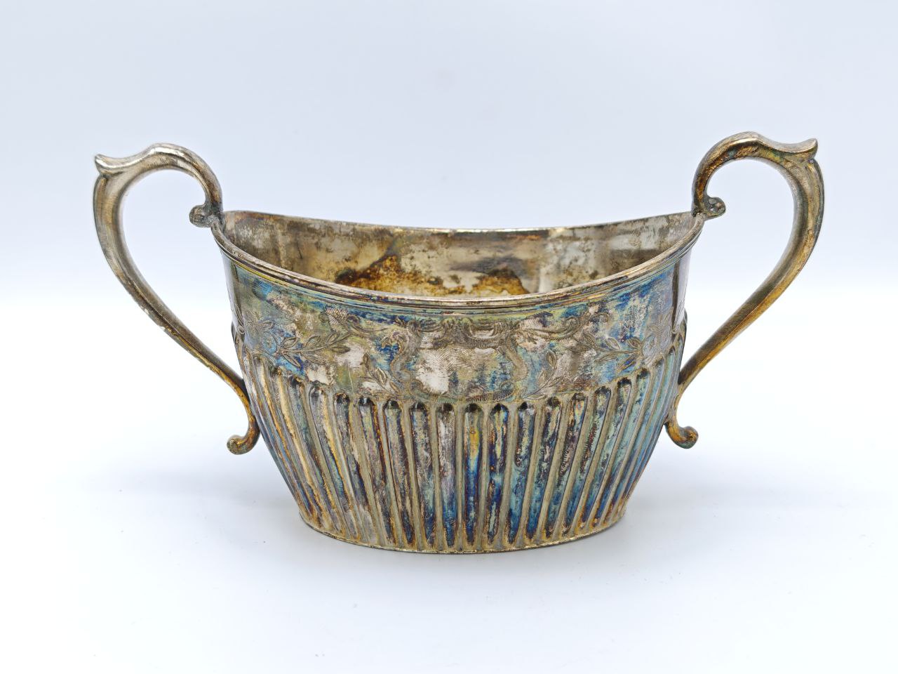 Старинная посеребрённая сахарница с ажурными ручками и рифлёным корпусом, Англия 1925 год