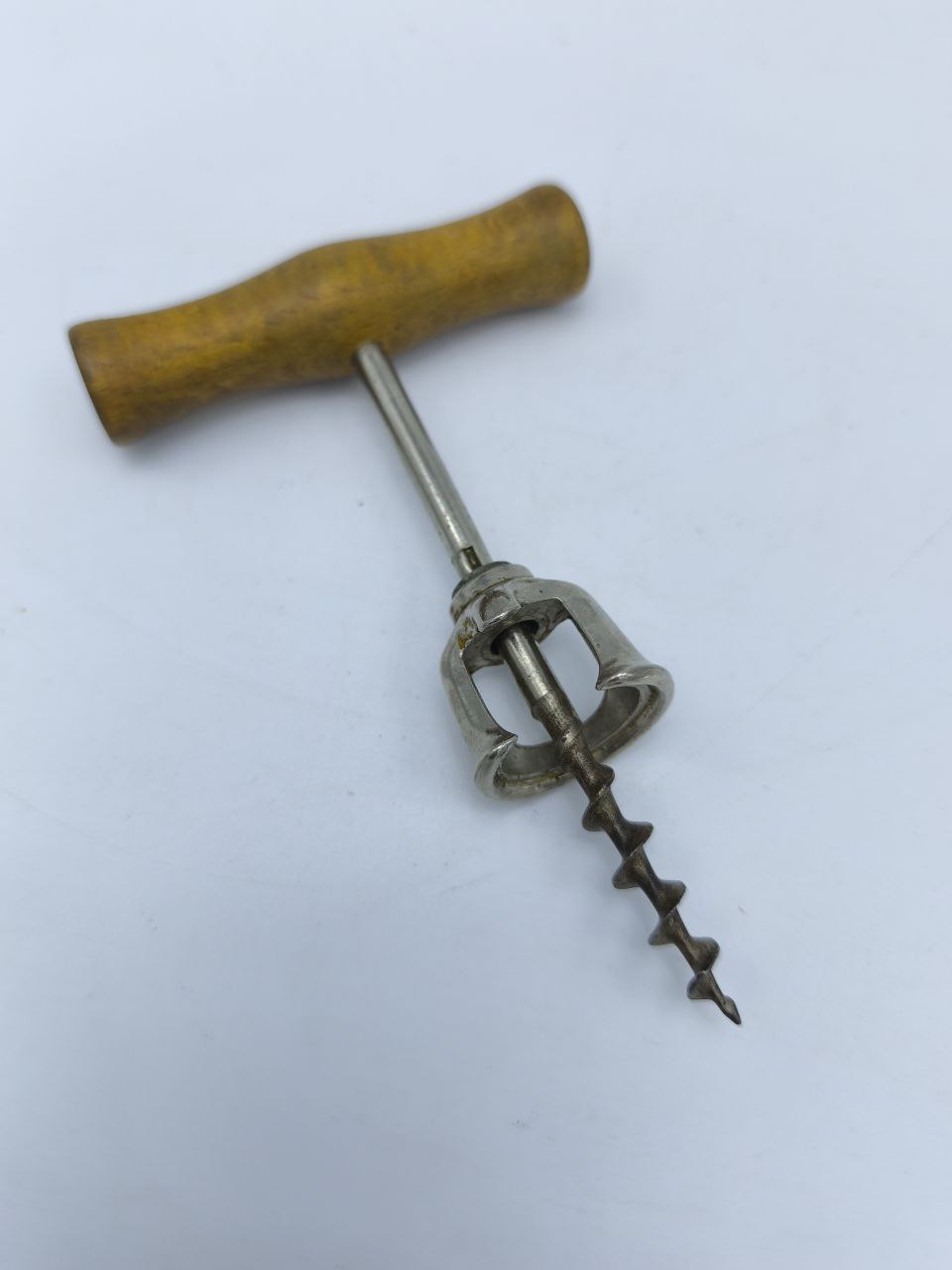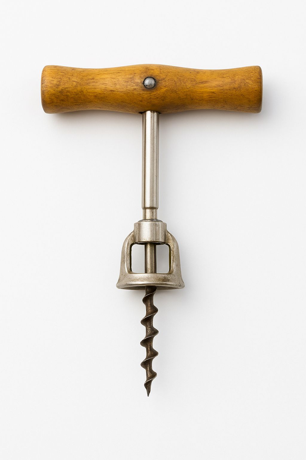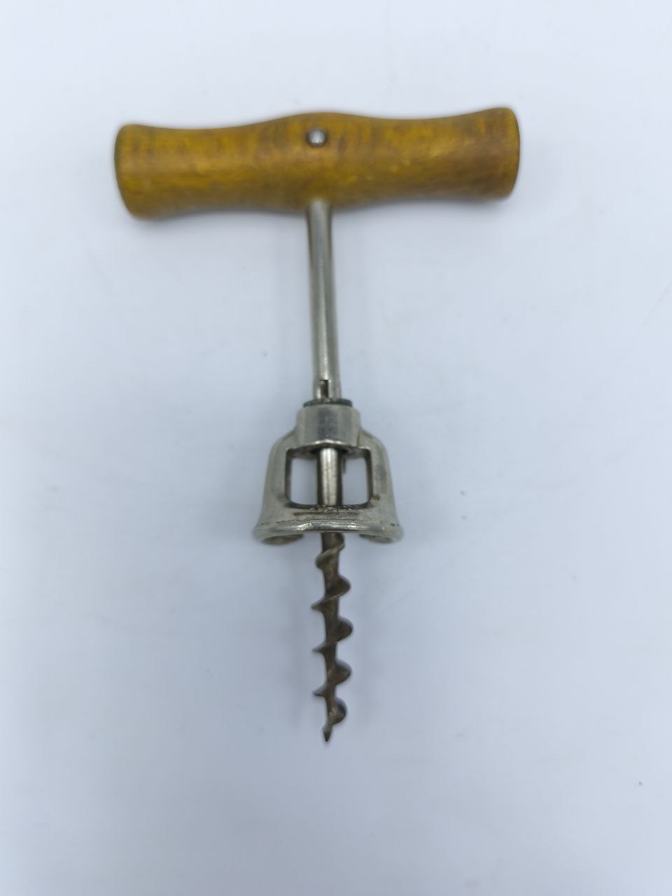 Редкий европейский штопор конца XIX — начала XX века, выполненный в лаконичном английском стиле. Деревянная Т-образная ручка гармонично сочетается с металлической коронкой, создавая образ простоты и надёжности. Такой предмет не только украшает коллекцию, но и передаёт дух эпохи винных традиций.