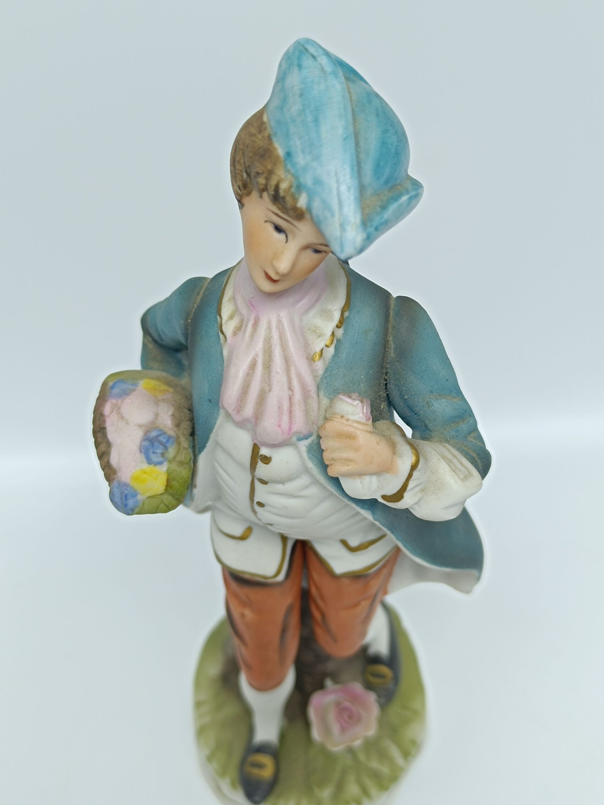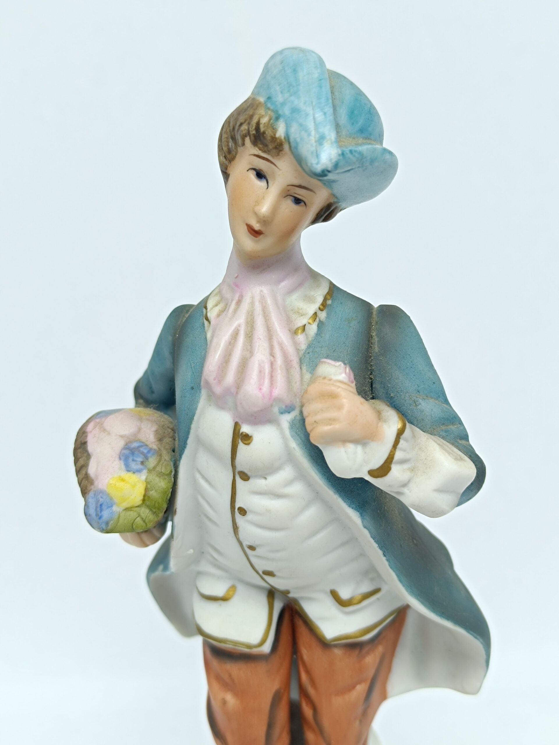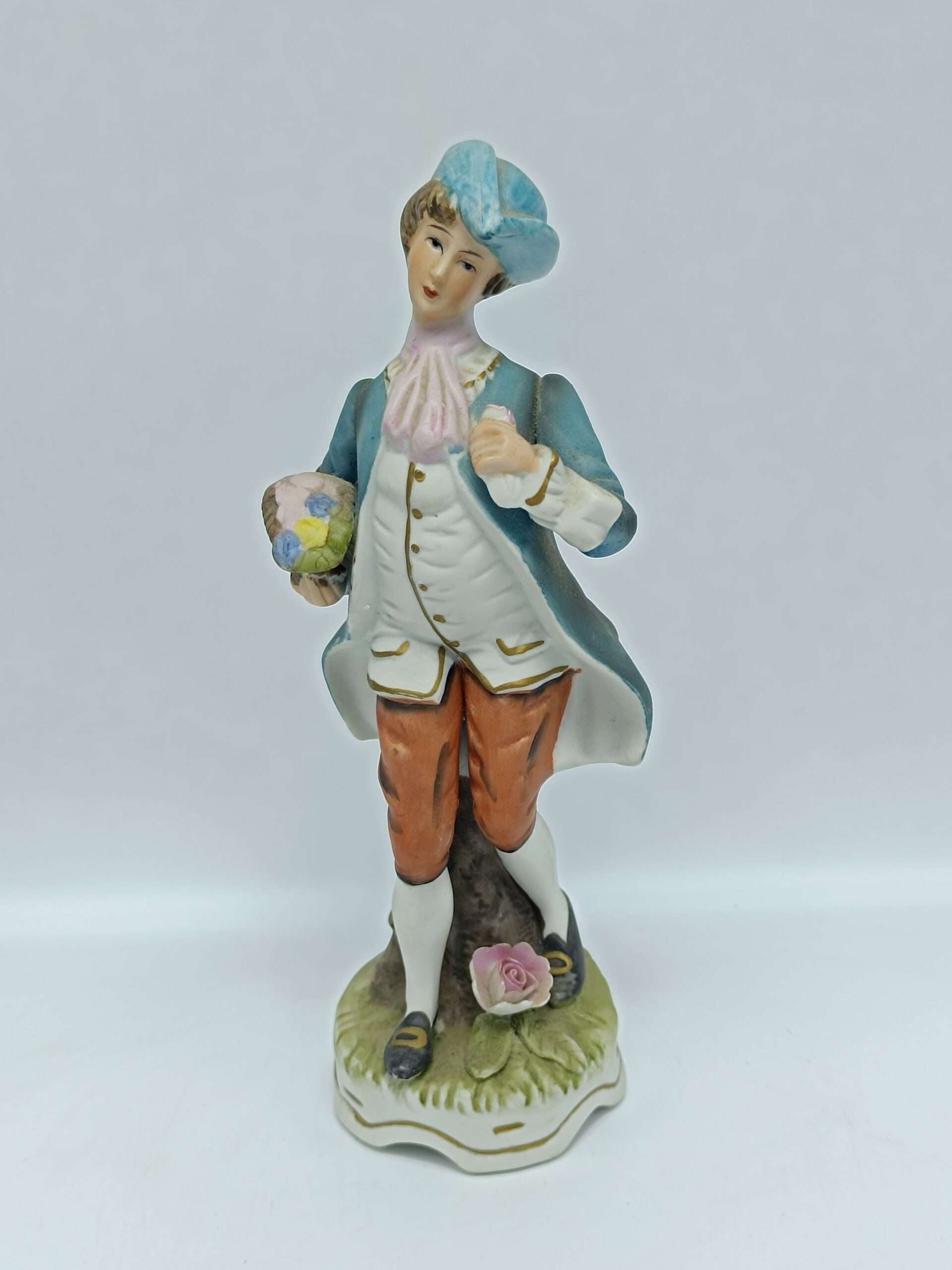 Статуэтка винтажная на круглом основании «Галантный кавалер с букетом». Фарфор, роспись, Европа 1980 года Высота 20.5 см
