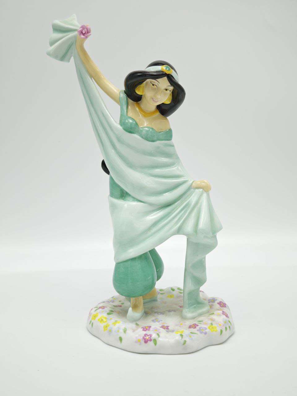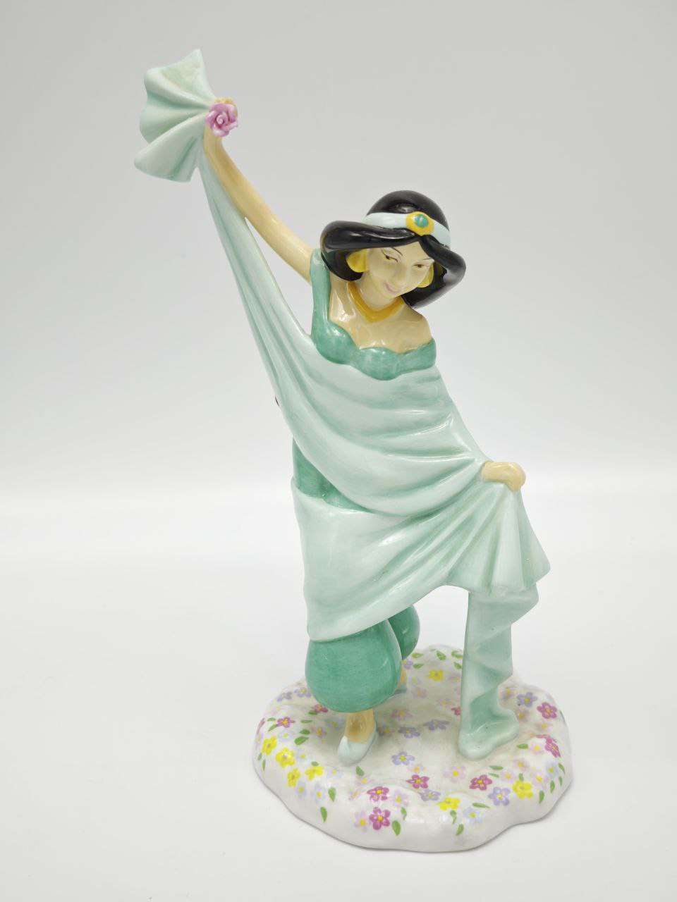 Фарфоровая статуэтка Принцессы Жасмин из коллекции Disney Princesses создана мануфактурой Royal Doulton в 1999 году, производство — Таиланд. Фигура передаёт динамику движения за счёт поднятой руки и развевающейся ткани, создавая ощущение сценического танца. Мягкая мятно-бирюзовая гамма и аккуратная роспись делают образ выразительным и гармоничным для интерьерного размещения. Высота изделия составляет 21 см, вес — 240 грамм. В комплект входит фирменный сертификат коллекции Disney Showcase Collection, бренд Royal Doulton и Disney указаны на основании изделия.