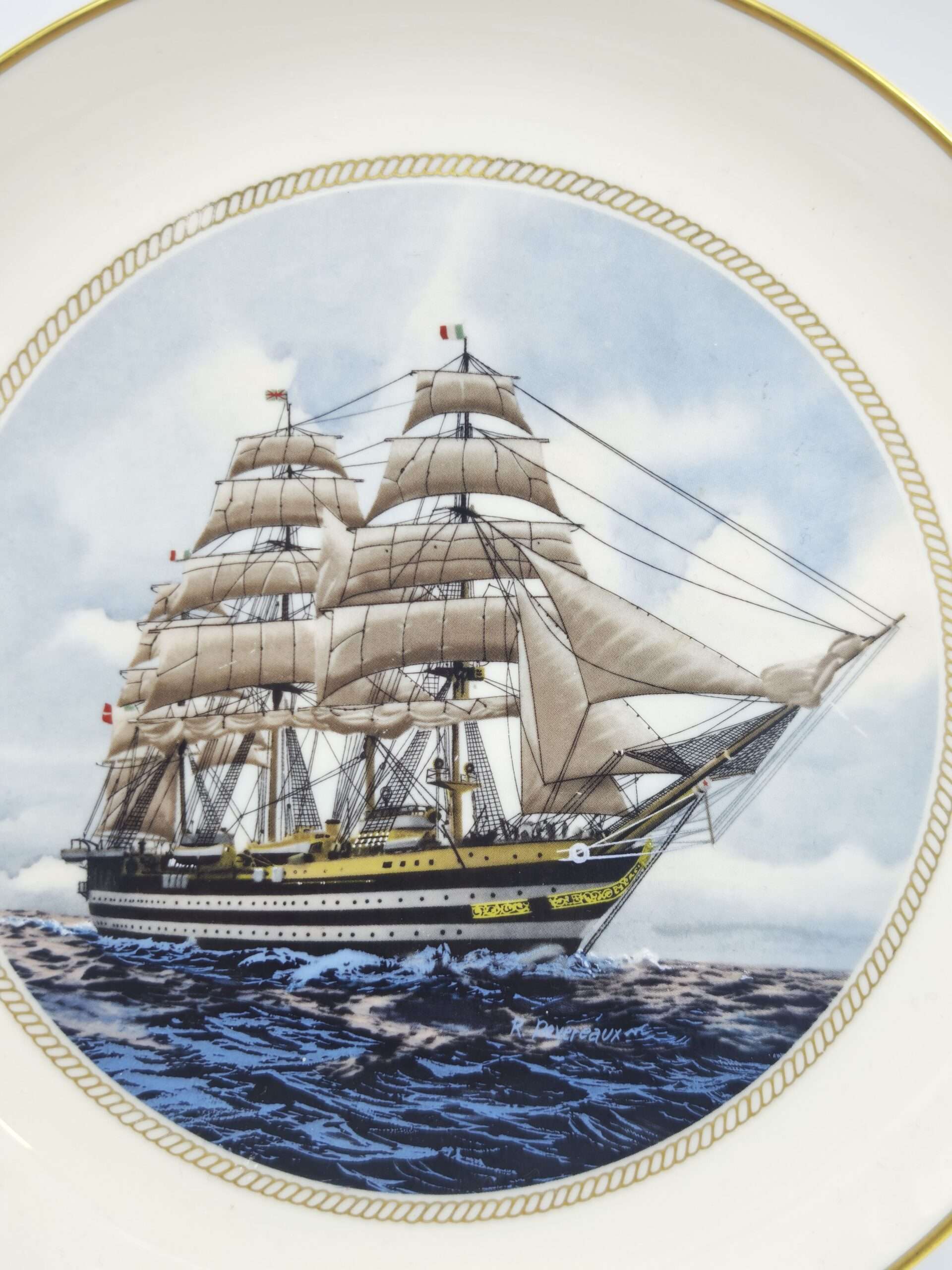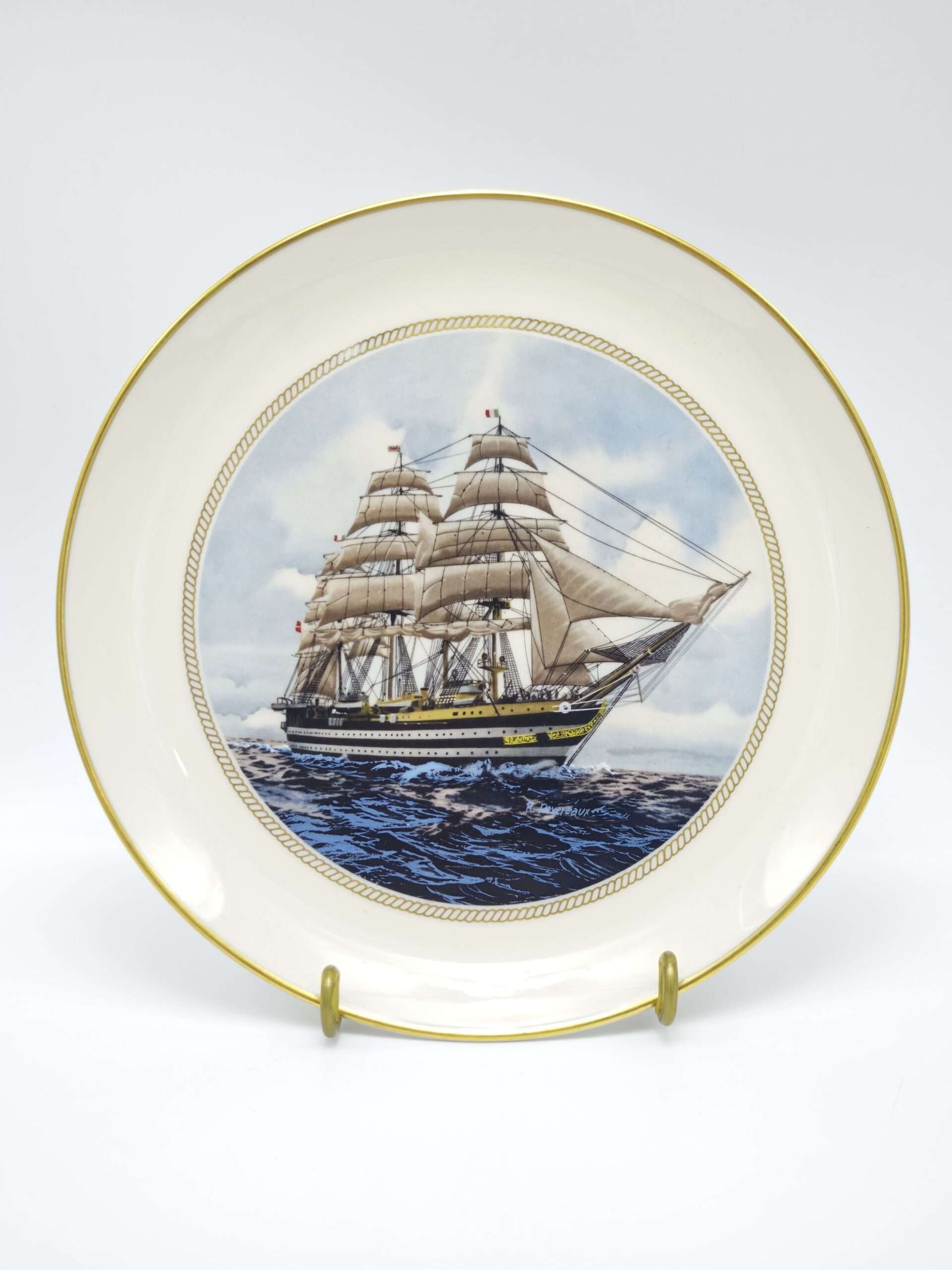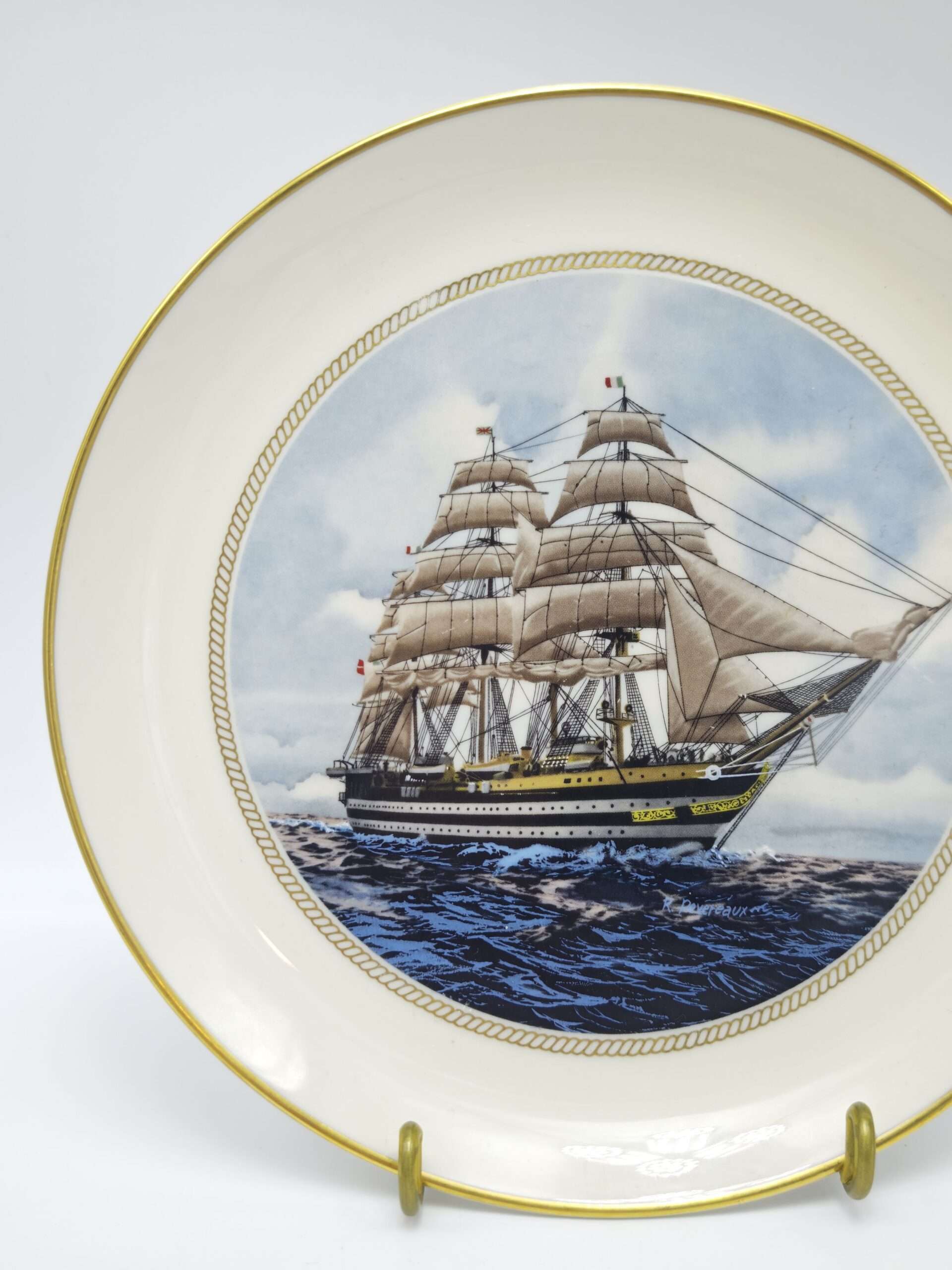 Тарелка винтажная декоративная настенная «Парусники» из коллекции «Эпоха Великих географических открытия». Фарфор, деколь, золочение. США, Danbury Mint.