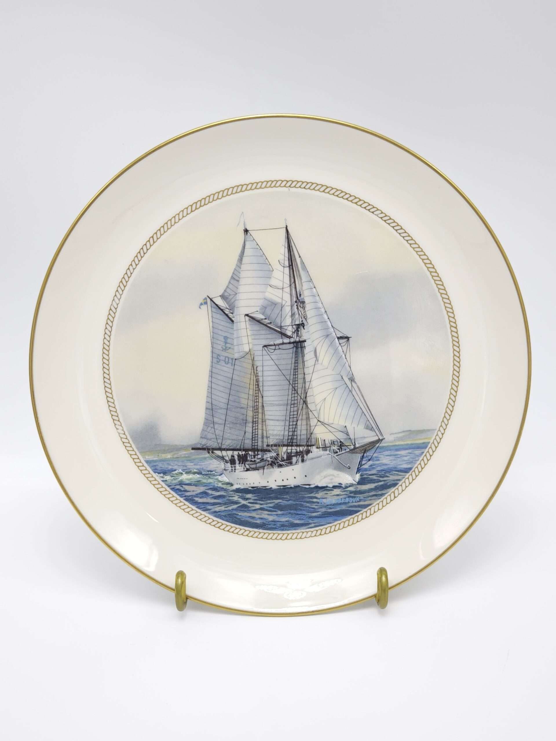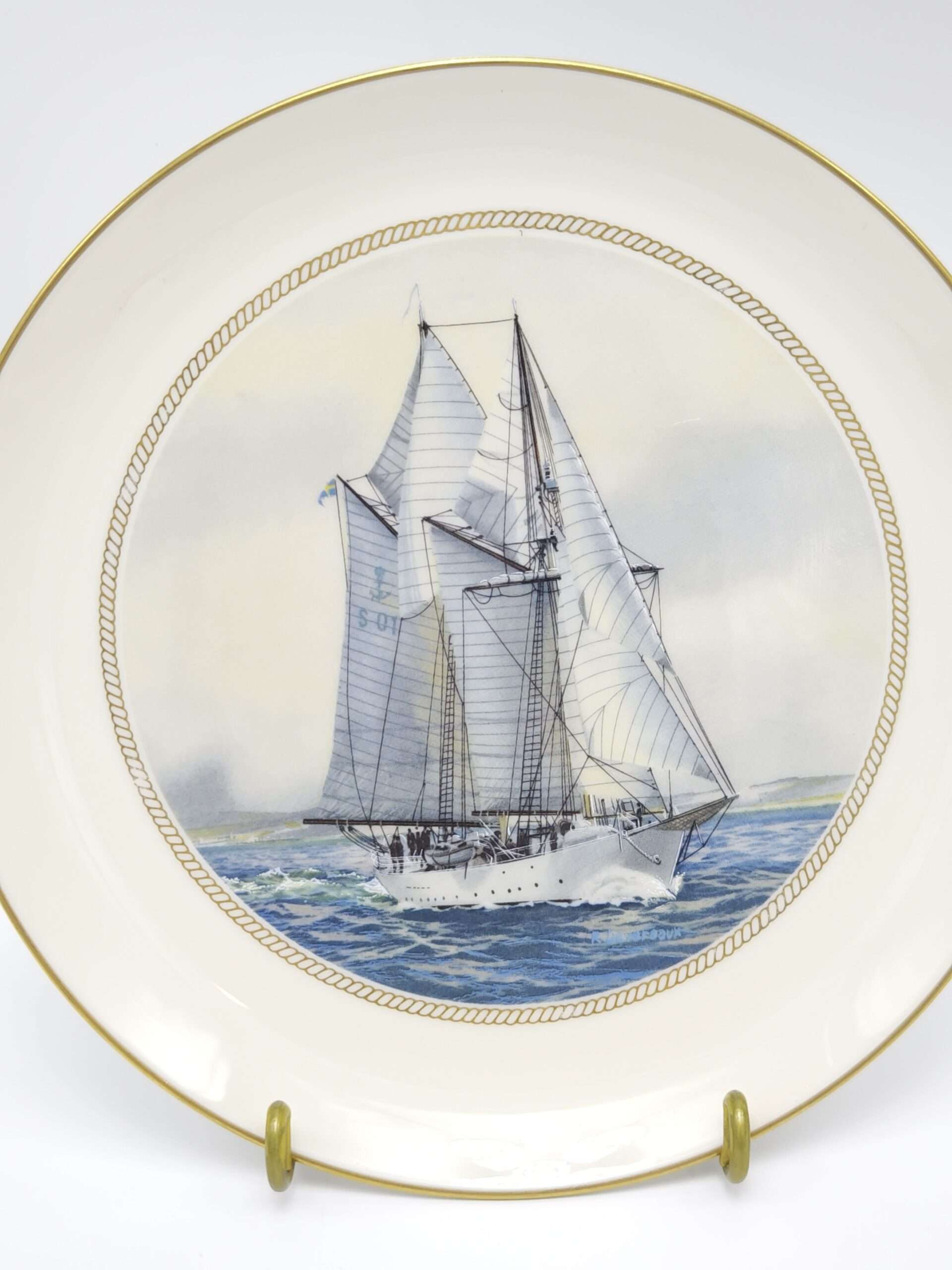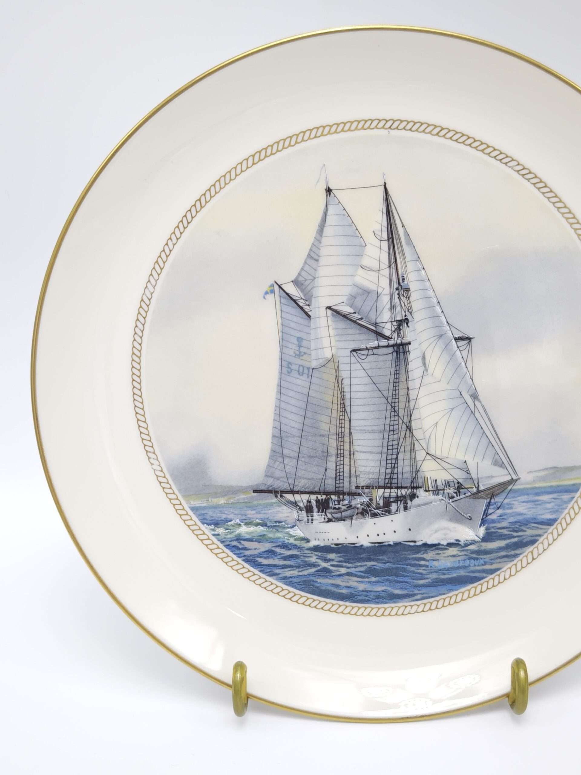 Тарелка винтажная декоративная настенная «Парусники» из коллекции «Эпоха Великих географических открытия». Фарфор, деколь, золочение. США, Danbury Mint.