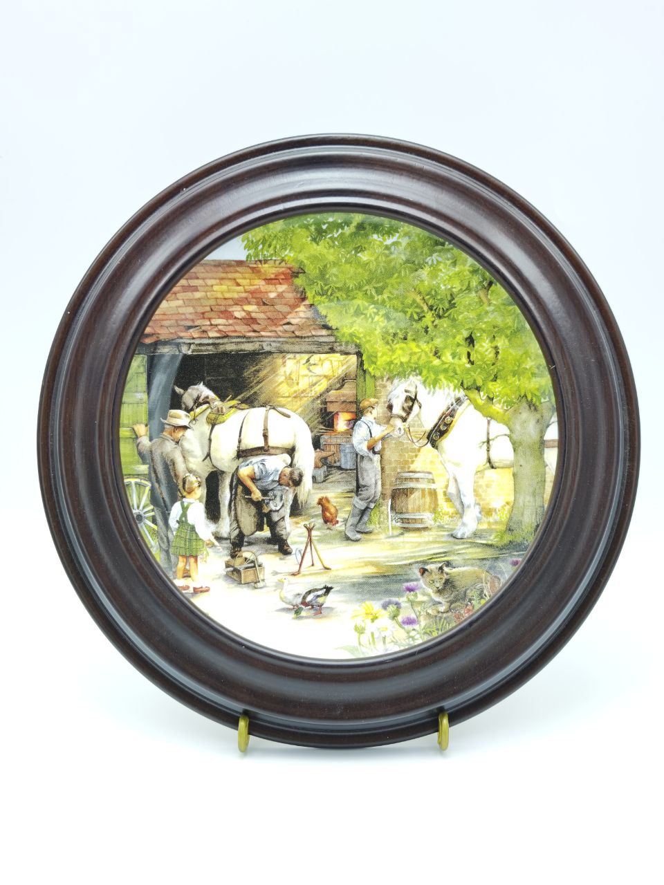 Коллекционная фарфоровая тарелка с жанровной сценой деревенской кузницы, выполненная в традициях английской декоративной живописи. Работа отличается тёплой цветовой палитрой, детальной прорисовкой персонажей и атмосферой сельского быта. Тарелка оформлена в деревянную подвесную раму, готова к размещению на стене. Предмет представляет интерес для любителей английского фарфора и интерьерного декора с историческим характером.