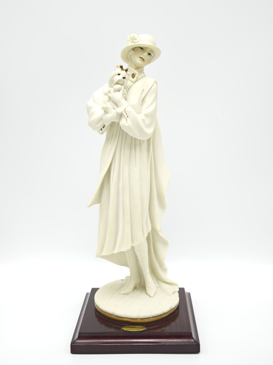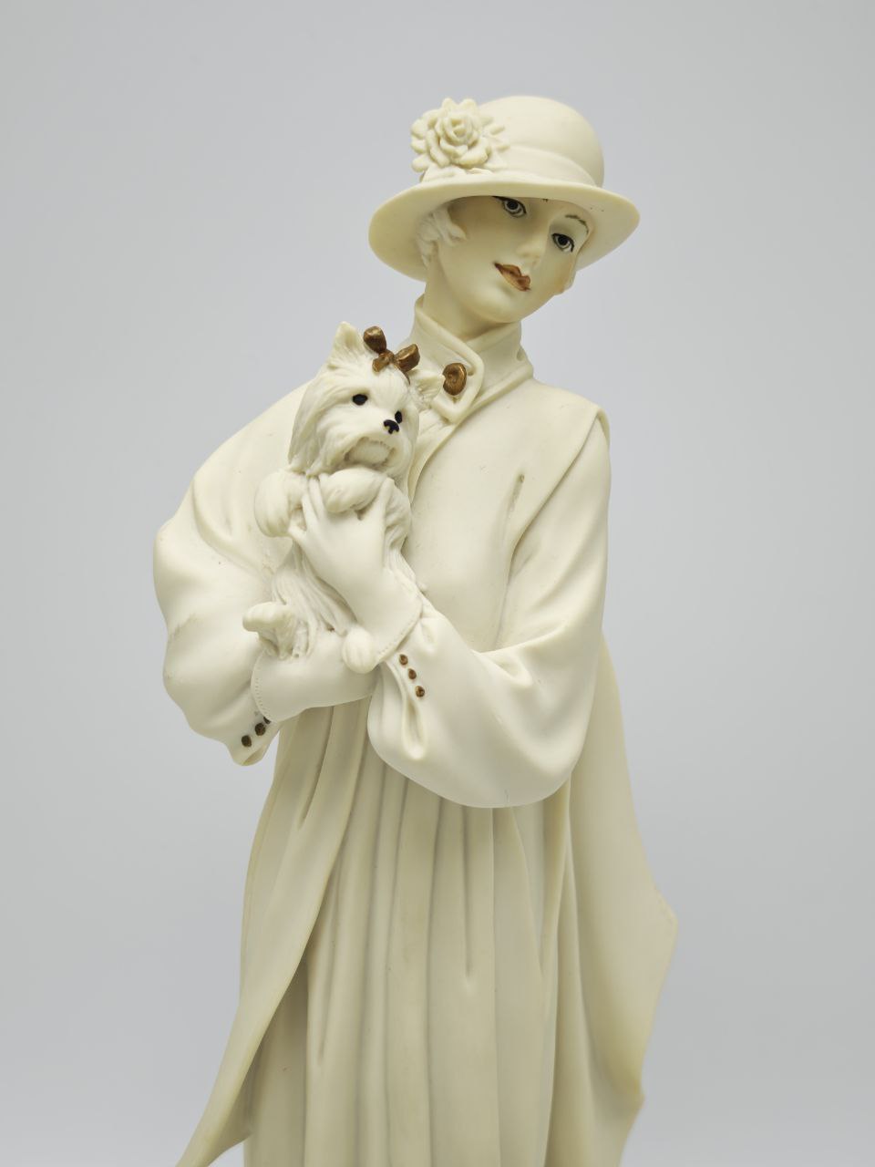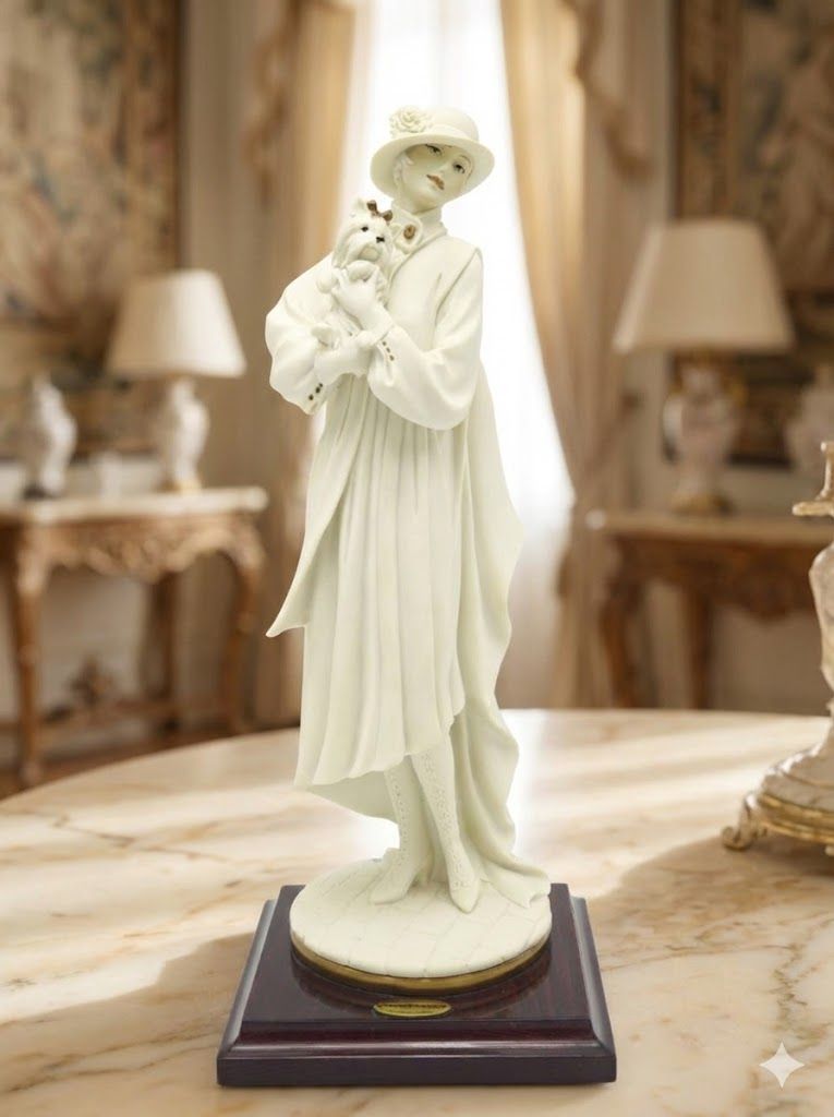 Изящная интерьерная статуэтка, изображающая молодую даму с йоркширским терьером, выполнена в лучших традициях итальянской скульптурной школы. Плавные линии силуэта, мягкая матовая фактура фарфора и выразительная пластика придают композиции особую утончённость. Работа отличается высокой детализацией — от складок платья до образа собаки. Предмет станет выразительным акцентом классического интерьера или частью коллекции художественного фарфора.