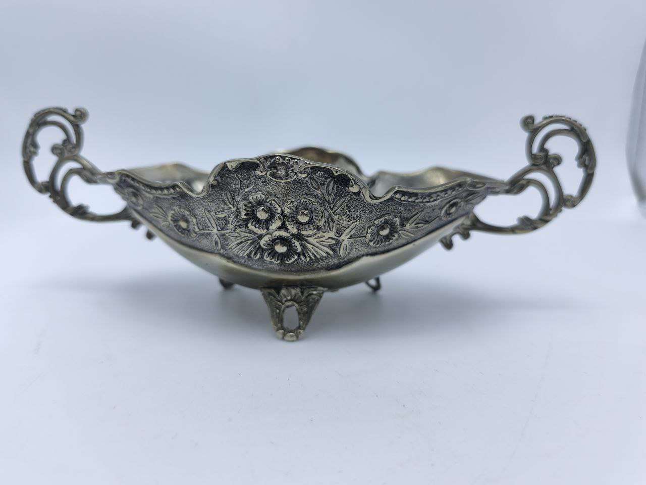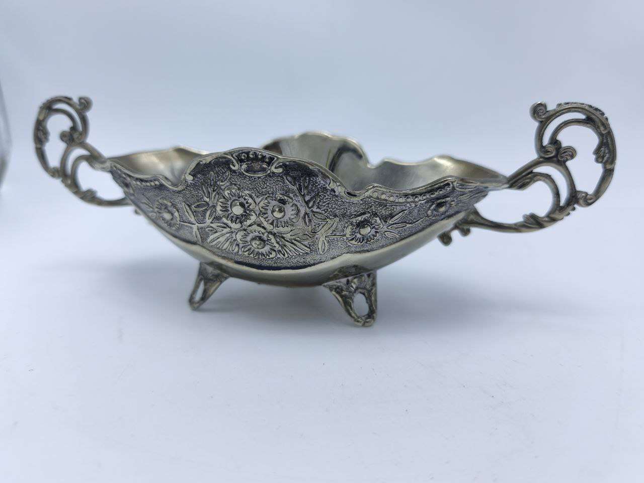Материалы:Основной материал: металлОтделка: полированное покрытиеДекор: цветочный орнаментКонструктивные особенности:Форма: классическая вазочка-конфетницаРучки: две боковые декоративныеДекор: растительный орнаментКонструкция: устойчивая, эргономичнаяРазмеры и вес:Габариты: оптимальные для сервировкиВес: умеренный, удобный для использованияНазначение и применение:Основное использование: подача конфет и сладостейДополнительные варианты:Хранение фруктовСервировка десертовДекоративный элемент
