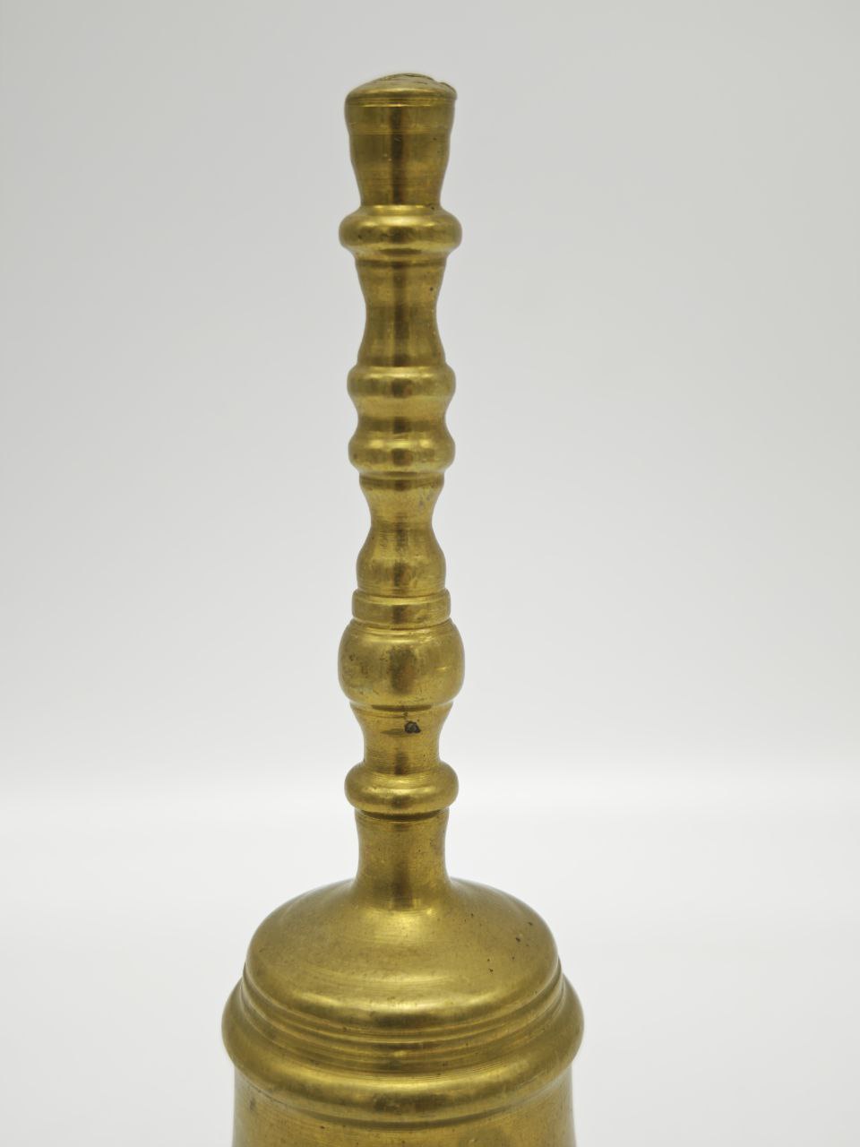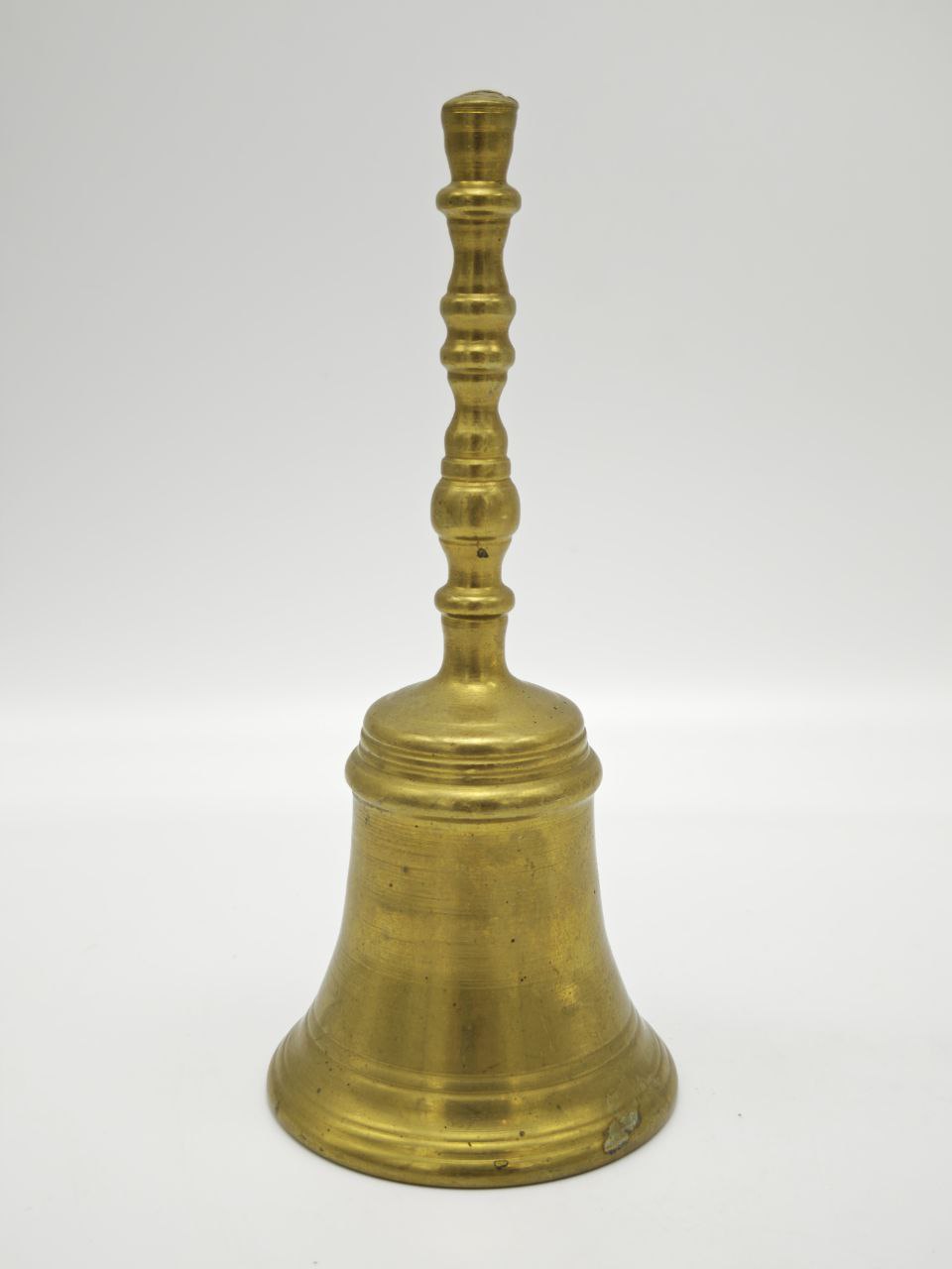 Англия, 1975 год. Латунный колокольчик с массивным корпусом и вытянутой фигурной ручкой выполнен в сдержанном классическом стиле. Размер 15,5×6,5 см формирует выразительный силуэт, а вес 200 г подчёркивает основательность и плотность металла. Гладкий купол без декора усиливает эффект благородного блеска и глубокого звучания. Звон насыщенный, уверенный, с чётким металлическим тембром — предмет, который не остаётся незамеченным.