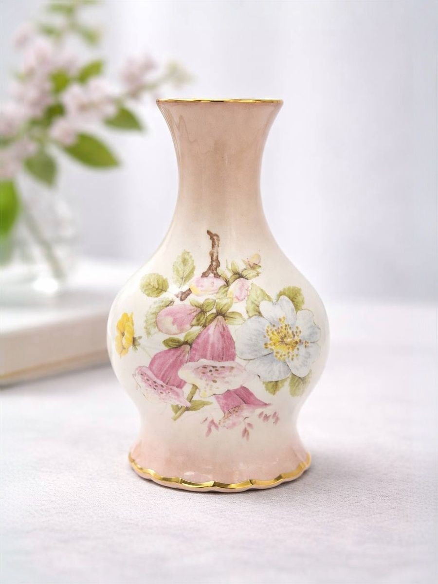Ваза 1980-х годов в отличном состоянии, с маркировкой Royal Worcester Spode Palissy. Элегантная форма с узким горлом и округлым корпусом идеальна для небольших букетов. Английский фарфор — прекрасное дополнение к коллекции или изысканный подарок ценителям винтажа.