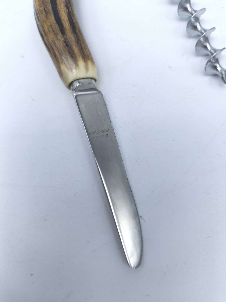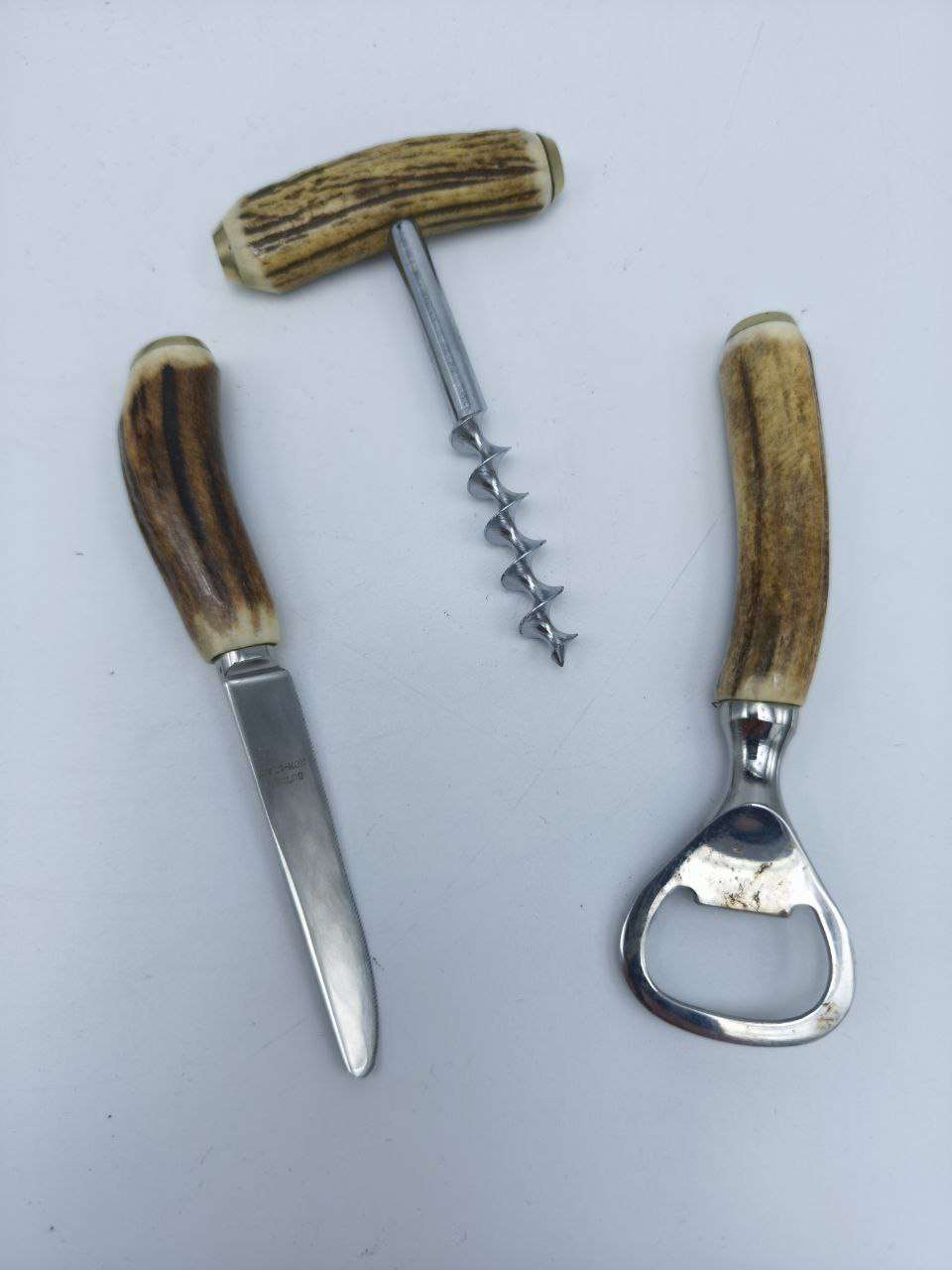 Редкий винный набор времён ГДР, включающий штопор, нож и открывалку для бутылок, аккуратно уложенные в оригинальный футляр. Ручки выполнены из натурального оленьего рога, придавая каждому предмету уникальный внешний вид и тактильную теплоту. Прочные стальные рабочие части обеспечивают долговечность, а винтажный дизайн превращает этот набор в ценный экземпляр для коллекции. Идеален для сервировки винотек, баров и домашнего использования.