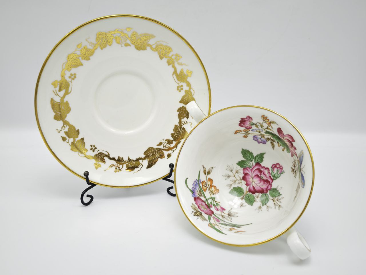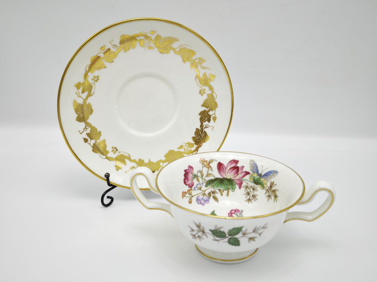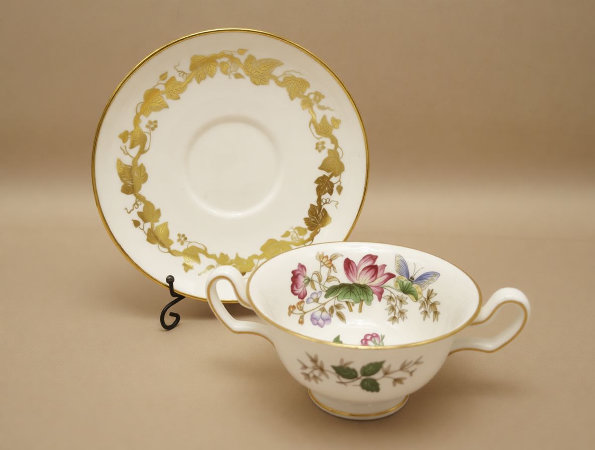 Представляем вашему вниманию редкую винтажную чайную пару от легендарного бренда Wedgwood, артикул W3854. Это не просто посуда, а настоящее произведение английского фарфорового искусства, созданное в середине XX века на знаменитой фабрике в Сток-он-Тренте. Каждая деталь этой пары — от формы до декора — говорит о безупречном вкусе и мастерстве, которые делают изделия Wedgwood узнаваемыми во всем мире.Чашка и блюдце выполнены из высококачественного костяного фарфора (Bone China), который отличается невероятной белизной, полупрозрачностью и прочностью. На внутренней поверхности чашки размещено очаровательное цветочное панно: крупный розовый цветок, нежные фиолетовые и желтые бутончики, зеленые листья и, как центральное украшение, яркая бабочка с голубыми и зелеными крыльями. Этот мотив придает паре воздушность, романтичность и свежесть, словно вы держите в руках кусочек весеннего сада.Внешняя часть чашки и все блюдце украшены тонкой, но очень эффектной золотой каймой. По краю блюдца проходит изящный золотой виноградный узор, создавая ощущение праздника и роскоши. Золото нанесено вручную, что подчеркивает уникальность каждого экземпляра. Форма чашки — двуручная, элегантная и удобная в использовании, что делает ее идеальной для торжественных чаепитий или ежедневного удовольствия.На дне изделия вы найдете оригинальное клеймо Wedgwood с логотипом в виде амфоры, надписью «BONE CHINA», «MADE IN ENGLAND» и рукописным номером модели «W 3854». Это подтверждает подлинность и позволяет точно идентифицировать эту серию. Наличие такого клейма особенно важно для коллекционеров, так как оно гарантирует происхождение и историческую ценность предмета.Такая чайная пара станет прекрасным украшением вашего стола, особенно если вы любите проводить время за чашкой чая в спокойной, атмосферной обстановке. Она идеально подойдет для коллекционеров винтажной посуды, ценителей английского стиля и всех, кто ценит вещи с историей. Это не просто предмет быта — это произведение искусства, которое можно передавать из поколения в поколение.Размеры чашки: диаметр по верхнему краю — около 10 см, высота — 6 см. Блюдце имеет диаметр около 16 см. Состояние — отличное, без сколов и трещин, следы естественного использования, характерные для предметов такого возраста.Инвестируйте в красоту и историю — эта чайная пара Wedgwood W3854 станет вашим любимым акцентом в интерьере и источником вдохновения для уютных чаепитий.
