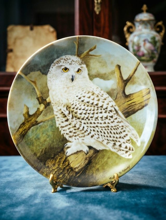Элегантная винтажная тарелка от легендарной английской мануфактуры Coalport (основана в 1750 году). Коллекционная серия «Snowy Owl» (Снежная сова) — оригинальное произведение искусства художника Michael B. Sawdy, созданное для серии «The Wise Owl» (Мудрая сова).