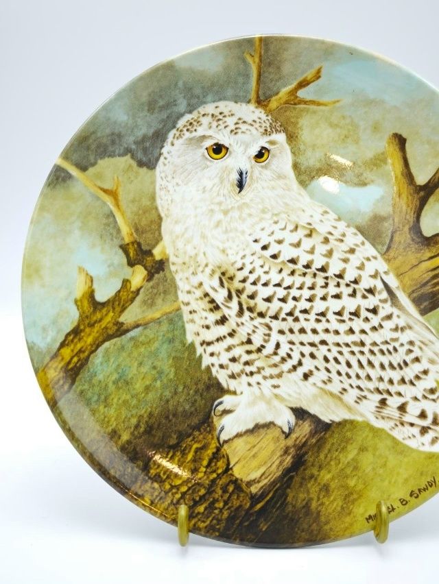 Реалистичное изображение белой полярной совы на старой ветке дерева. Потрясающая детализация белого оперения с тёмными пестринами и жёлтых глаз. На обороте полная маркировка: Coalport, номер 7535 A, Bradex Number 26-C58-5.4, год 1990. Изделие выполнено из традиционного английского фарфора, тираж ограничен 95 днями обжига. Четвёртый выпуск коллекции.