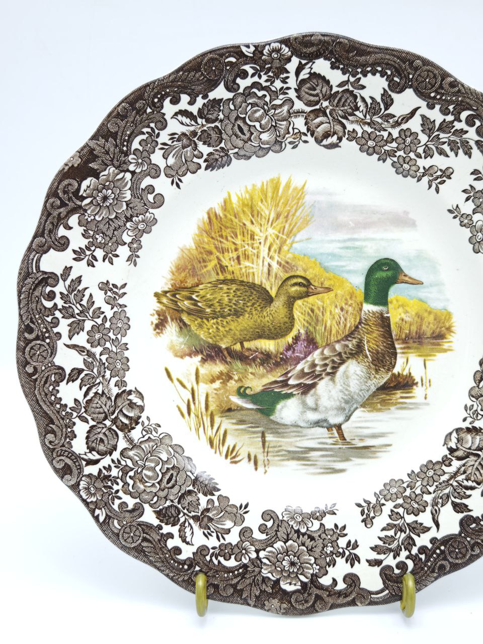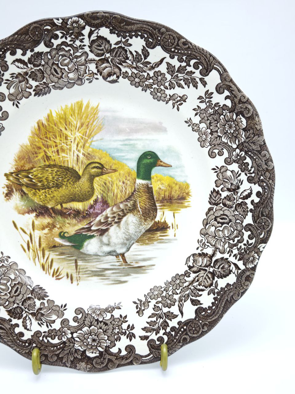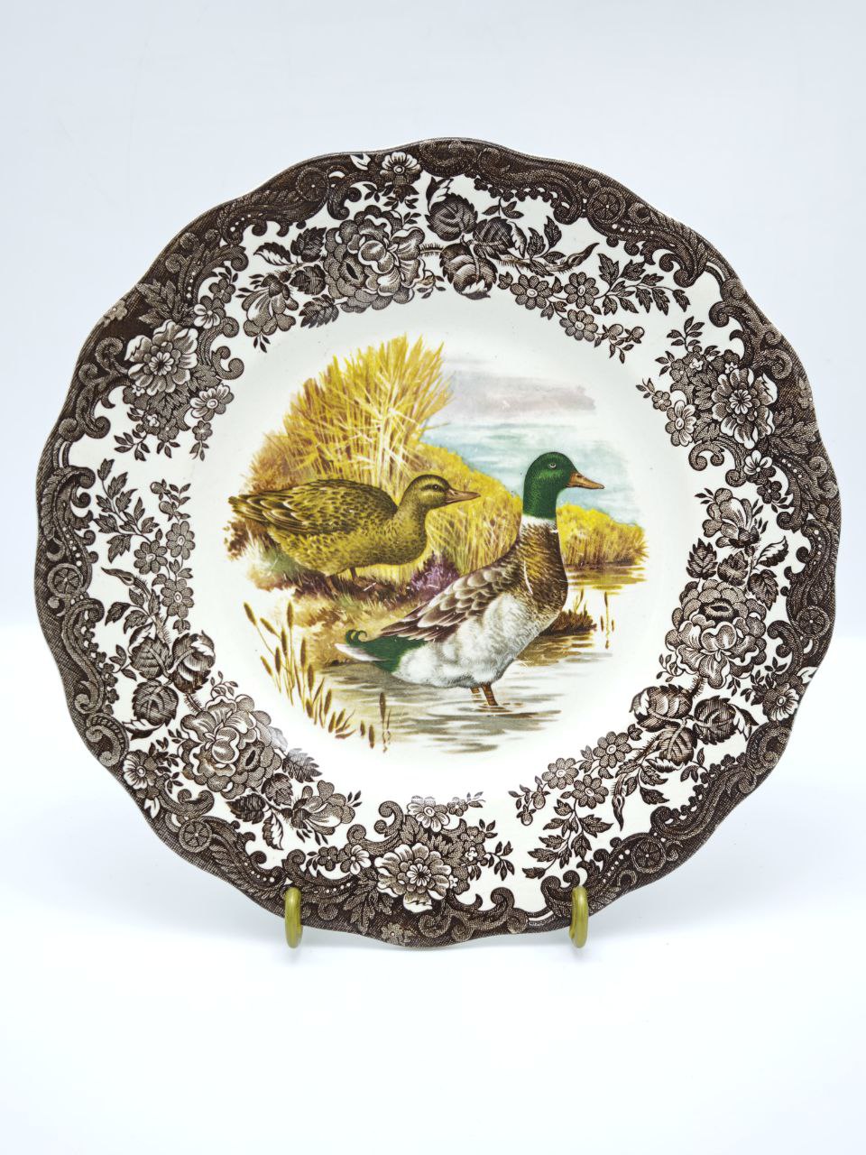 Представляем вашему вниманию редкую и поистине очаровательную винтажную декоративную тарелку из знаменитой коллекции «Game Series» бренда Palissy, входящего в легендарную группу Royal Worcester — одного из старейших и самых уважаемых производителей фарфора в Великобритании, основанного еще в 1833 году. Эта тарелка — не просто предмет интерьера, а настоящее произведение искусства, воплощающее дух английской провинции и любовь к природе.Центральным элементом композиции является изображение пары уток — самца с ярко-зеленой головой и белым туловищем и самки с коричнево-желтой окраской. Птицы изображены в естественной среде обитания: на берегу спокойного водоема, среди высокой желтой травы и пурпурных цветов. Каждая деталь перьев, каждая травинка проработаны с удивительной точностью, что свидетельствует о высочайшем мастерстве художников и технологов того времени.Края тарелки украшены сложным и элегантным орнаментом в стиле «черный шоколад» — темно-коричневым узором, состоящим из извивающихся листьев, роз и других цветов. Этот контрастный декор создает эффект рамы, акцентируя внимание на центральной сцене и придавая изделию благородный, классический вид. Форма тарелки — слегка волнистая, что добавляет ей динамики и изысканности.Тарелка изготовлена из высококачественного английского фарфора, который отличается прочностью, блеском и чистотой белого цвета. На оборотной стороне вы найдете оригинальную маркировку: “A MEMBER OF THE ROYAL WORCESTER GROUP”, “Palissy ENGLAND EST. 1833”, “GAME SERIES” — подлинное свидетельство ее происхождения и принадлежности к престижной коллекции.Это изделие идеально подойдет для создания атмосферы утонченного английского стиля в вашем доме. Ее можно разместить на стене как самостоятельное украшение, использовать в качестве центрального элемента на комоде или каминной полке, или же включить в коллекцию винтажных тарелок. Она станет прекрасным подарком для ценителя антиквариата, коллекционера фарфора, охотника или просто человека с хорошим вкусом, который ценит красоту и историю.Состояние тарелки — отличное для своего возраста (1970-е годы), без сколов, трещин или потертостей глазури. Это не просто предмет быта, а настоящий кусочек истории, который будет радовать вас и ваших гостей долгие годы.