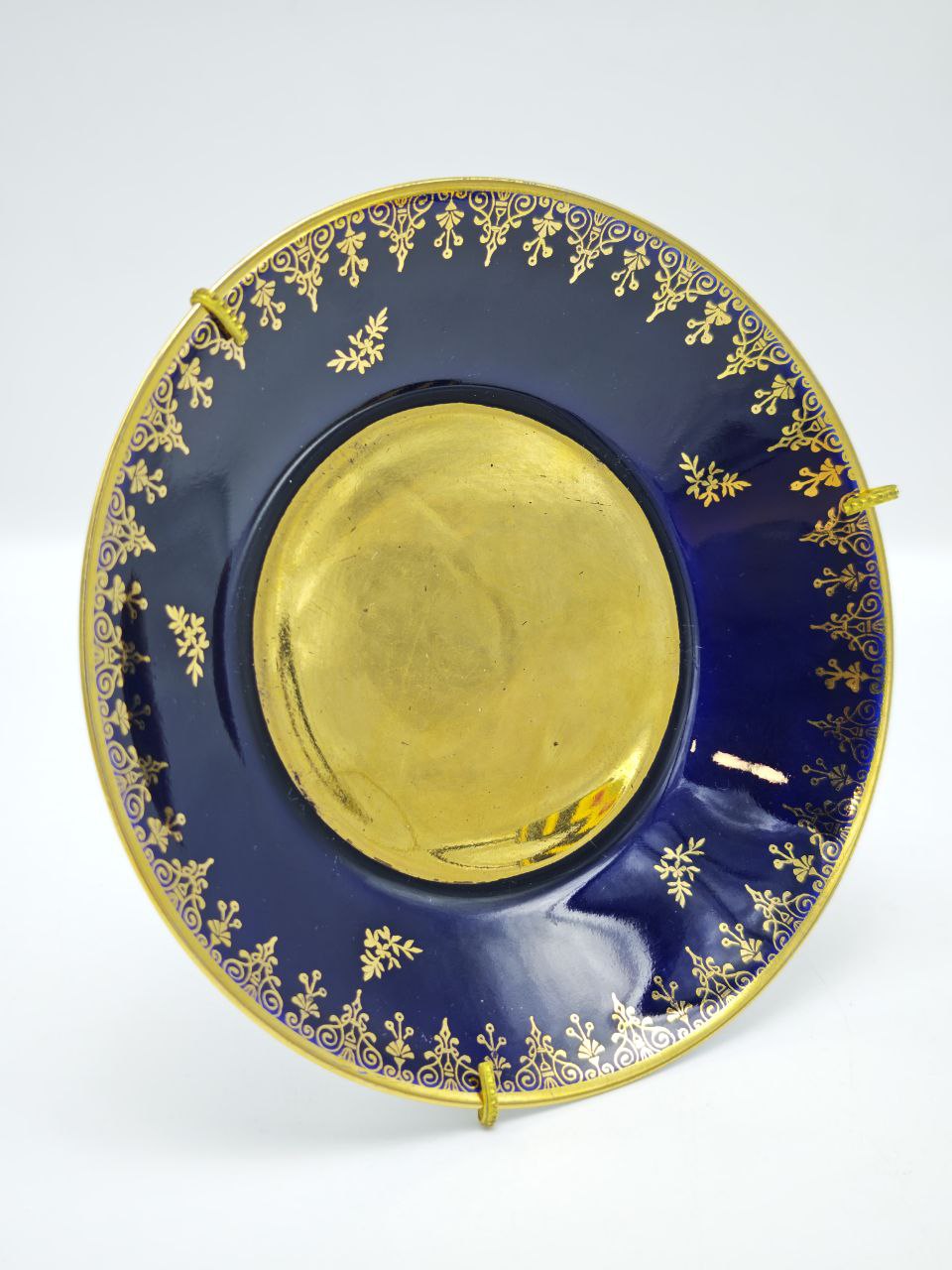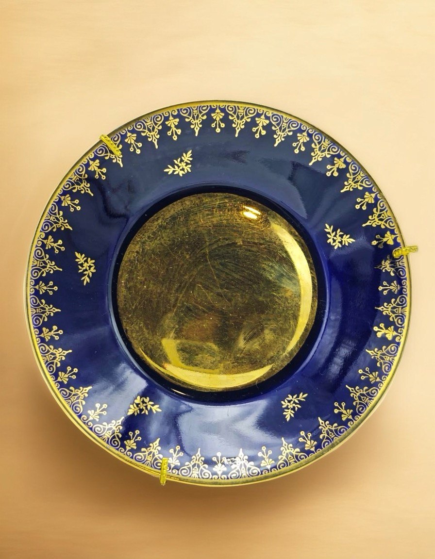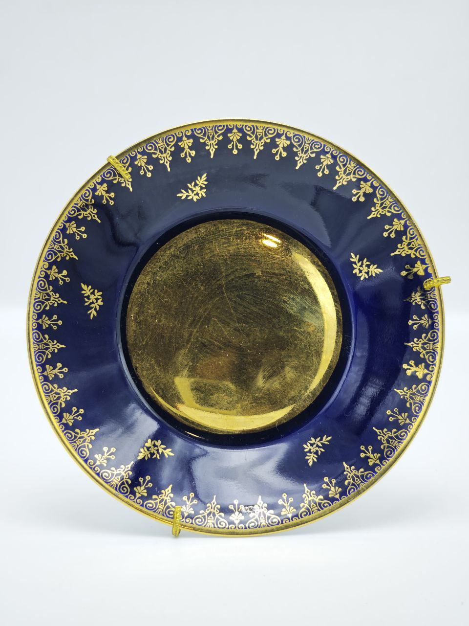 Представляем вам настоящую жемчужину французского фарфорового искусства — винтажную декоративную тарелку, созданную мастерами знаменитой фабрики Jammet Seignolles в Лиможе, Франция. Этот предмет не просто посуда, а исторический артефакт, хранящий в себе дух эпохи и личную историю своего владельца.Т арелка выполнена из высококачественного лиможского фарфора, слава которого известна во всем мире благодаря своей белизне, прозрачности и прочности. Ее поверхность покрыта глубоким, насыщенным синим глазурным слоем, который создает великолепный контраст с богатым золотым декором. Край тарелки украшен изысканным орнаментом в стиле ар-нуво: тонкие, извивающиеся линии, напоминающие лианы, и нежные цветочные мотивы, нанесенные вручную золотой краской. В центре композиции расположен крупный круглый медальон, полностью покрытый золотом, что придает изделию особую роскошь и торжественность.На оборотной стороне тарелки вы можете увидеть маркировку производителя: “JAMMET SEIGNOLLES LIMOGES FRANCE”, что гарантирует ее происхождение. Также там нанесена трогательная надпись на французском языке: “Souvenir de mon beau voyage à Lourdes” — “Сувенир с моего прекрасного путешествия в Лурд”. Это указывает на то, что тарелка была куплена как памятный подарок или сувенир во время поездки в знаменитый католический паломнический центр Лурд, что делает ее не только красивым предметом декора, но и частью личной истории. Такая тарелка станет идеальным украшением для вашего дома. Она прекрасно впишется в интерьер в стиле прованс, ар-нуво, классика или даже современный минимализм, добавляя ему изысканности и шарма. Вы можете повесить ее на стену как самостоятельное произведение искусства или использовать в качестве центрального элемента на обеденном столе. Это также уникальный и запоминающийся подарок для ценителей винтажа, коллекционеров фарфора или для тех, кто любит французскую культуру и историю. Не упустите возможность приобрести этот кусочек французской истории и роскоши. Ваша новая тарелка будет радовать вас и ваших гостей своим изяществом и исторической значимостью на протяжении многих лет.