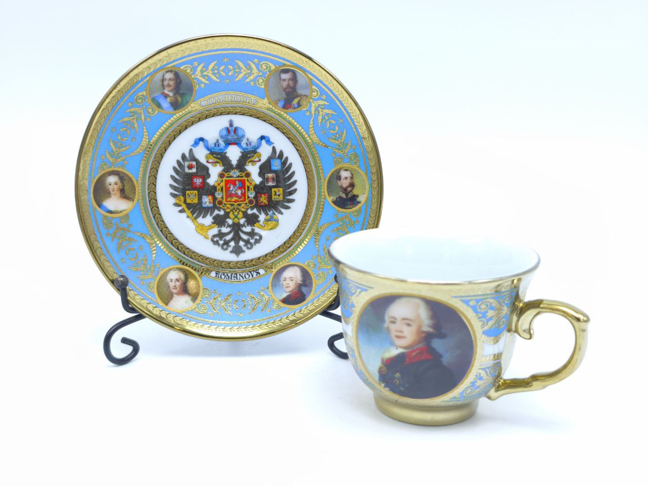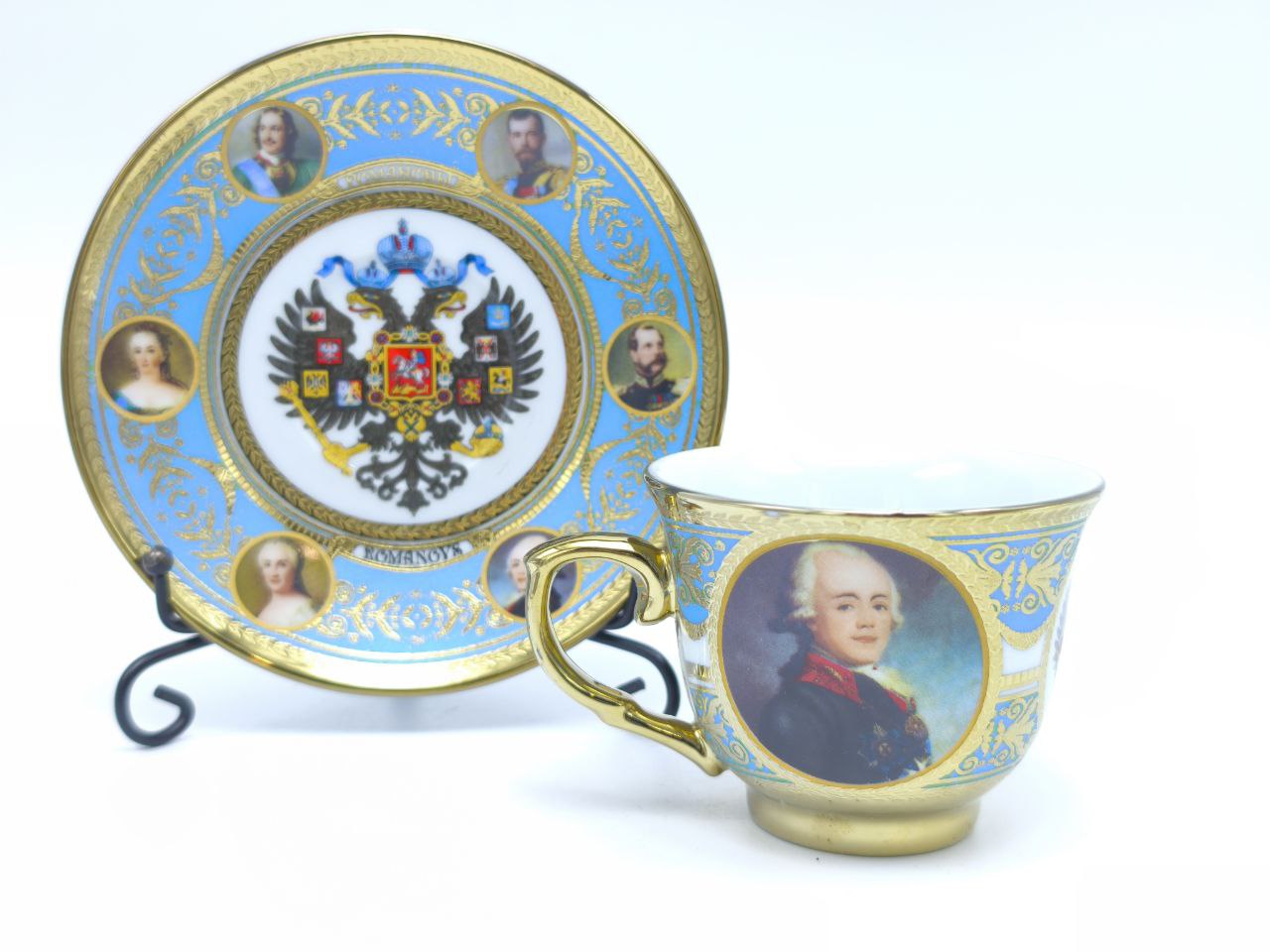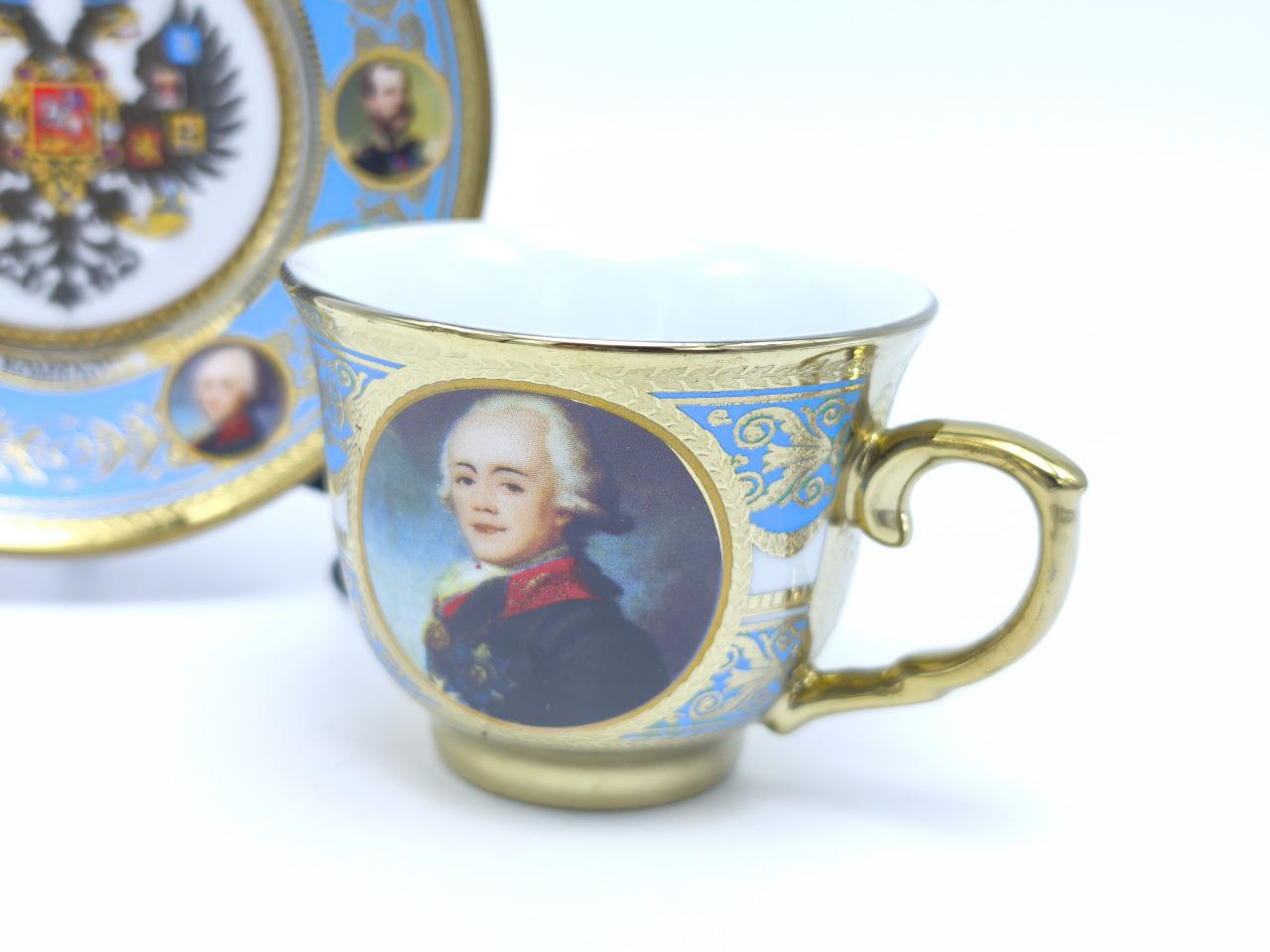 Представляем вашему вниманию изысканную винтажную фарфоровую чайную чашку, размер 6,5х5,5см, с блюдцем, диаметр 11см, украшенную золотыми узорами и символикой Российской Империи. Этот уникальный предмет антиквариата является настоящим произведением искусства и воплощает в себе атмосферу времени из эпохи царской России. Чашка и блюдце изготовлены из высококачественного фарфора, чья прочность и долговечность остаются неизменно популярными среди коллекционеров и истинных ценителей изысканности.Основной акцент в дизайне сделан на роскошном золочении, которое покрывает края изделий и создаёт аристократичную элегантность. Золотые узоры искусно обрамляют изображение российского герба на блюдце — символы власти и величия, которые прекрасно дополняют атмосферу утонченной роскоши. Декоративные элементы на чашке гармонично сочетаются с изображениями, выполненными в насыщенных цветах, добавляя общему дизайну поразительную глубину и богатство.Особое внимание следует уделить деталям деревянной рамы с золочением, которое идёт в комплекте к блюдцу. Это дополнение не просто обрамляет изделие, но и акцентирует его художественную ценность, превращая сервиз в идеальный подарок для знатоков антиквариата и почитателей элегантной посуды. Изделие может служить не только в качестве функционального элемента, но и украшением вашего интерьера, привнося старинный шарм в современное пространство.Этот чайный сервиз станет изысканным дополнением для личной коллекции или прекрасным подарком для дорогих вам людей. Подарите себе прикосновение к истории, приобретая этот уникальный предмет, который способен создать атмосферу гармонии и утонченности в вашем доме. Наполните каждый ваш день моментами истинного наслаждения, окунитесь в атмосферу исторической красоты и величия.