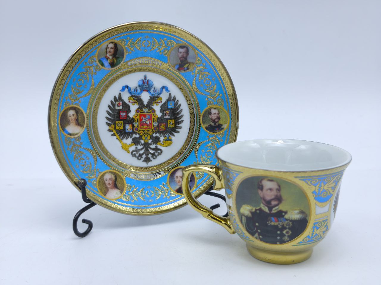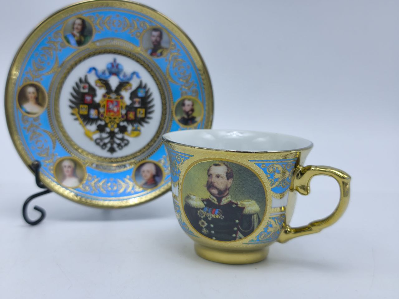 Представляем вашему вниманию изысканную винтажную фарфоровую чайную чашку, размер 6,5х5,5см, с блюдцем, диаметр 11см, украшенную золотыми узорами и символикой Российской Империи. Этот уникальный предмет антиквариата является настоящим произведением искусства и воплощает в себе атмосферу времени из эпохи царской России. Чашка и блюдце изготовлены из высококачественного фарфора, чья прочность и долговечность остаются неизменно популярными среди коллекционеров и истинных ценителей изысканности.Основной акцент в дизайне сделан на роскошном золочении, которое покрывает края изделий и создаёт аристократичную элегантность. Золотые узоры искусно обрамляют изображение российского герба на блюдце — символы власти и величия, которые прекрасно дополняют атмосферу утонченной роскоши. Декоративные элементы на чашке гармонично сочетаются с изображениями, выполненными в насыщенных цветах, добавляя общему дизайну поразительную глубину и богатство.Особое внимание следует уделить деталям деревянной рамы с золочением, которое идёт в комплекте к блюдцу. Это дополнение не просто обрамляет изделие, но и акцентирует его художественную ценность, превращая сервиз в идеальный подарок для знатоков антиквариата и почитателей элегантной посуды. Изделие может служить не только в качестве функционального элемента, но и украшением вашего интерьера, привнося старинный шарм в современное пространство.Этот чайный сервиз станет изысканным дополнением для личной коллекции или прекрасным подарком для дорогих вам людей. Подарите себе прикосновение к истории, приобретая этот уникальный предмет, который способен создать атмосферу гармонии и утонченности в вашем доме. Наполните каждый ваш день моментами истинного наслаждения, окунитесь в атмосферу исторической красоты и величия.