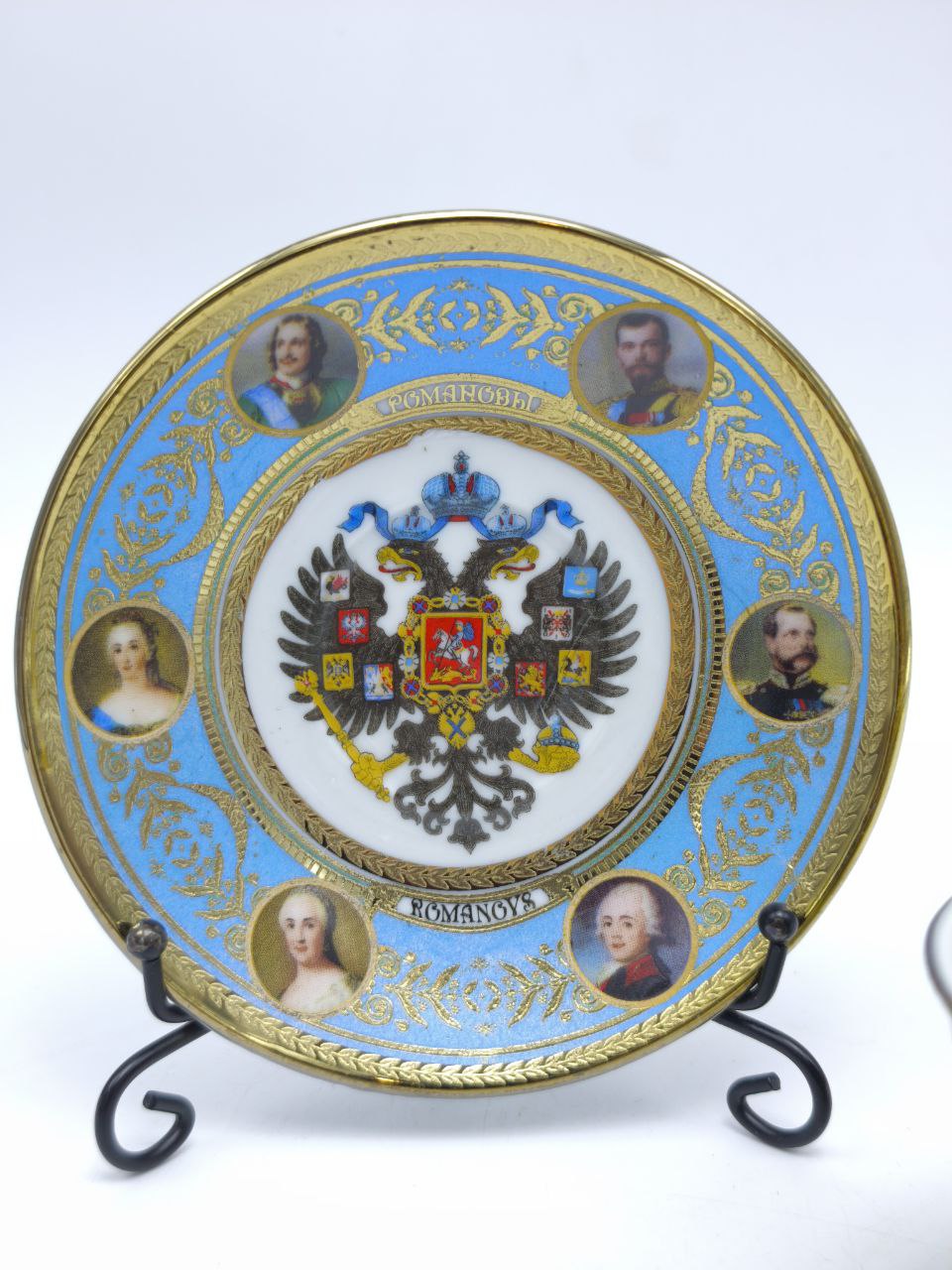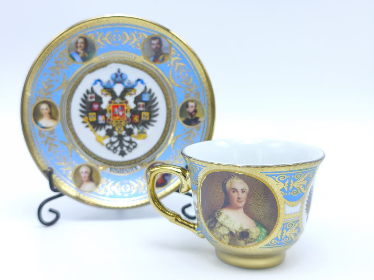 Представляем вашему вниманию изысканную винтажную фарфоровую чайную чашку, размер 6,5х5,5см, с блюдцем, диаметр 11см, украшенную золотыми узорами и символикой Российской Империи. Этот уникальный предмет антиквариата является настоящим произведением искусства и воплощает в себе атмосферу времени из эпохи царской России. Чашка и блюдце изготовлены из высококачественного фарфора, чья прочность и долговечность остаются неизменно популярными среди коллекционеров и истинных ценителей изысканности.Основной акцент в дизайне сделан на роскошном золочении, которое покрывает края изделий и создаёт аристократичную элегантность. Золотые узоры искусно обрамляют изображение российского герба на блюдце — символы власти и величия, которые прекрасно дополняют атмосферу утонченной роскоши. Декоративные элементы на чашке гармонично сочетаются с изображениями, выполненными в насыщенных цветах, добавляя общему дизайну поразительную глубину и богатство.Особое внимание следует уделить деталям деревянной рамы с золочением, которое идёт в комплекте к блюдцу. Это дополнение не просто обрамляет изделие, но и акцентирует его художественную ценность, превращая сервиз в идеальный подарок для знатоков антиквариата и почитателей элегантной посуды. Изделие может служить не только в качестве функционального элемента, но и украшением вашего интерьера, привнося старинный шарм в современное пространство.Этот чайный сервиз станет изысканным дополнением для личной коллекции или прекрасным подарком для дорогих вам людей. Подарите себе прикосновение к истории, приобретая этот уникальный предмет, который способен создать атмосферу гармонии и утонченности в вашем доме. Наполните каждый ваш день моментами истинного наслаждения, окунитесь в атмосферу исторической красоты и величия.