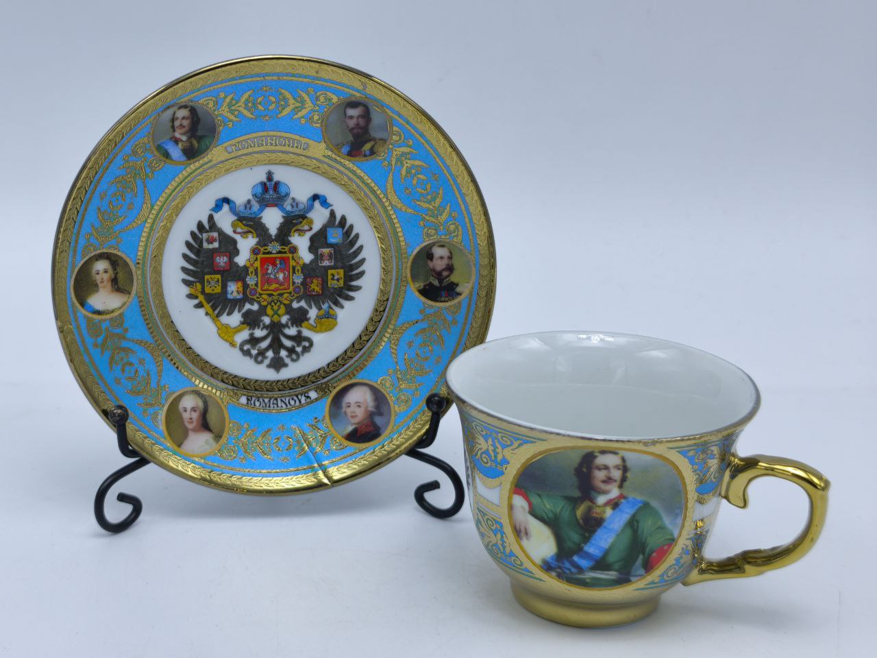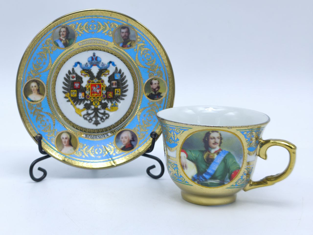 Представляем вашему вниманию изысканную винтажную фарфоровую чайную чашку, размер 6,5х5,5см, с блюдцем, диаметр 11см, украшенную золотыми узорами и символикой Российской Империи. Этот уникальный предмет антиквариата является настоящим произведением искусства и воплощает в себе атмосферу времени из эпохи царской России. Чашка и блюдце изготовлены из высококачественного фарфора, чья прочность и долговечность остаются неизменно популярными среди коллекционеров и истинных ценителей изысканности.Основной акцент в дизайне сделан на роскошном золочении, которое покрывает края изделий и создаёт аристократичную элегантность. Золотые узоры искусно обрамляют изображение российского герба на блюдце — символы власти и величия, которые прекрасно дополняют атмосферу утонченной роскоши. Декоративные элементы на чашке гармонично сочетаются с изображениями, выполненными в насыщенных цветах, добавляя общему дизайну поразительную глубину и богатство.Особое внимание следует уделить деталям деревянной рамы с золочением, которое идёт в комплекте к блюдцу. Это дополнение не просто обрамляет изделие, но и акцентирует его художественную ценность, превращая сервиз в идеальный подарок для знатоков антиквариата и почитателей элегантной посуды. Изделие может служить не только в качестве функционального элемента, но и украшением вашего интерьера, привнося старинный шарм в современное пространство.Этот чайный сервиз станет изысканным дополнением для личной коллекции или прекрасным подарком для дорогих вам людей. Подарите себе прикосновение к истории, приобретая этот уникальный предмет, который способен создать атмосферу гармонии и утонченности в вашем доме. Наполните каждый ваш день моментами истинного наслаждения, окунитесь в атмосферу исторической красоты и величия.