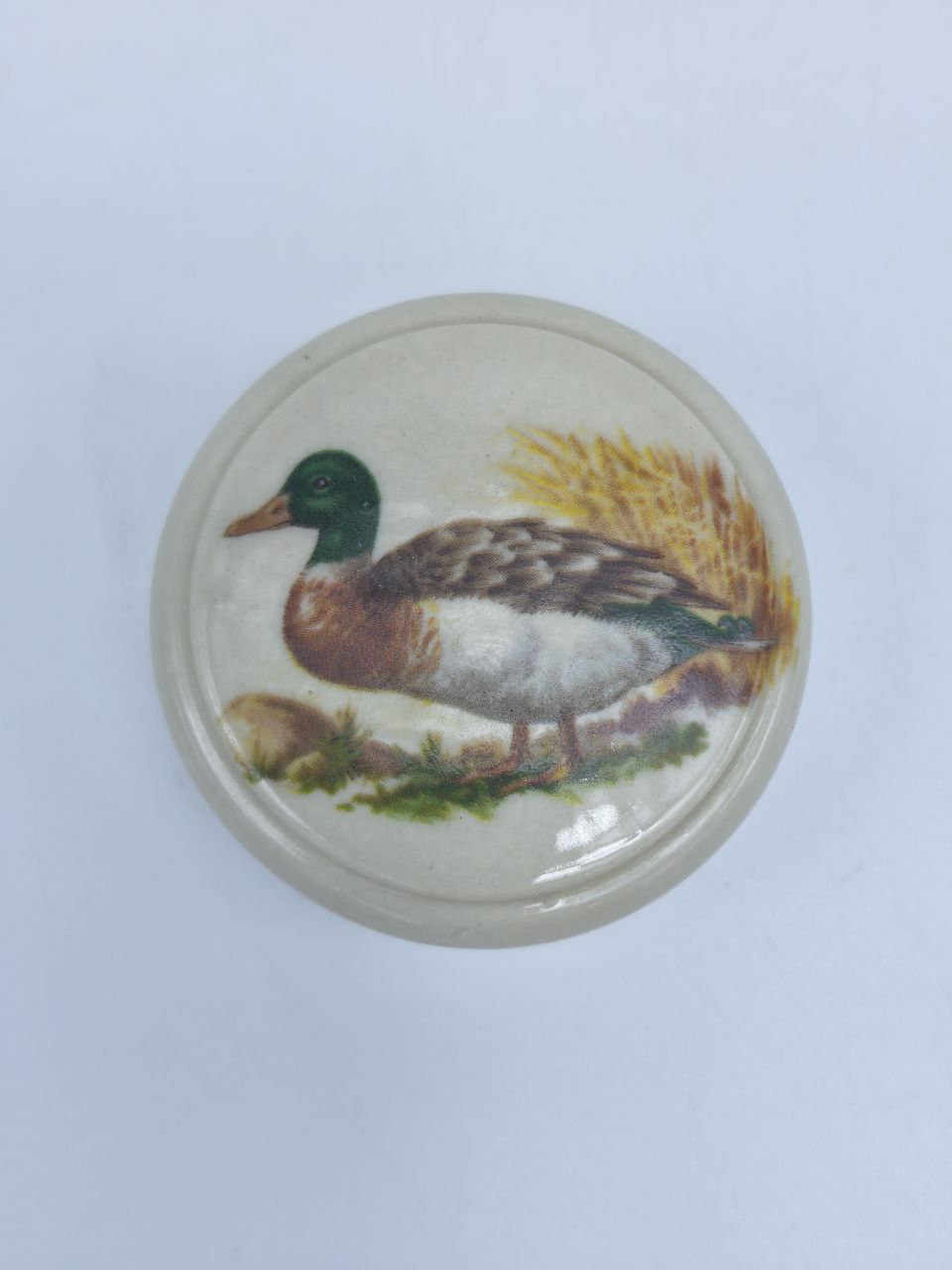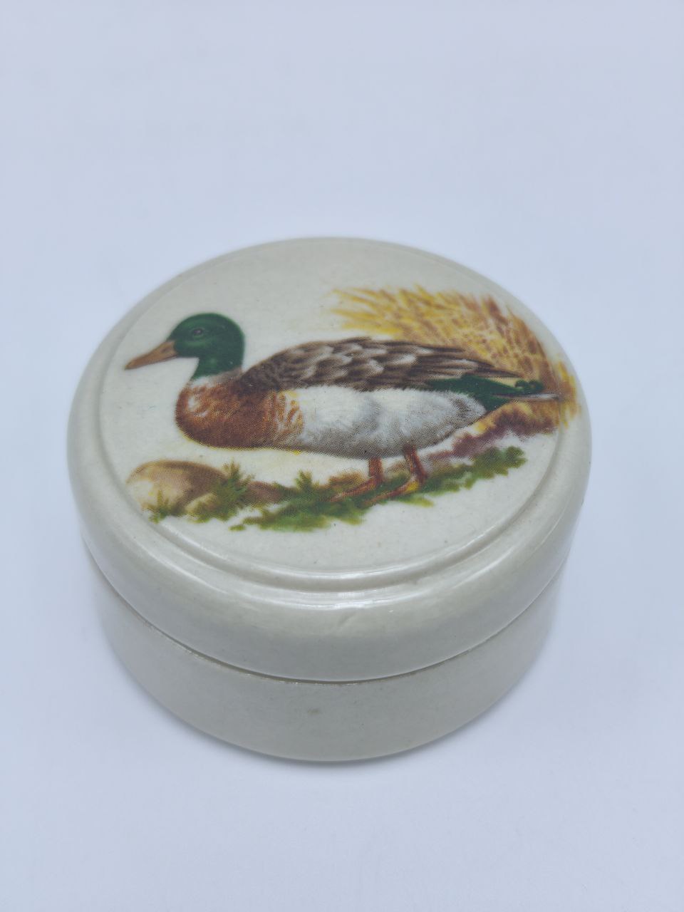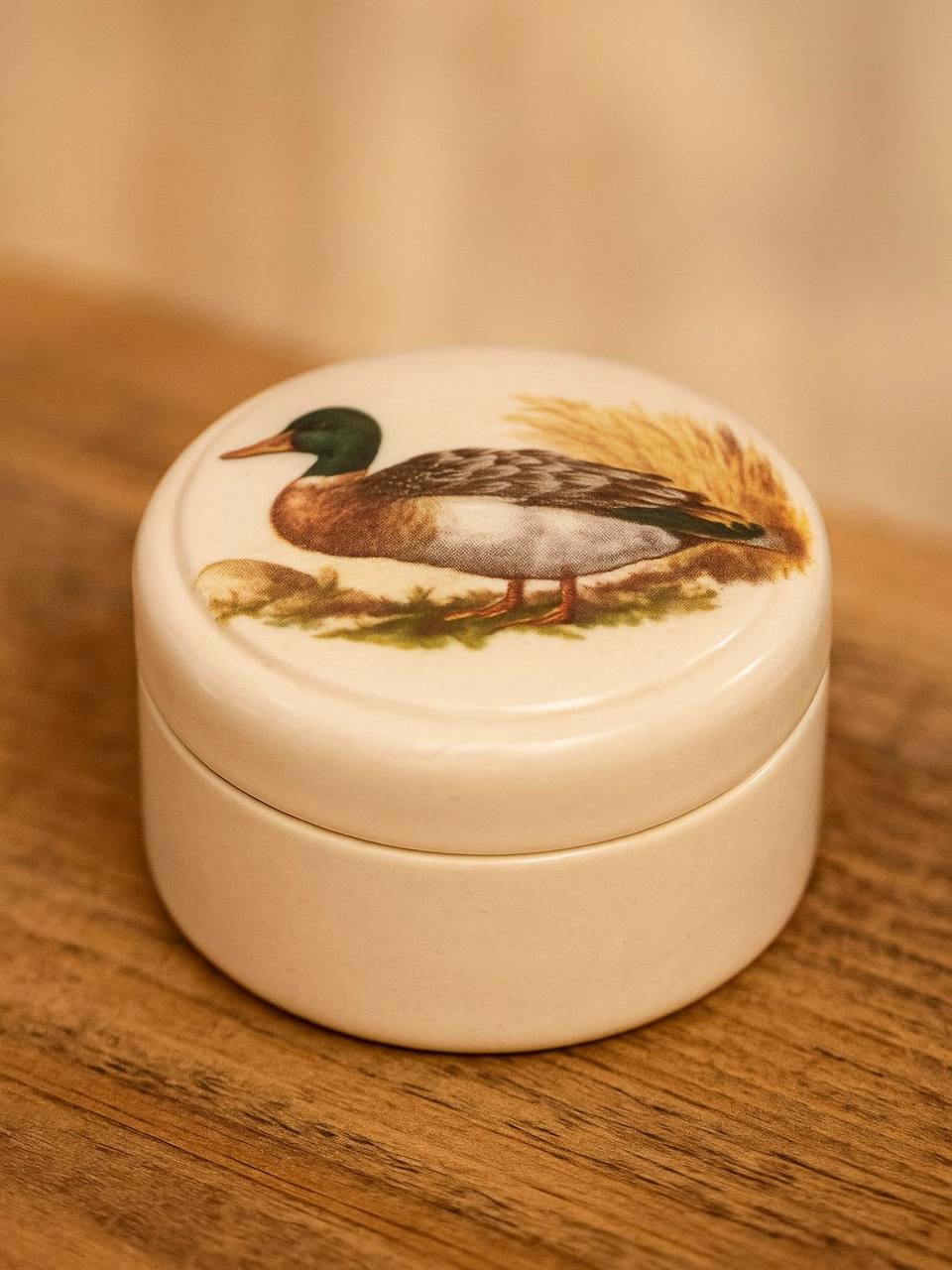 Окунитесь в мир утонченной красоты и изяществ с нашей винтажной фарфоровой шкатулкой, декорированной изображением дикой утки. Этот уникальный предмет станет жемчужиной вашей коллекции и подчеркнет изысканный вкус своего владельца. Сделанная из высококачественного фарфора, шкатулка отличается замечательной белизной и гладкой поверхностью, что сохраняет ее в превосходном состоянии и подчеркивает благородство материала.На крышке шкатулки красуется великолепное изображение дикой утки, выполненное с особым вниманием к деталям. Естественные оттенки передают всю красоту природы, а техника нанесения рисунка обеспечивает его долговечность. Утка — символ свободы и природной гармонии. Этот элемент декора будет вызывать в вашем доме атмосферу спокойствия и умиротворения, напоминая о тихих, романтичных уголках природы.Размеры шкатулки оптимальны для хранения различных мелочей, будь то украшения, ключи или небольшие сувениры. Она может стать отличным подарком для ценителей антиквариата и коллекционеров, принеся с собой частичку истории и обладая уникальным шармом. К тому же, такие изделия всегда пользуются большим спросом на антикварных выставках и аукционах, что делает их выгодной инвестицией.Фарфоровая шкатулка «Дикой утки шепот» — это не просто функциональный объект, но и настоящее произведение искусства, способное преобразить пространство и добавить в него неповторимый стиль. Она легко интегрируется в любой интерьер, будь то классика или современный дизайн, и становится отличным акцентом, притягивающим взгляды.Не упустите возможность приобрести этот винтажный шедевр, который будет радовать вас своим великолепием долгие годы. Насладитесь истинным искусством и побалуйте себя элегантным подарком, который станет важной частью вашей коллекции.