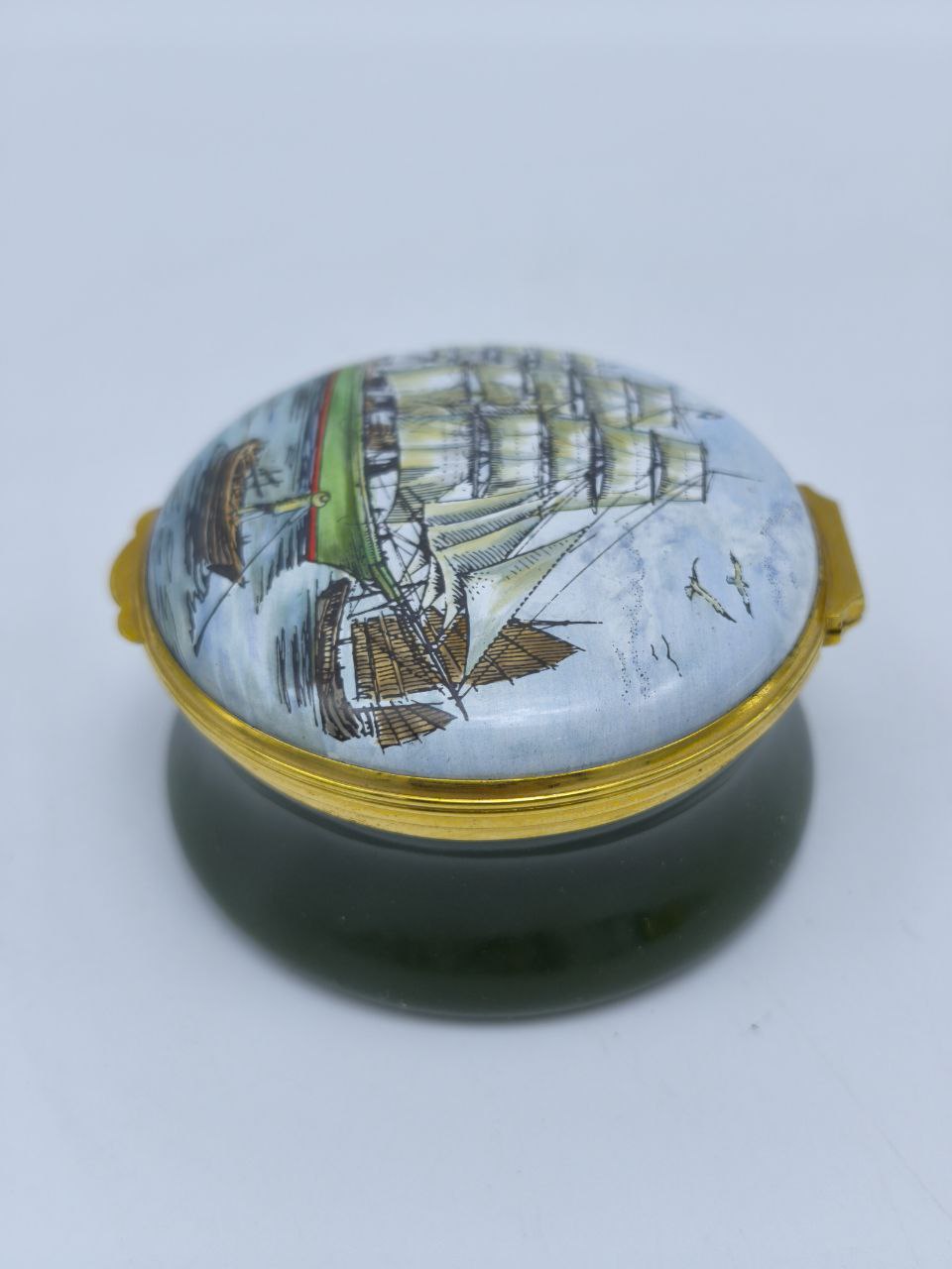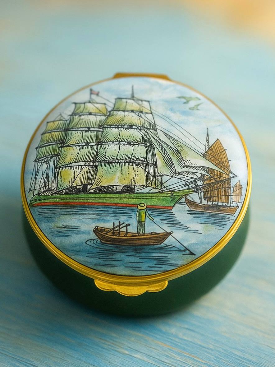Откройте для себя прелести морских приключений с винтажной фарфоровой шкатулкой, украшенной изображением парусника, которая станет настоящим произведением искусства в вашем доме. Сочетание высокого качества исполнения и изысканного дизайна делает эту шкатулку идеальным выбором для тех, кто ценит антиквариат и морскую тематику.Шкатулка выполнена из высококачественного фарфора с ярким и детализированным изображением парусников, которые наполняют душу романтикой морских путешествий. Прекрасно переданные плавные линии и оттенки кисти мастера создают ощущение движения, словно корабли вот-вот уплывут за горизонт, а вокруг царит атмосферный морской простор. Такое художественное оформление подчеркивает не только техническое мастерство, но и творческое видение создателя.Обрамленная тонким золотым ободком, шкатулка излучает утонченную элегантность и добавляет нотку роскоши, которая подчеркнет глубину и многослойность ее символов. Золотое обрамление великолепно сочетается с цветами на крышке, усиливая акценты росписи и делая изделие визуально наиболее привлекательным.Эта шкатулка не только красивая, но и функциональная. Она прекрасно подойдет для хранения украшений, памятных вещиц, или может стать необычным хранилищем для важных записей и заметок. Изделие прекрасно впишется в любой интерьер, сохраняя свою исключительную привлекательность, будь то классический стиль, современная эклектика или винтажное оформление.Винтажная фарфоровая шкатулка с морским мотивом будет отличным подарком для тех, кто любит путешествия и обладает признанием к историческим сюжетом. Выбирая ее в подарок, вы дарите не просто вещь, но и частичку истории, которая вдохновит на мечты о дальних горизонтах.Став владельцем этой шкатулки, вы получаете не только декоративный предмет, но и ценное антикварное изделие, которое сохранит свою значимость и коллекционную ценность на долгие годы. Это идеальный объект для того, чтобы инвестировать в будущее и сохранить часть культурного наследия для последующих поколений.
