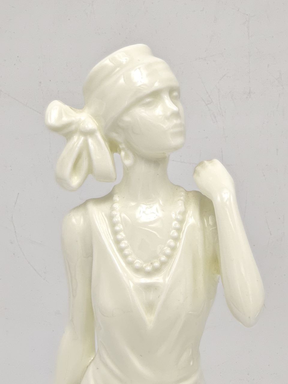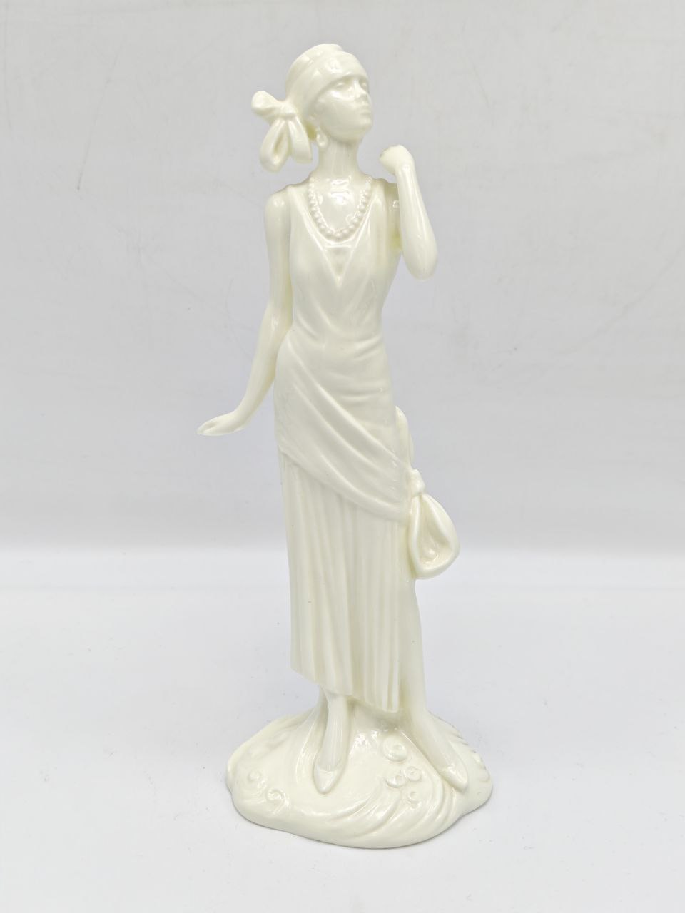 Эта фарфоровая статуэтка олицетворяет утонченную элегантность и стиль прошлых эпох. Изготовленная в стиле “ар-деко”, она представляет собой фигурку дамы в изящном платье с драпировками и аксессуарами, характерными для начала 20 века. Особое внимание привлекают подробности: изысканное ожерелье, аккуратно уложенные волосы с элегантным бантом и тонкий шарм каждой линии и изгиба. Статуэтка выполнена из высококачественного фарфора благородного молочного цвета, что придаёт ей особую утончённость и нежность. Эта фигурка будет прекрасно смотреться как на полке в гостиной, так и в спальне на туалетном столике, добавляя вашему интерьеру уникальность и роскошь.