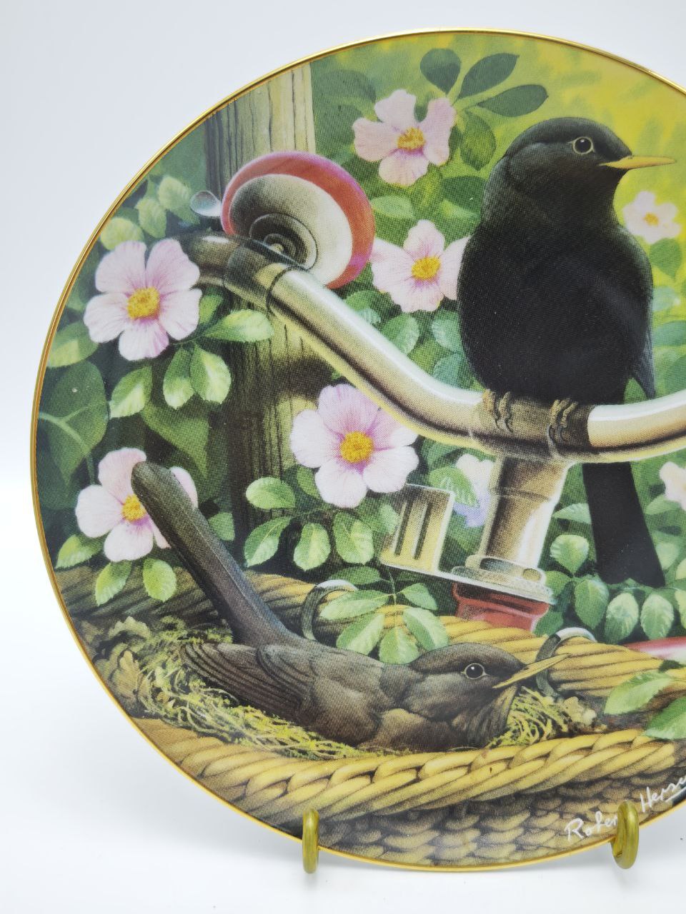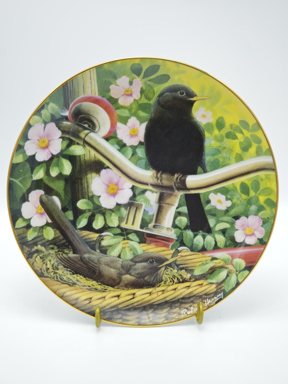 Эксклюзив из легендарной серии «Hidden Treasures» Тарелка 1980 года от американского бренда Denbary Mint — настоящий шедевр ручной работы. Авторский деколь Robert Harvey с птицами на велосипедных рулях и золотым ободком передает атмосферу романтики и ностальгии. Каждая деталь — от нежных цветов фона до тонкой позолоты по краю — подчеркивает уникальность этого коллекционного артефакта.