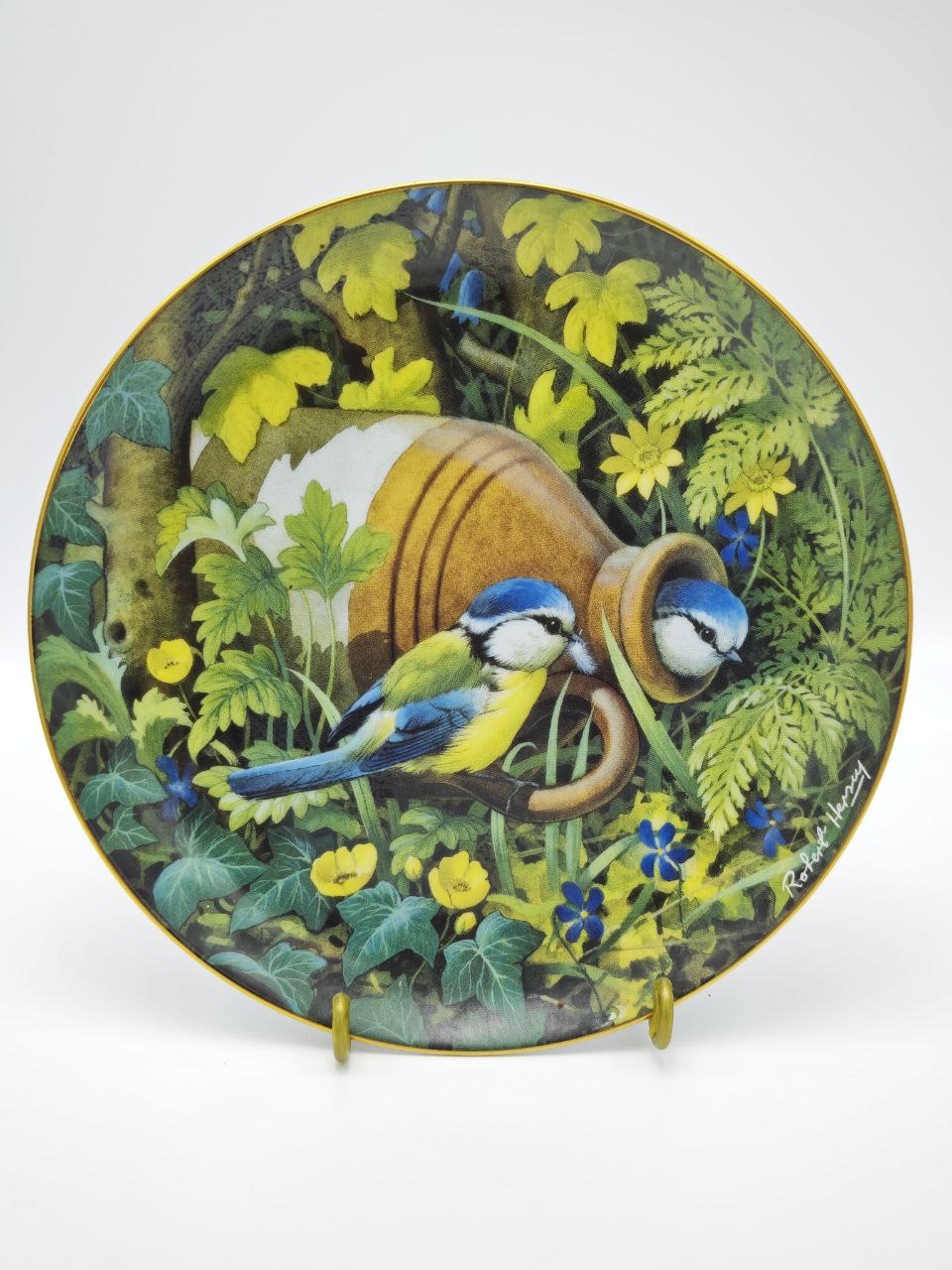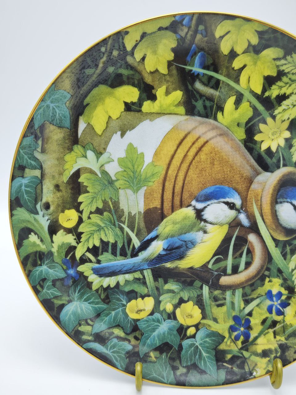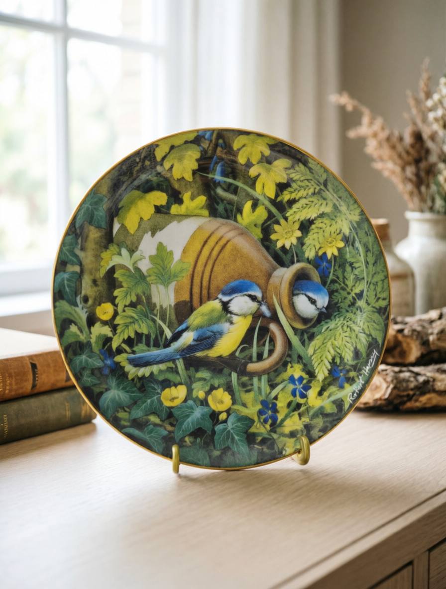 Эксклюзив из легендарной серии «Hidden Treasures» Тарелка 1980 года от американского бренда Denbary Mint — настоящий шедевр ручной работы. Авторский деколь Robert Harvey с птицами у кувшина в окружении зелени и цветов, дополненный золотым ободком, передает атмосферу уюта и домашнего тепла. Каждая деталь — от нежных оттенков листвы до тонкой позолоты по краю — подчеркивает уникальность этого коллекционного артефакта.