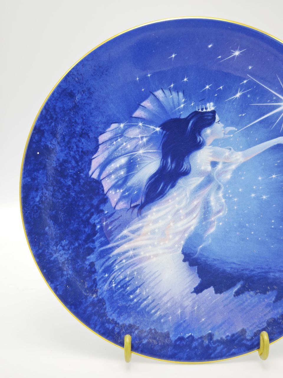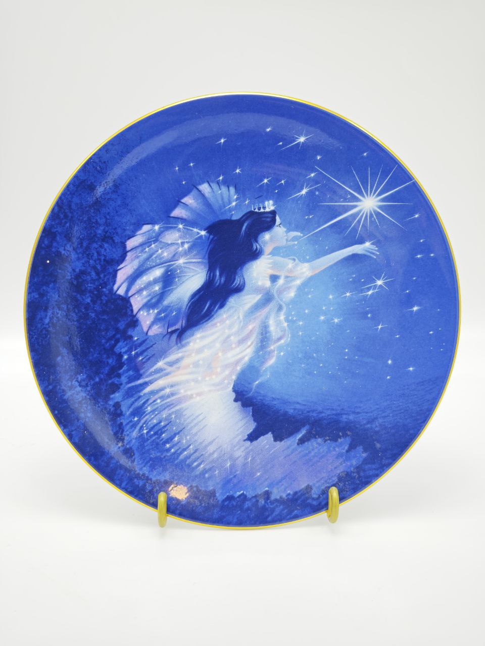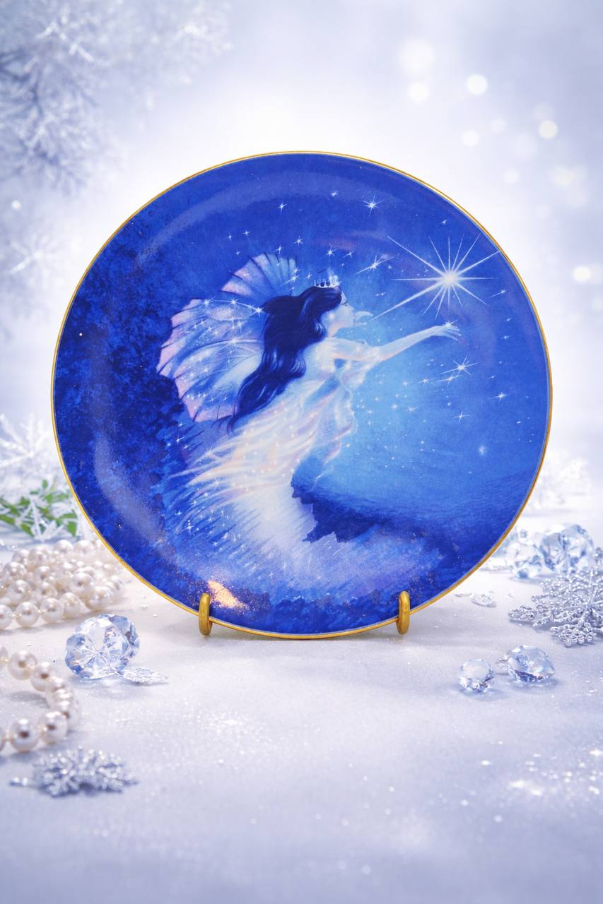 Эксклюзив от легендарного бренда Royal Worcester. Тарелка 1990 года от английского бренда Royal Worcester (основан в 1751 году) — настоящий шедевр декоративного фарфора. Деколь «The Diamond Fairy» с сказочным образом феи, звездами и позолоченным ободком создает атмосферу волшебства. Каждая деталь — от глубоких оттенков синего фона до тонкой позолоты по краю — подчеркивает высокое качество печати и отделки.