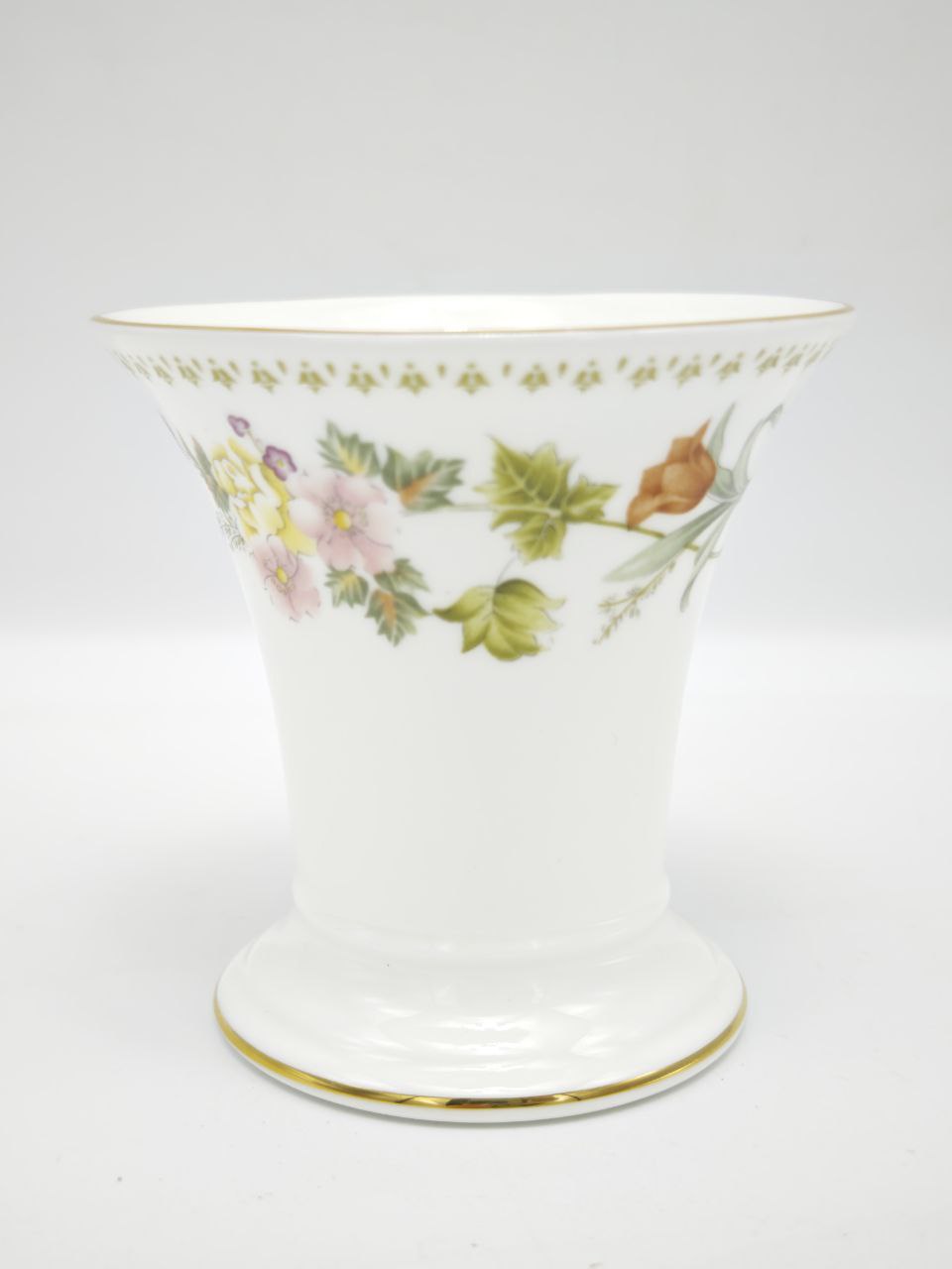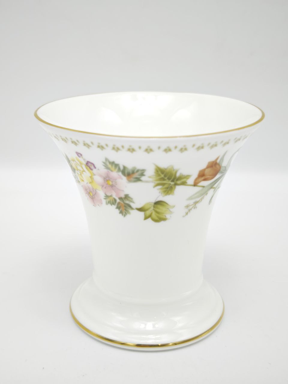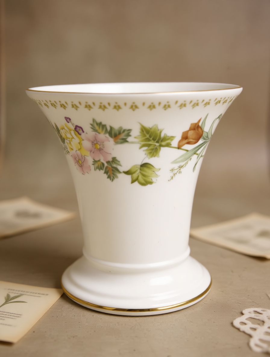 Представляем вашему вниманию редкую и изысканную винтажную вазу от легендарного бренда Wedgwood, коллекция “Mirabelle”. Это не просто предмет интерьера, а настоящий шедевр декоративно-прикладного искусства, созданный в Англии из высококачественного костяного фарфора. Белоснежный фон, элегантная форма и нежная цветочная роспись делают эту вазу поистине уникальным предметом, способным украсить любой интерьер.Коллекция “Mirabelle” — это гимн весенней свежести и нежности. На поверхности вазы изящно раскинулись веточки с нежными розовыми, желтыми и фиолетовыми цветами, зелеными листьями и спелыми плодами. Каждый элемент росписи выполнен в технике деколь — это означает, что рисунок наносится с помощью специальной бумаги и затем обжигается, что гарантирует его долговечность и насыщенность цвета. Дизайн передает ощущение свежести, легкости и естественной красоты, словно вы только что сорвали цветок с грядки.Форма вазы элегантна и функциональна: широкое горло позволяет размещать как одиночные ветки, так и целые букеты, а устойчивое основание обеспечивает надежность. Тонкая золотая кайма по краю горла и основания добавляет изделию шика и завершенности, подчеркивая его статус и роскошь. На оборотной стороне вазы вы найдете официальную маркировку: логотип Wedgwood, надпись «Bone China», страну производства «MADE IN ENGLAND» и название коллекции «MIRABELLE». Также присутствует цифра «44», которая может указывать на номер модели или партии. Это подтверждает подлинность изделия и его принадлежность к легендарному бренду. Ваза выпущена в 1980-х годах, что делает ее ценным предметом винтажа, который со временем только растет в стоимости.Такая ваза станет идеальным акцентом в интерьере в стиле прованс, шебби-шик, классика или даже в современном минимализме. Она прекрасно смотрится на каминной полке, книжном шкафу, журнальном столике или обеденном столе. Это также превосходный подарок для ценительницы красоты, любительницы цветов или поклонницы английского стиля. Такой предмет не просто украшает дом, он создает атмосферу уюта, гармонии и эстетического наслаждения.Состояние вазы отличное, без сколов и трещин. Это единственный экземпляр — не упустите возможность приобрести редкий и красивый предмет винтажного дизайна от одного из самых уважаемых брендов в мире фарфора.