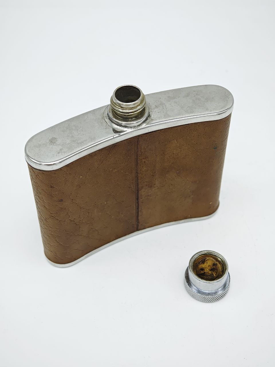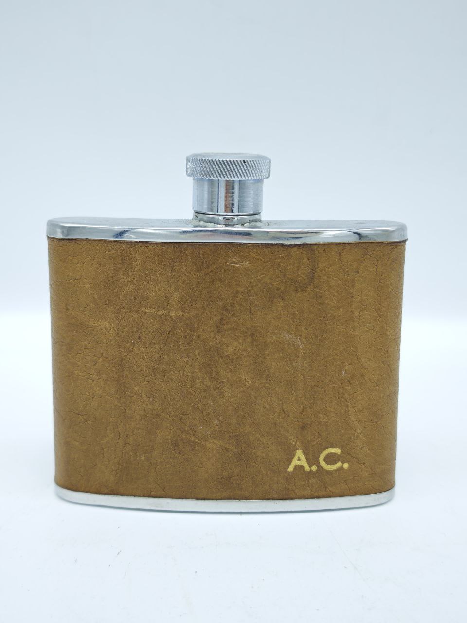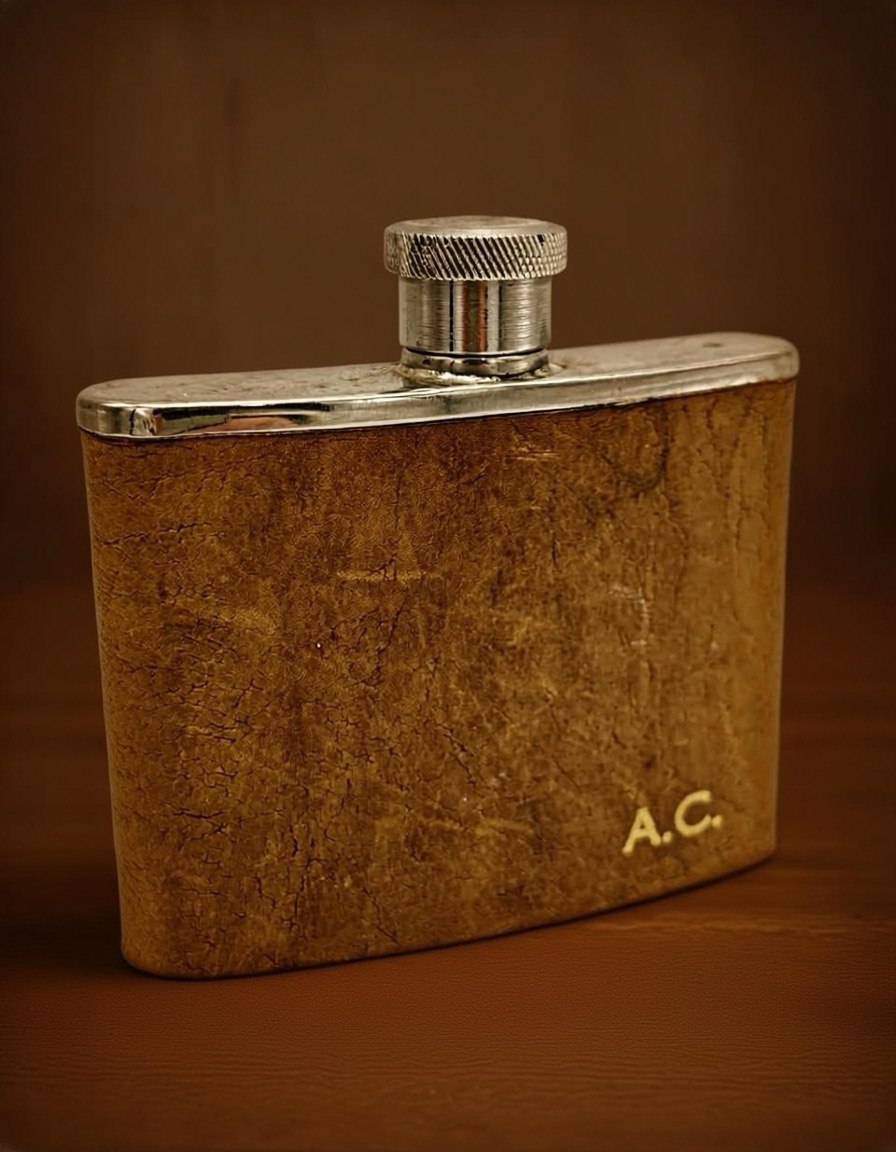 Представляем вашему вниманию редкую и по-настоящему стильную винтажную фляжку, созданную в Англии — стране, где традиции качества и мастерства передаются из поколения в поколение. Эта фляжка — не просто сосуд для напитков, а настоящий артефакт эпохи, воплощающий дух классического британского дизайна и безупречного исполнения.Изготовлена из высококачественной нержавеющей стали, она обладает исключительной прочностью и устойчивостью к коррозии, что гарантирует её долговечность даже при интенсивном использовании. Внутренняя поверхность гладкая и легко очищается, сохраняя чистоту вкуса вашего любимого напитка. Объем фляжки составляет 120 мл (что соответствует 4 унциям, как указано на дне), что идеально подходит для переноса порции виски, коньяка или другого крепкого алкоголя в дорогу, на охоту, рыбалку или просто в качестве аксессуара для вечеринки.Внешний вид фляжки подчеркивает её винтажный характер: корпус обтянут натуральной кожей теплого золотисто-коричневого оттенка с характерной текстурой, которая со временем приобретает еще более глубокий и благородный вид. Кожа не только защищает металл от царапин и ударов, но и обеспечивает удобный и надежный хват. На лицевой стороне фляжки выполнена золотая гравировка инициалов «A.C.», что делает её уникальным предметом, возможно, когда-то принадлежавшим конкретному человеку. Это добавляет ей исторической ценности и превращает в персонализированный подарок.Крышка фляжки — это отдельное произведение инженерной мысли: металлическая, с рифленым венчиком для удобного закручивания, она герметично закрывается, предотвращая протекание. Дизайн фляжки лаконичен, но выразителен — сочетание блестящей стали и матовой кожи создает контраст, который оценят любители ретро-стиля и классики.Эта фляжка — идеальный выбор для тех, кто ценит качество, историю и индивидуальность. Она станет отличным подарком для мужчины, увлекающегося коллекционированием винтажных вещей, для путешественника, для охотника или просто для человека, который хочет иметь при себе нечто особенное. Фляжка не только функциональна, но и является стильным аксессуаром, который можно с гордостью показать друзьям.Не упустите шанс обзавестись этим редким экземпляром — каждый элемент этой фляжки рассказывает историю, которую вы можете продолжить.