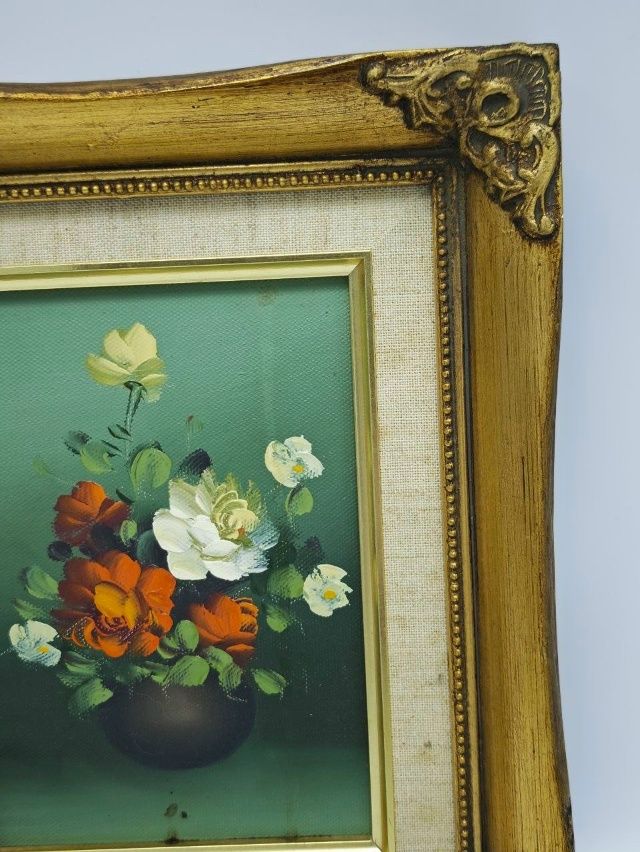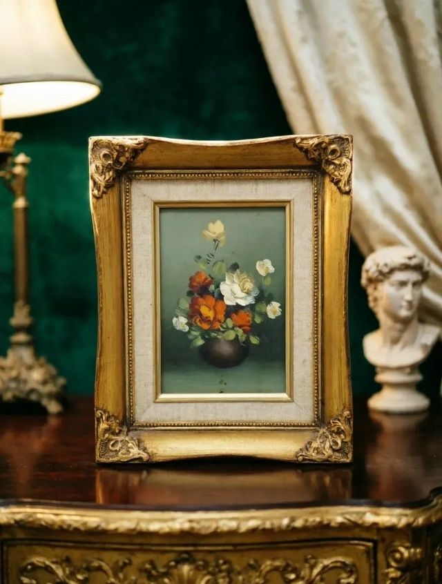 Картина оформлена в элегантной винтажной раме из дерева с позолотой, характерной для европейского багетного искусства середины-конца прошлого века. Золотая отделка рамы создаёт благородную оправу для живописного полотна, подчёркивая художественную ценность произведения.