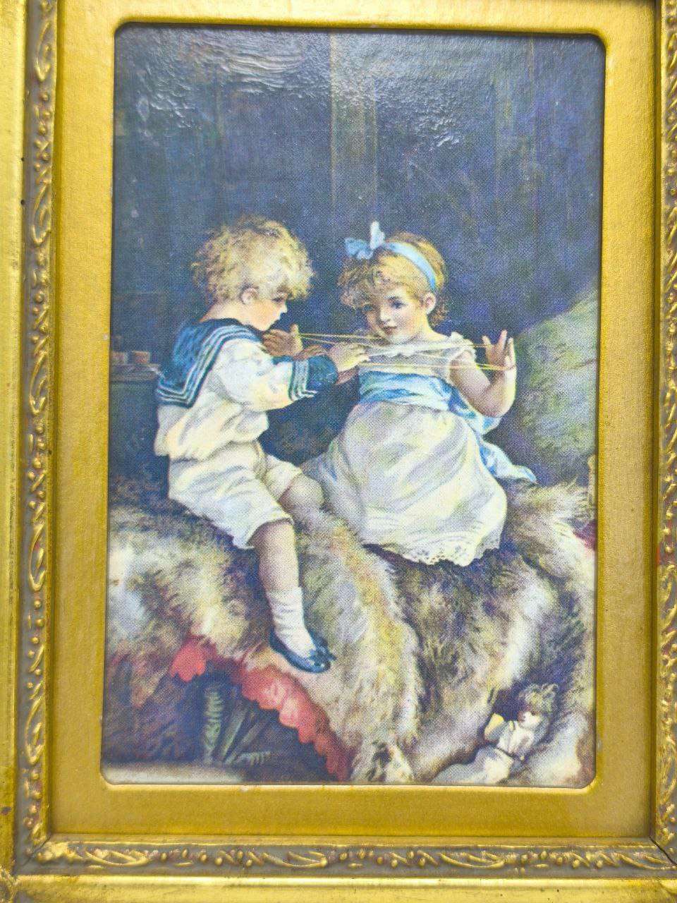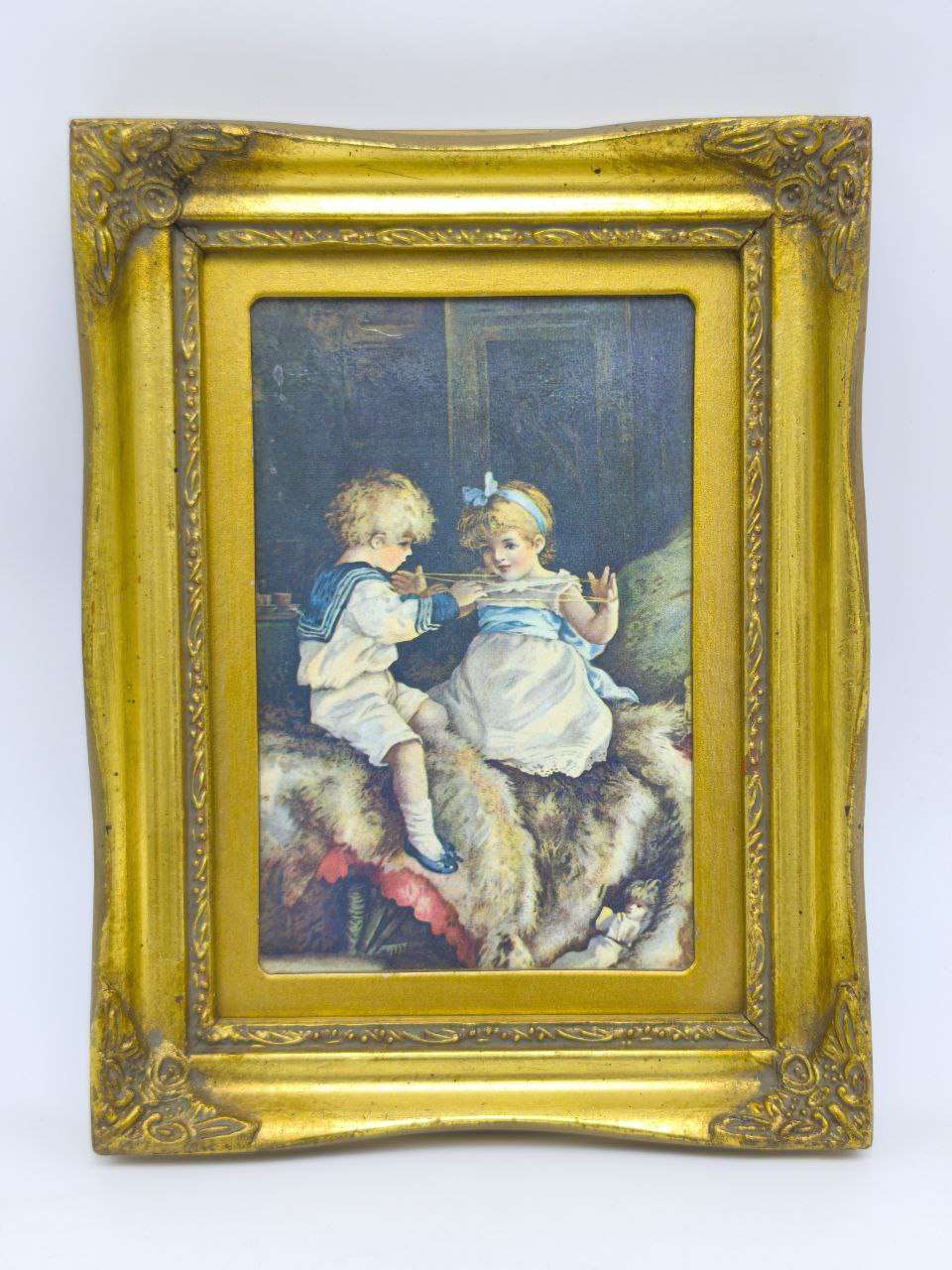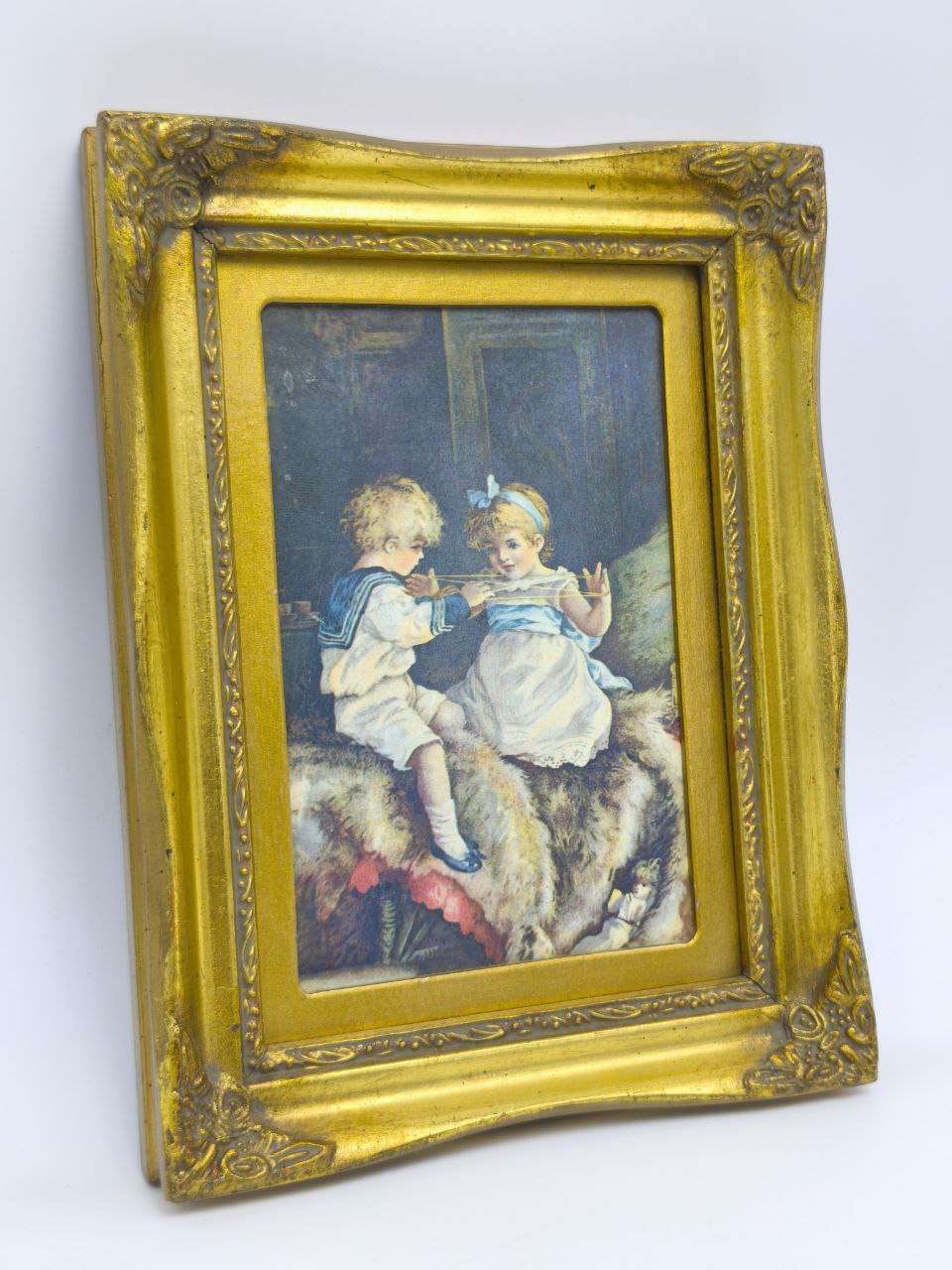 Представляем вашему вниманию изысканный камерный фрагмент истории — винтажную картину-печать, выполненную во второй половине 20 века. Это произведение, наполненное нежностью и теплом, олицетворяет прелесть детства и семейных ценностей. Изображение представляет собой сцену из детской жизни: милые дети, запечатленные в момент игры, демонстрируют яркие и пронзительные эмоции, которые присущи только детству. Каждая деталь этого сюжета дышит любовью, заботой и искренней привязанностью.Пастельные тона, которыми выполнена печать, добавляют картине нежности и легкости. Мягкие оттенки одеяний детей гармонично сочетаются с теплым фоном, создав эффект погружения в старинную сказку. Портретный стиль и окружающая сцену обстановка позволяют почувствовать атмосферу комнатного тепла и уюта, где каждый объект на своем месте дарит тепло и безопасность небольшому мирку детства.Картина обрамлена в великолепную деревянную рамку с золочением. Украшенная изящными узорами, она подчеркивает художественную ценность произведения, добавляя ему статусности и утонченности. Такая рама акцентирует внимание на грациозности и элегантности визуального сюжета, идеально подходя для дома или интерьера, который следует традициям классицизма и витражного искусства.Эта картина станет восхитительным акцентом в любом интерьере, добавляя вам уникальности семейных традиций и стараний. Она подходит как изысканное дополнение к гостиной, детской или кабинету, напоминая о важных моментах детства и вечных ценностях. Картину оценят люди, стремящиеся заполнить свое пространство теплом и заботой, особенно те, кто ищет элементы, несущие с собой часть прошлого и уют.