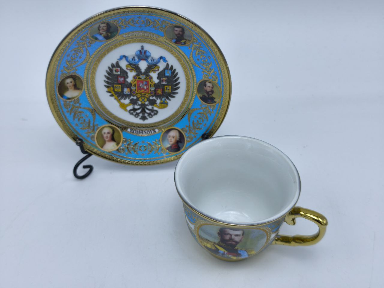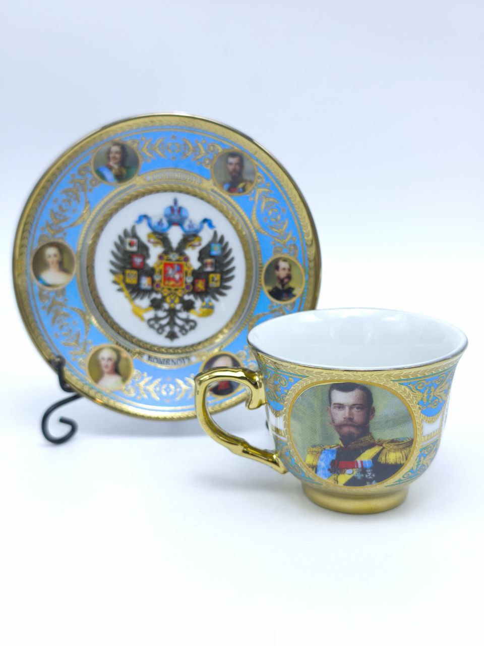 Винтажная коллекционная фарфоровая чашка с блюдцем «Императорская Россия», декорированная позолотой и гербом Российской империи, изображение Николая II