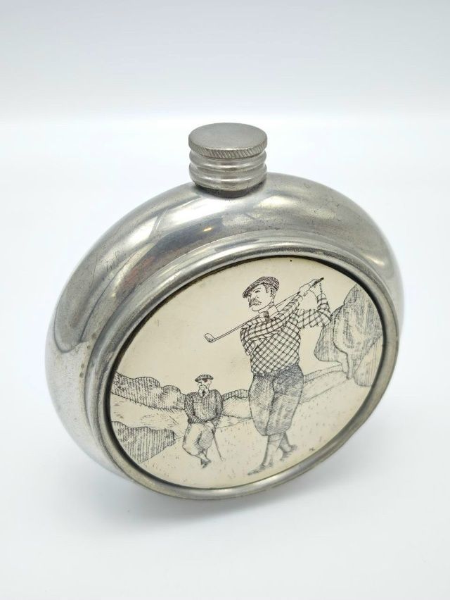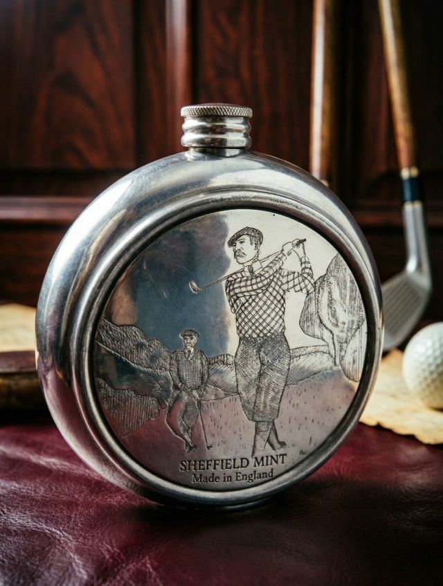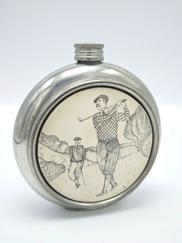 Элегантная винтажная фляжка от легендарной английской мануфактуры Sheffield Mint. Тематический дизайн «Golf» (Гольф) с рельефным изображением на корпусе.
