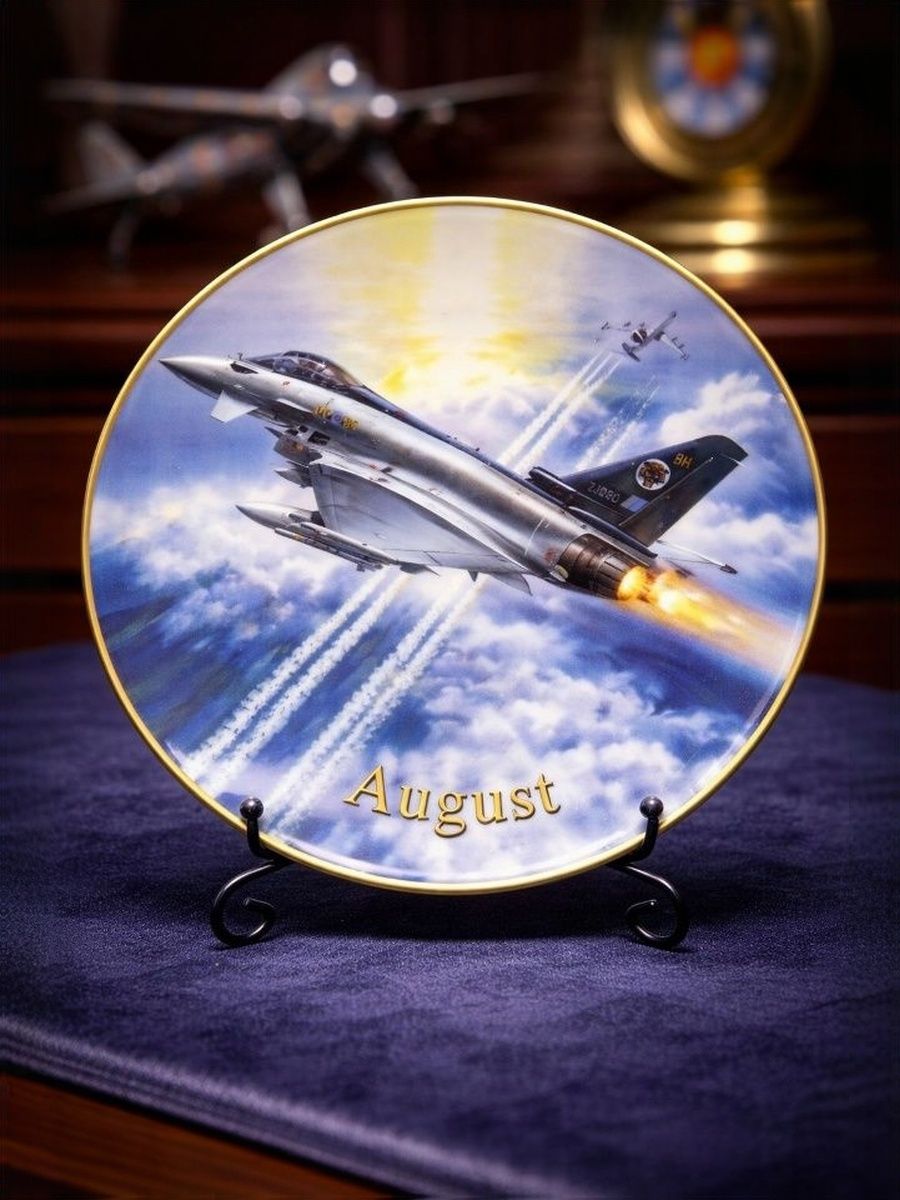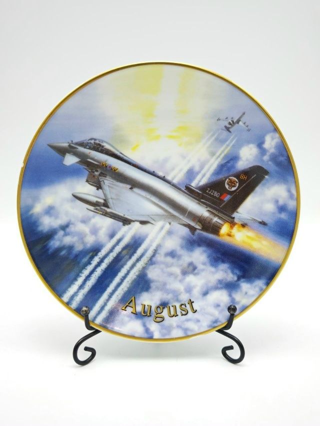 Подлинная винтажная декоративная тарелка от знаменитой английской мануфактуры Davenport, выпущенная под эгидой The Bradford Exchange. Тема “Август: Команда 21 века” из серии «Крылья славы» посвящена современной военной авиации — изображён многоцелевой истребитель Eurofighter Typhoon.