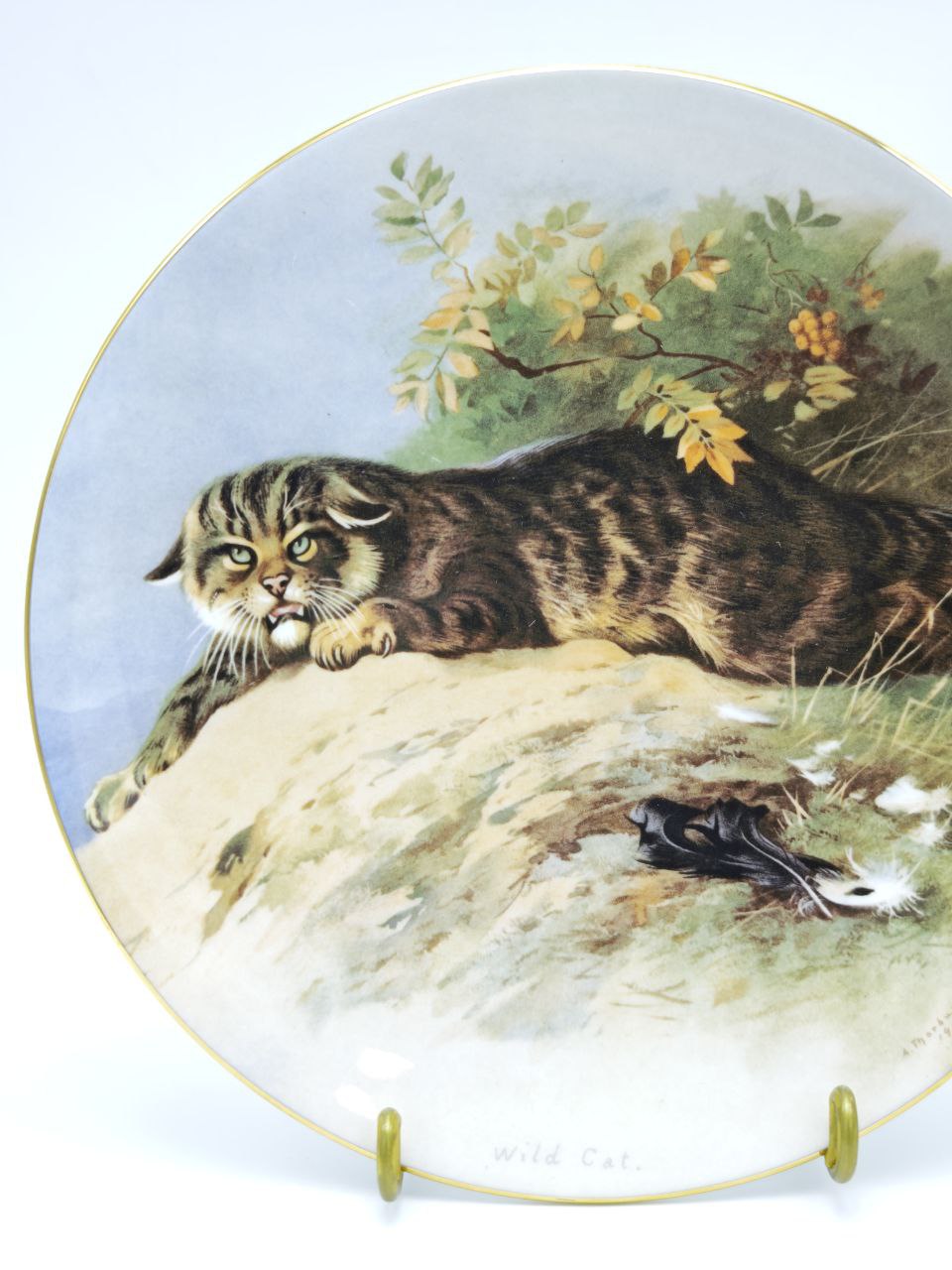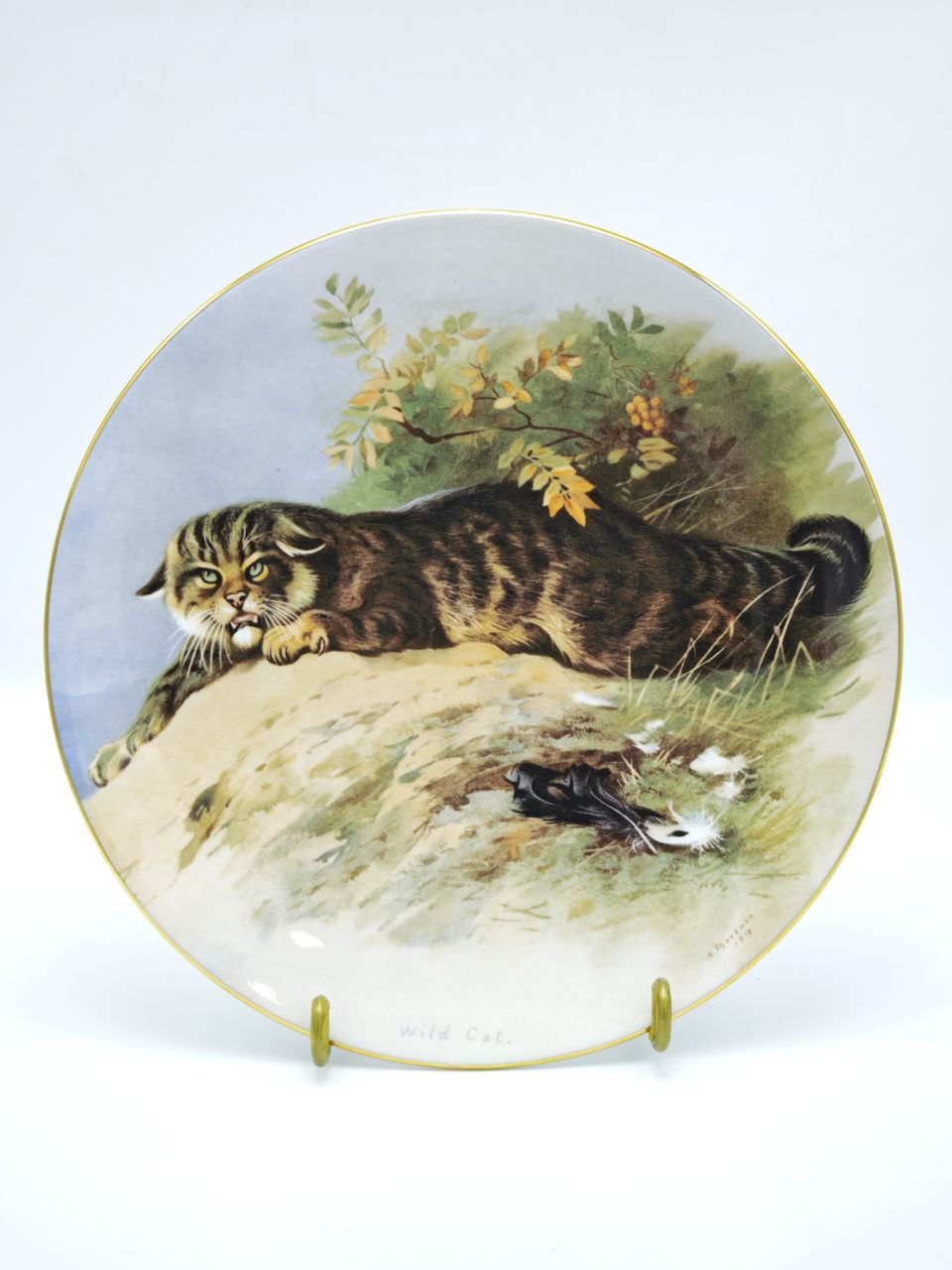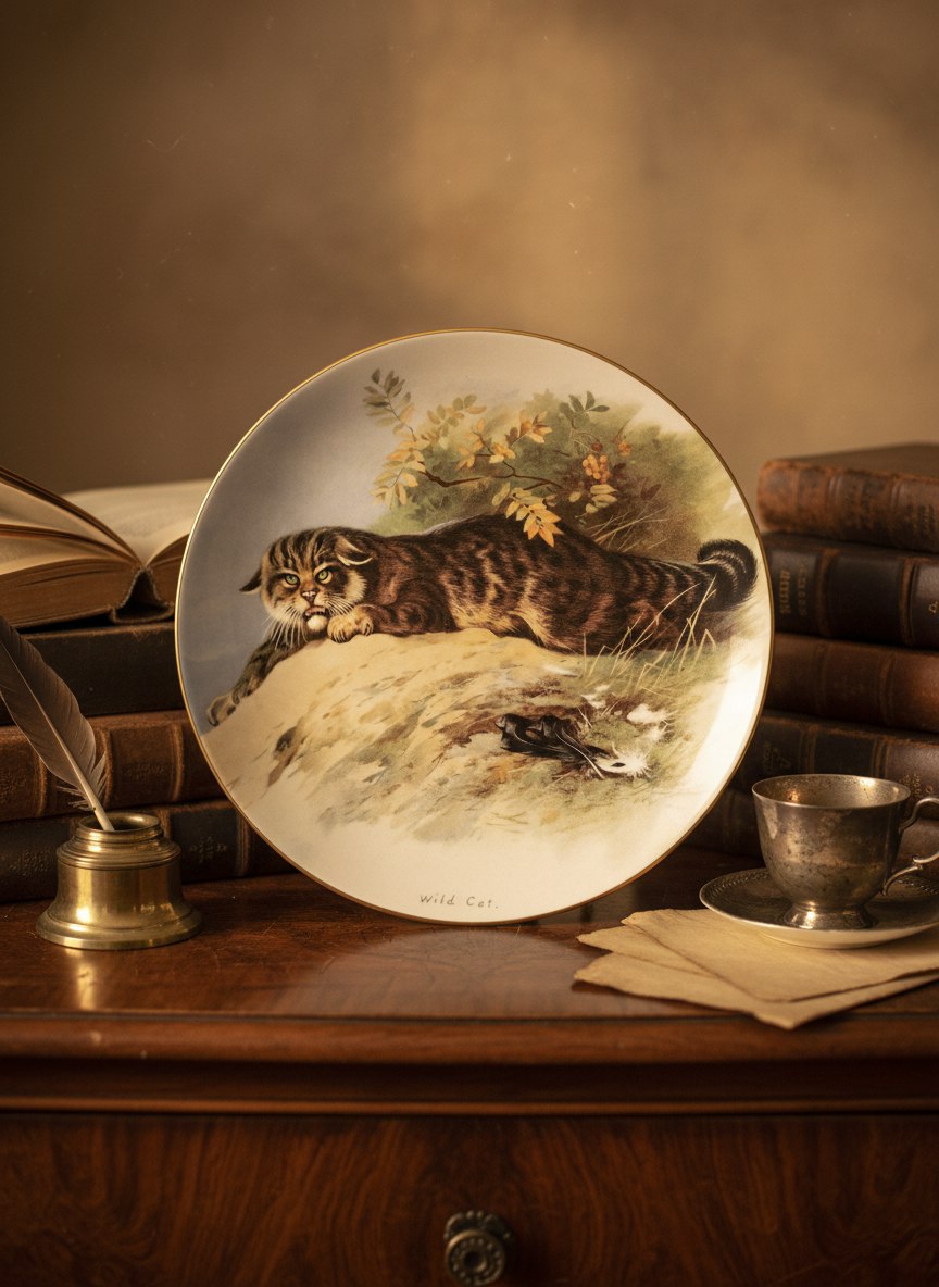 Представляем вашему вниманию настоящий шедевр британского фарфорового искусства — винтажную коллекционную тарелку от легендарной марки Royal Worcester. Это не просто предмет интерьера, а кусочек истории, объединяющий в себе мастерство художника, качество английской керамики и престиж музея мирового значения.Центральным элементом композиции является живописный образ дикой кошки, созданный по мотивам знаменитой работы Арчибальда Торбурна (Archibald Thorburn, 1860–1935), одного из самых выдающихся британских художников-анималистов своего времени. На этой тарелке его работа «Дикая кошка» (1918) воссоздана с поразительной детализацией: каждая полоска на шерсти, каждый луч света на траве, каждая тень — все передано с любовью и уважением к оригиналу. Изображение нанесено методом деколь — это означает, что рисунок переносится на поверхность фарфора с помощью специальной бумаги, что позволяет добиться высочайшей четкости и глубины цвета, недоступной при ручной росписи.Тарелка изготовлена из тончайшего фарфора Royal Worcester — «Fine Bone China». Этот материал, содержащий костяную золу, славится своей полупрозрачностью, прочностью и благородным белым оттенком, который идеально подчеркивает яркость и насыщенность красок деколя. Край тарелки украшен изящной позолотой, которая придает изделию роскошный и аристократичный вид, делая его достойным украшения любого ценителя искусства или коллекционера.Эта тарелка является частью престижной ограниченной серии «Млекопитающие Торбурна из архивов Музея естественной истории». Она выпущена в 1991 году компанией Compton & Woodhouse Limited по лицензии Royal Worcester и является строго лимитированной — всего было изготовлено лишь 15 000 полных наборов. Наличие номера в серии (хотя он не указан на фото, но должен быть на обороте) делает каждую тарелку уникальной и повышает ее коллекционную ценность. На оборотной стороне вы найдете официальный знак Royal Worcester, печать Британского музея естественной истории и всю информацию о выпуске, что служит гарантией подлинности и исторической значимости изделия.Такая тарелка станет идеальным подарком для ценителей винтажа, любителей природы и искусства, а также отличным акцентом в классическом, прованском или эко-интерьере. Ее можно разместить на стене с помощью специальной подставки, как это показано на фото, или использовать как центральный элемент на комоде или каминной полке. Это не просто украшение — это инвестиция в красоту и историю, предмет, который будет радовать глаз и вызывать восхищение у ваших гостей долгие годы.