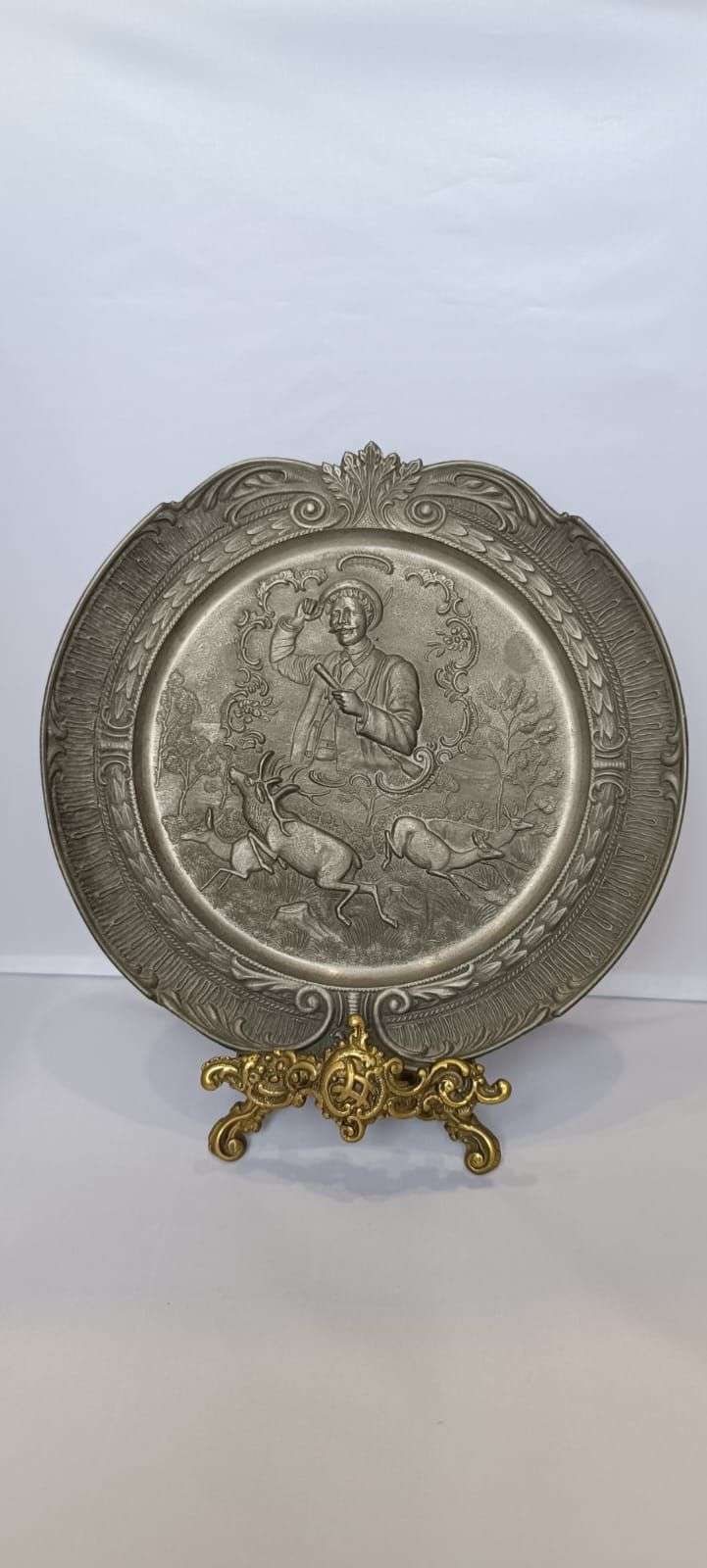 Винтажная настенная оловянная тарелка «Охота». Германия 1980 года.