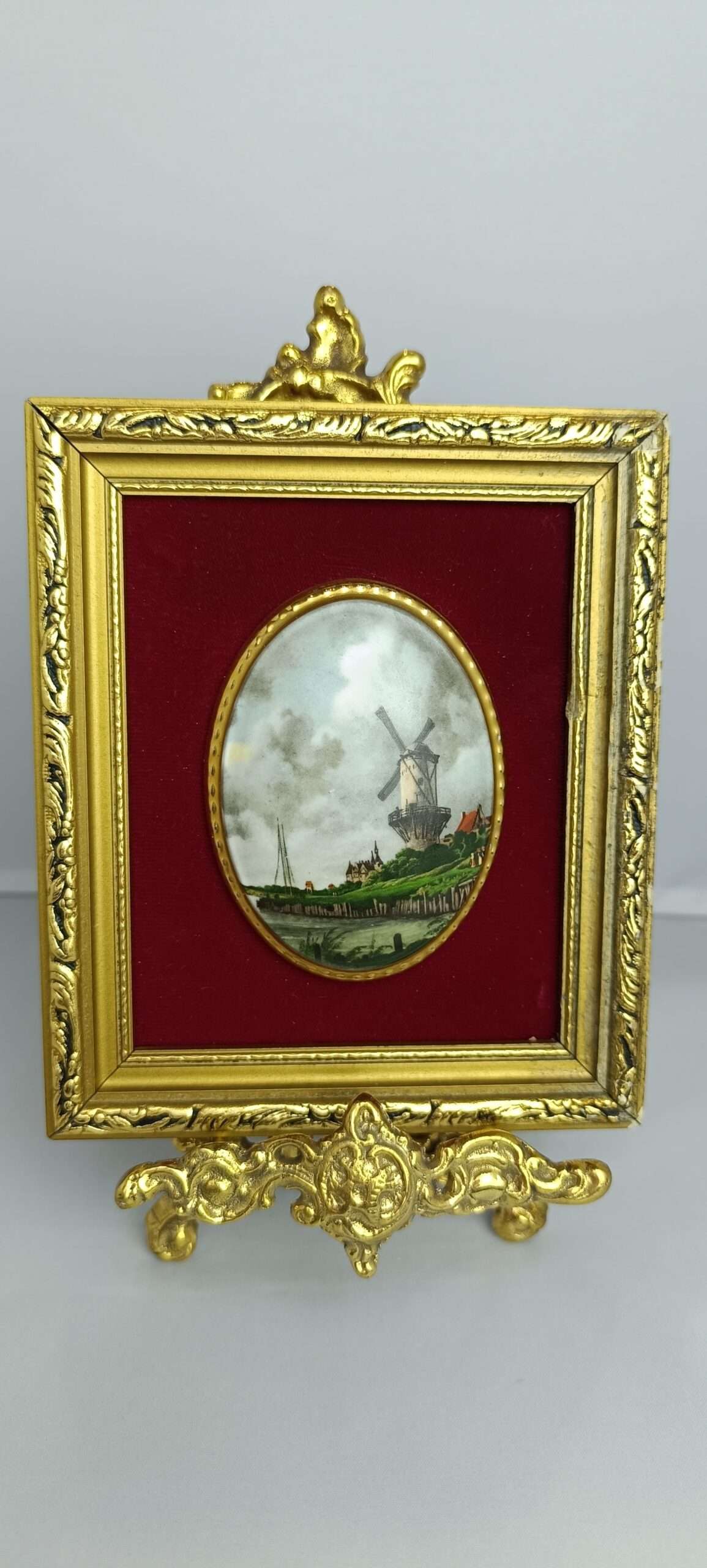 Винтажная Плакетка Миниатюра «Мельница». Подвесная. Фарфор. Деревянная рама. Англия 1980 года.