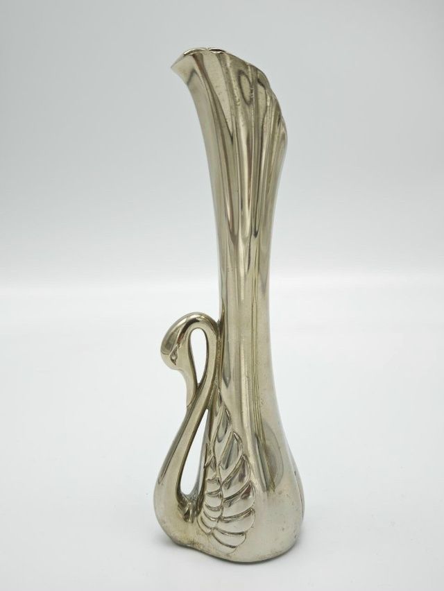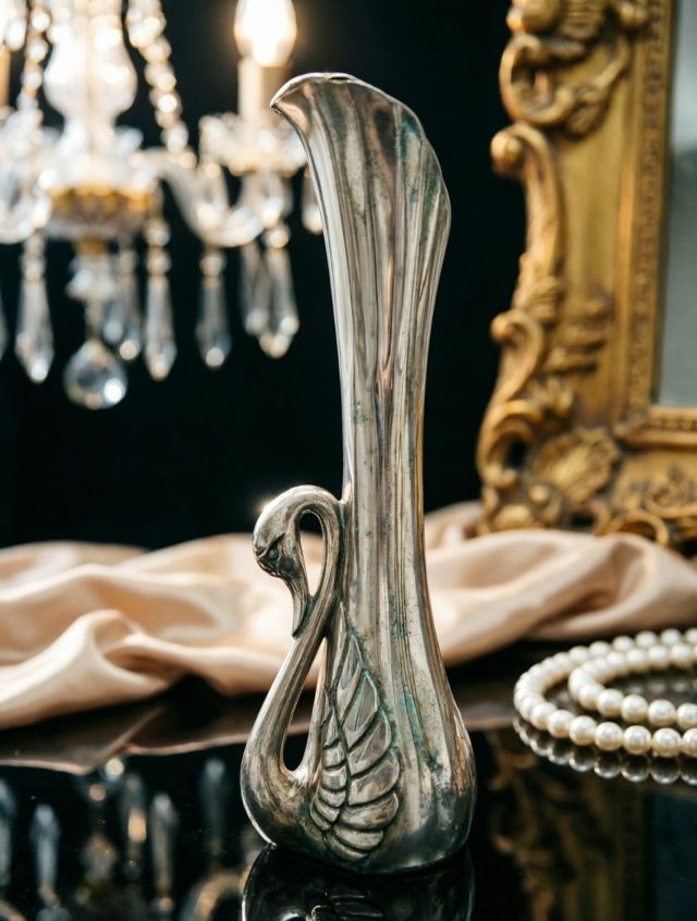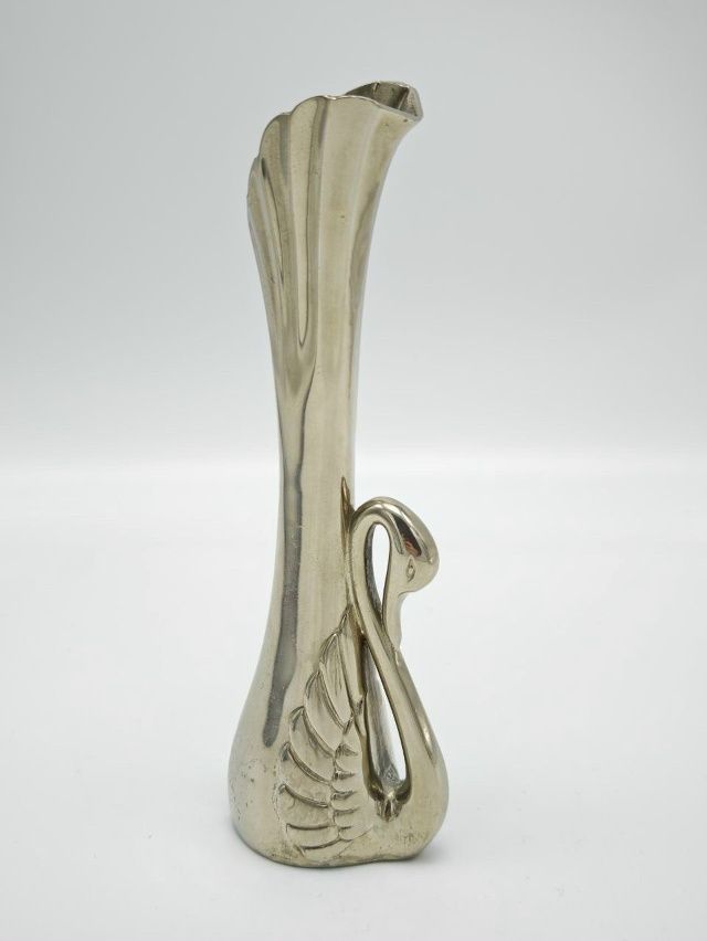 Элегантная винтажная вазочка из металла с посеребрением в форме изящного лебедя — символа грации, чистоты и благородства. Посеребрённая поверхность со временем приобрела благородную патину, придающую изделию особый винтажный шарм и глубину.